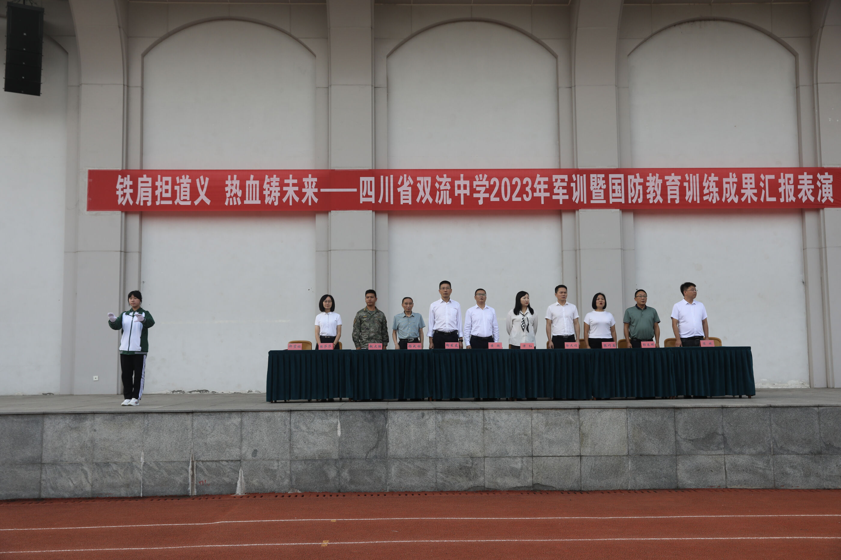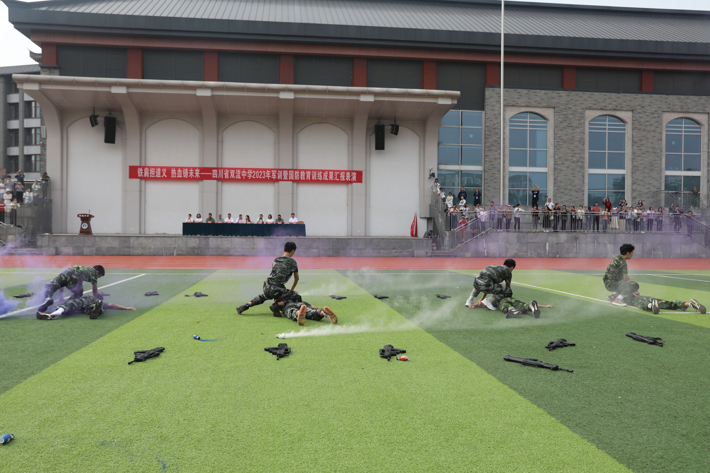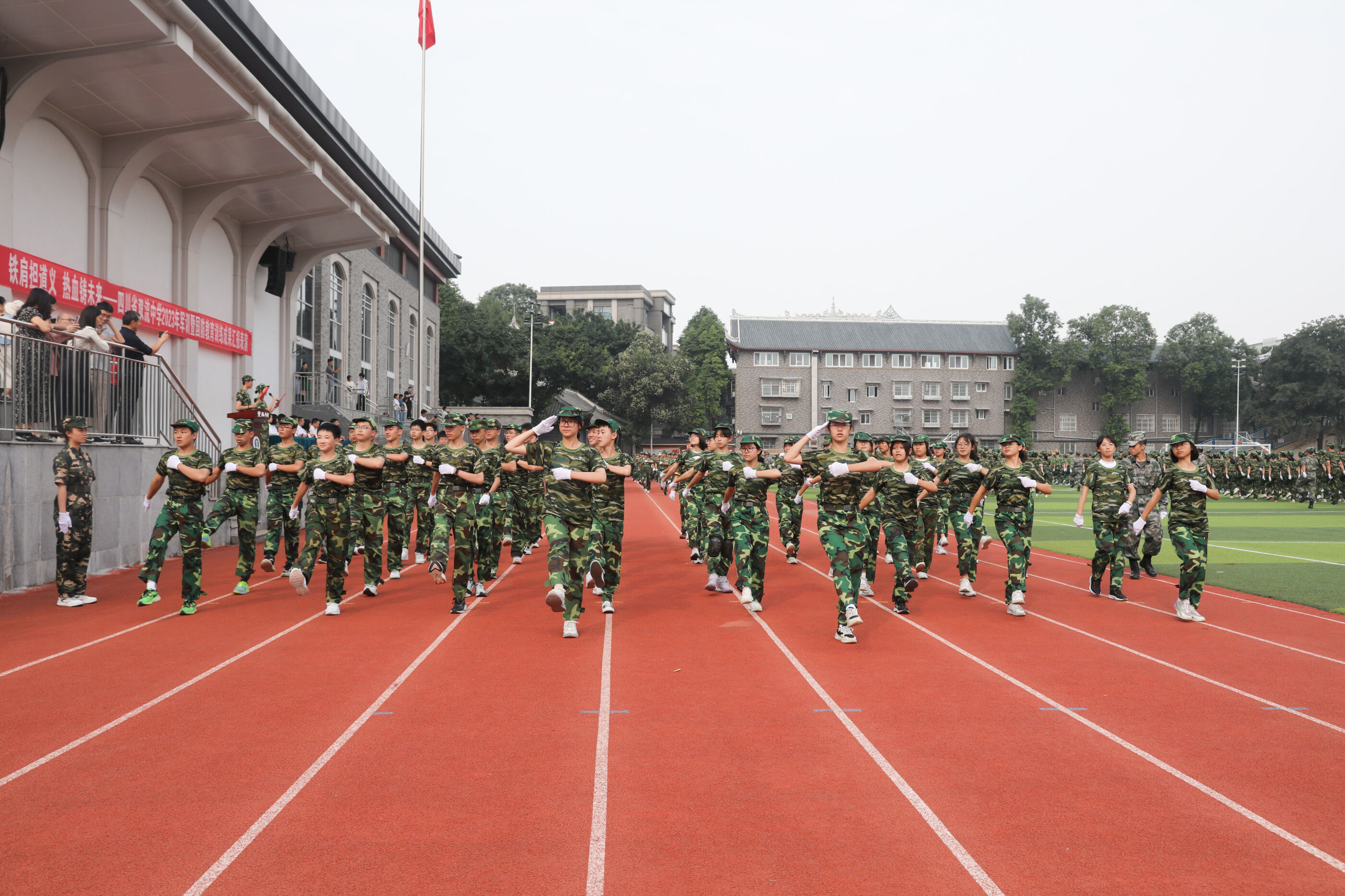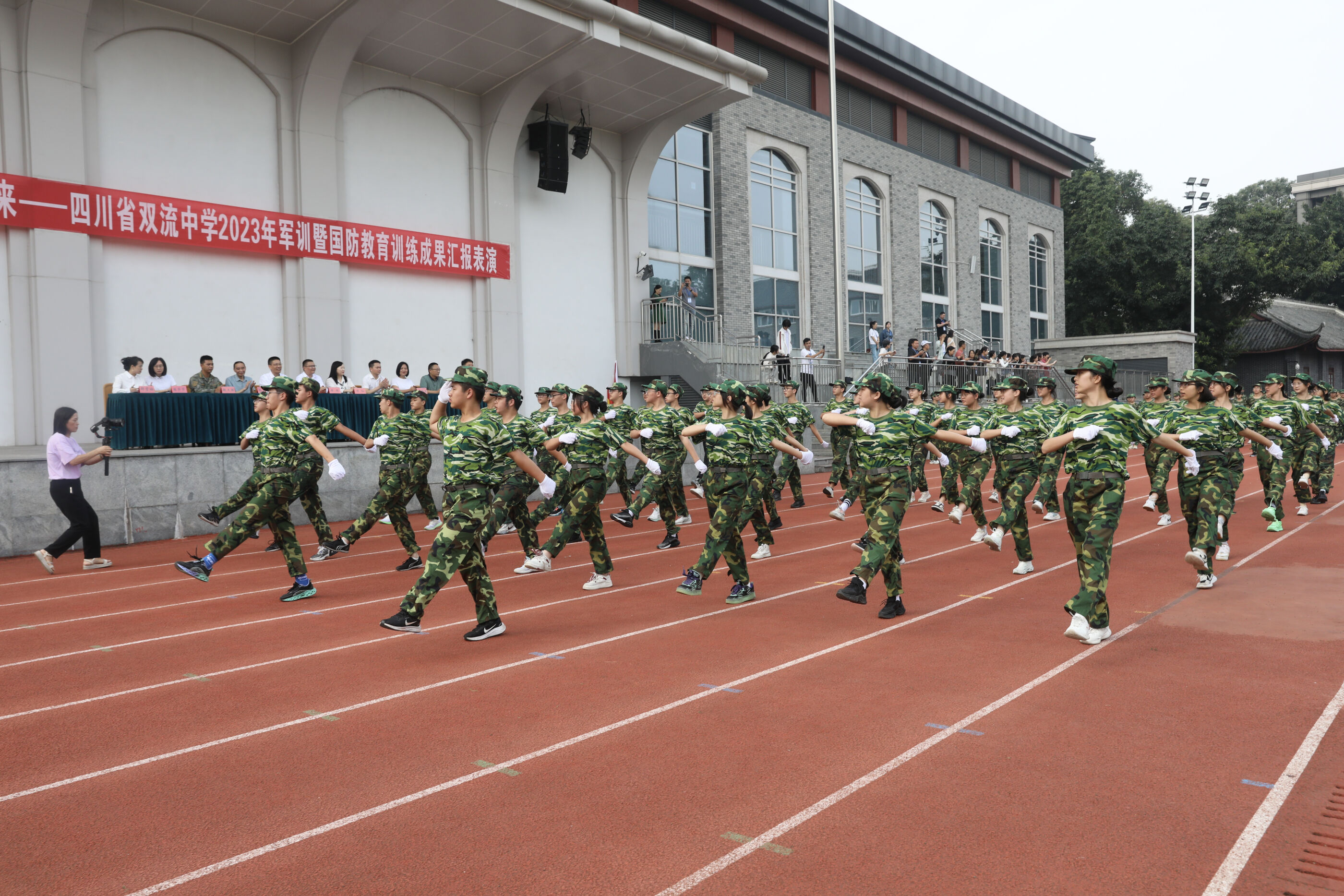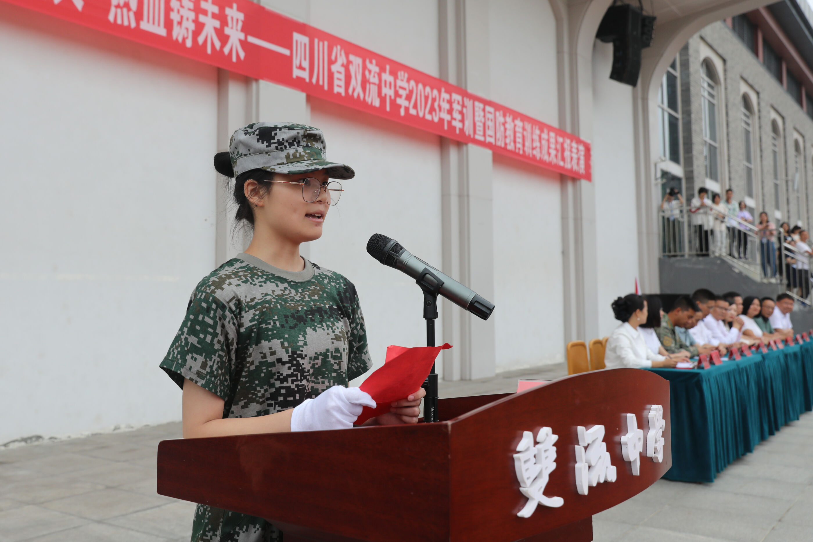 2023年9月28日上午,我校2023級新生軍訓(xùn)暨國防教育結(jié)訓(xùn)成果匯報表演在操場隆重舉行。軍訓(xùn)團(tuán)團(tuán)長趙大陸,四川省雙流中學(xué)黨委書記、校長黃超,黨委副書記、副校長譚紅,黨委副書記向發(fā)友,副校長徐天福及部分行政出席,德育安全處主任郝碧婭主持儀式。