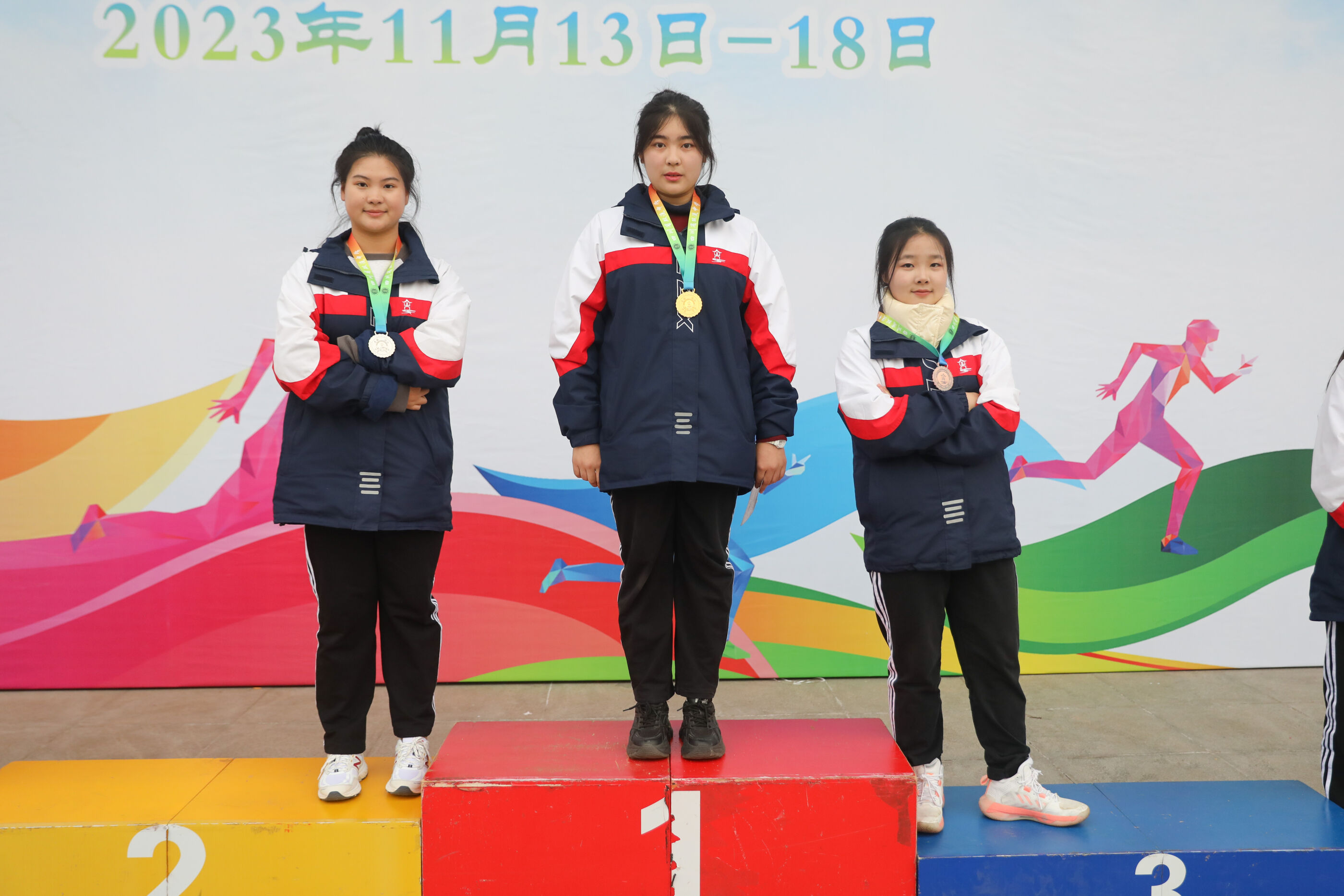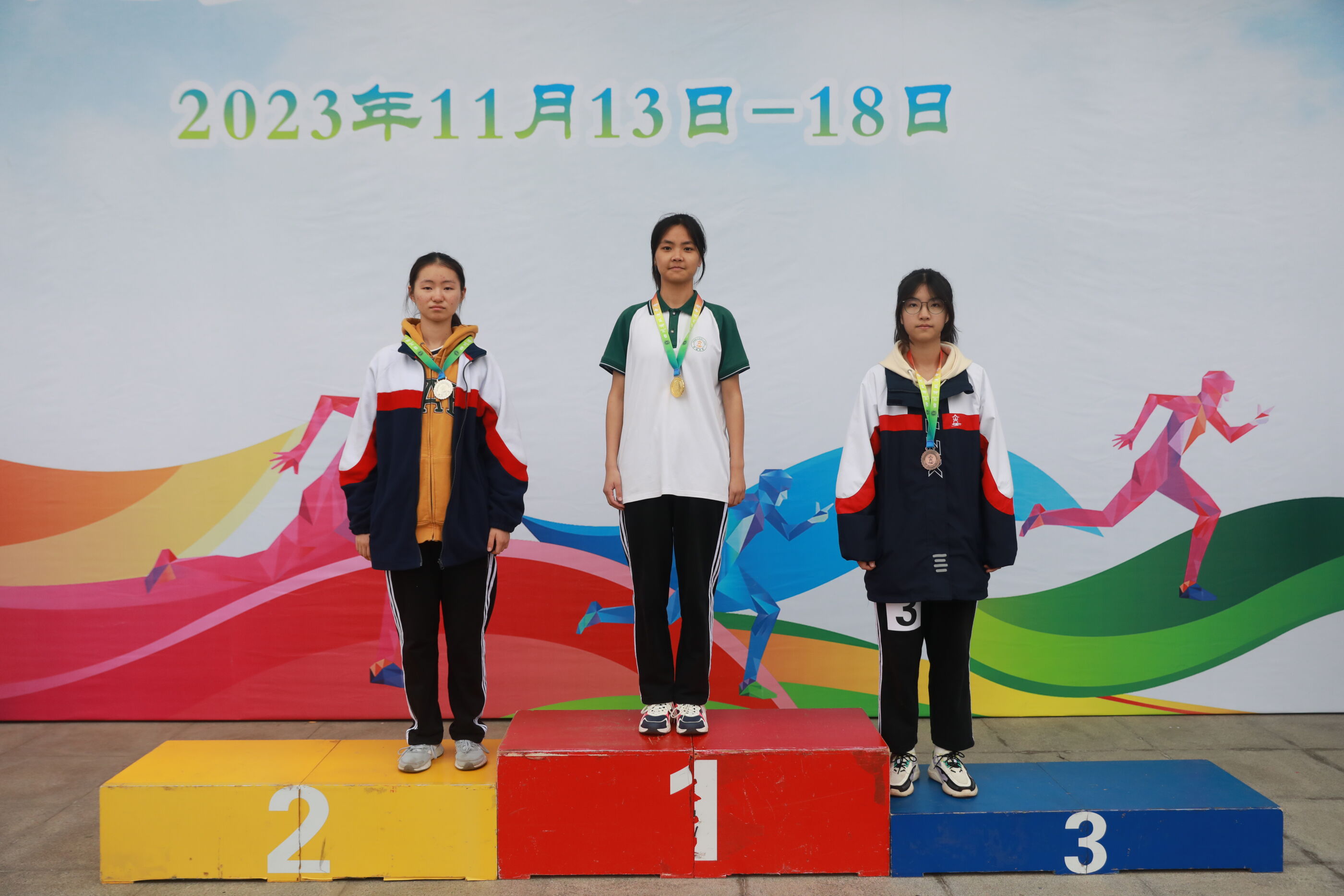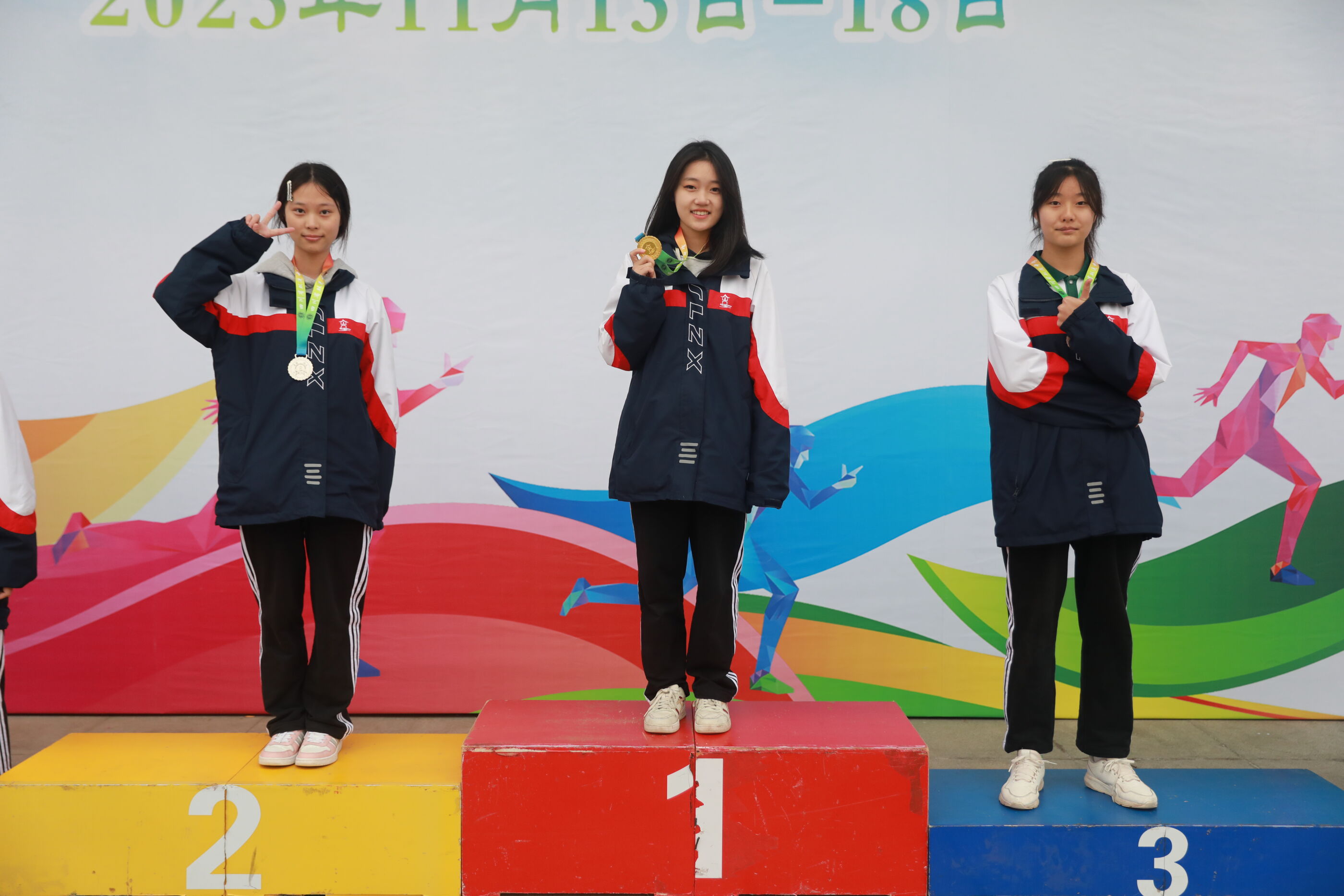 高二女子跳遠(yuǎn)比賽前三名選手(何娜8班<銀牌> 劉同10班<金牌> 蔡敏希12班<銅牌> )