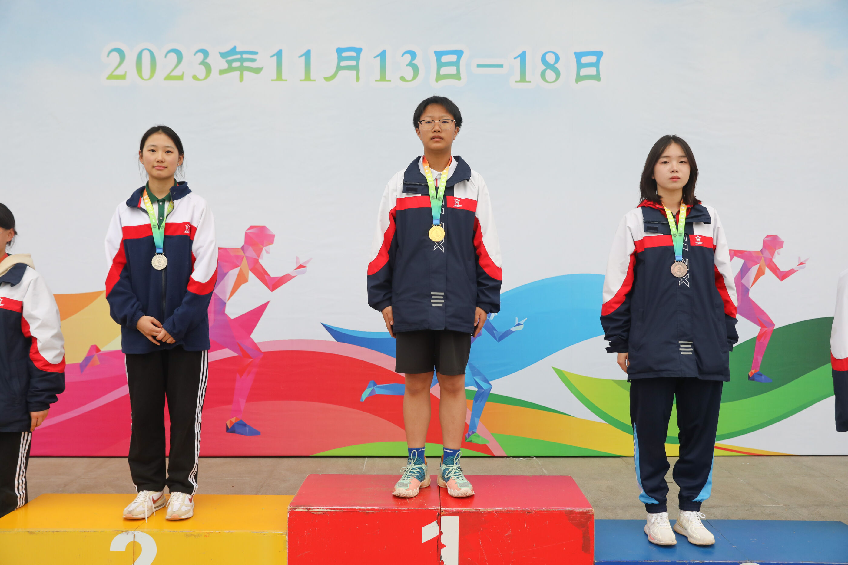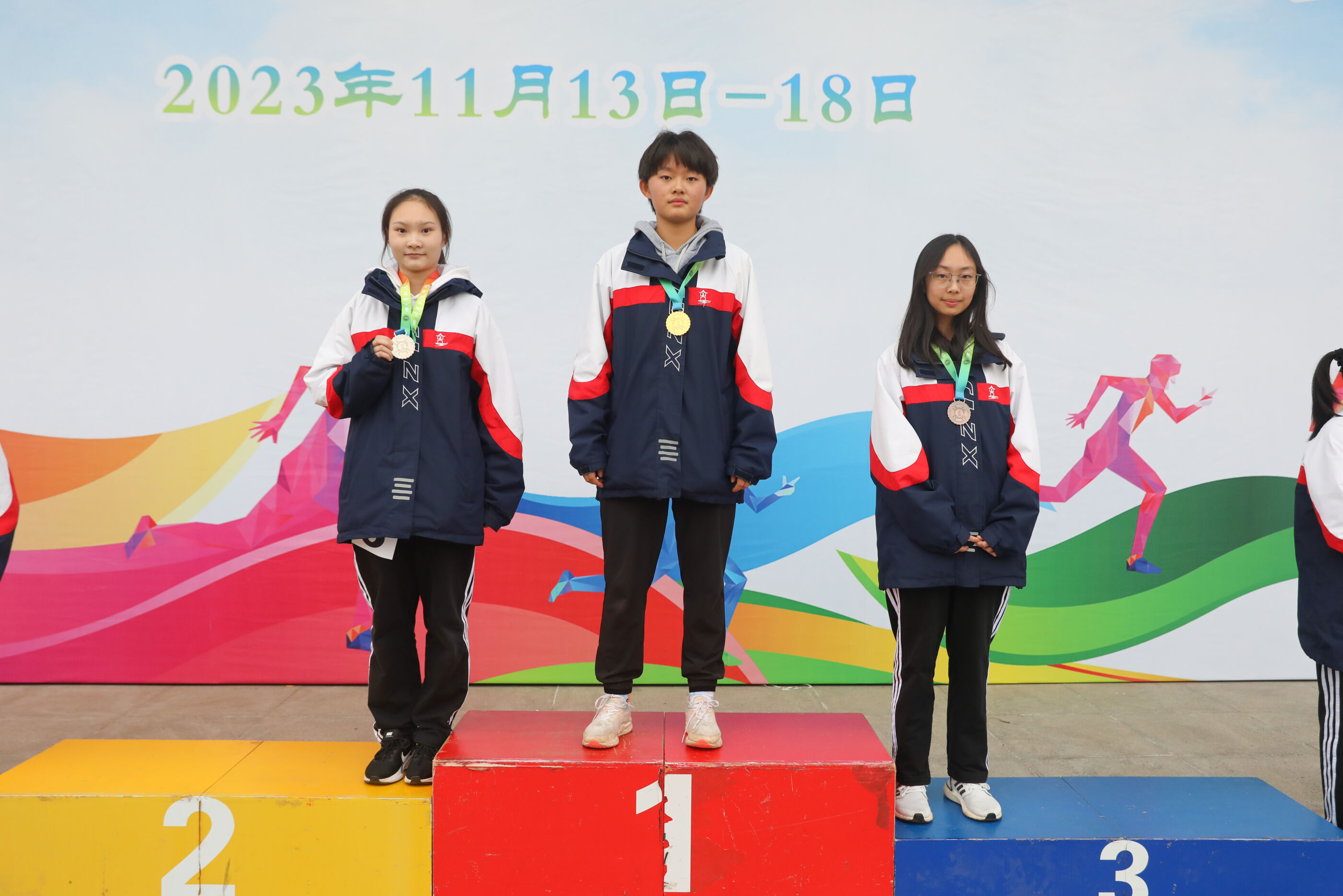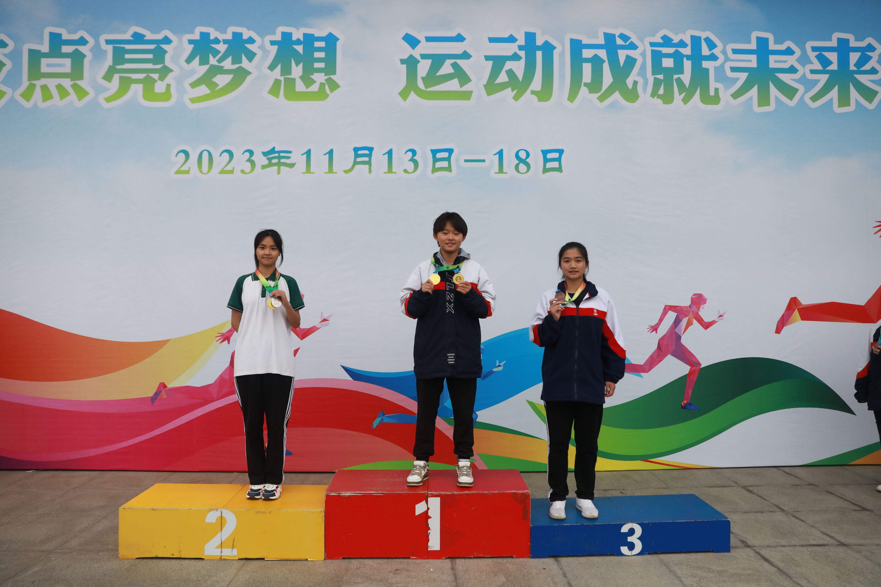 高二女子跳遠(yuǎn)比賽前三名選手(何娜8班<銀牌> 劉同10班<金牌> 蔡敏希12班<銅牌> )