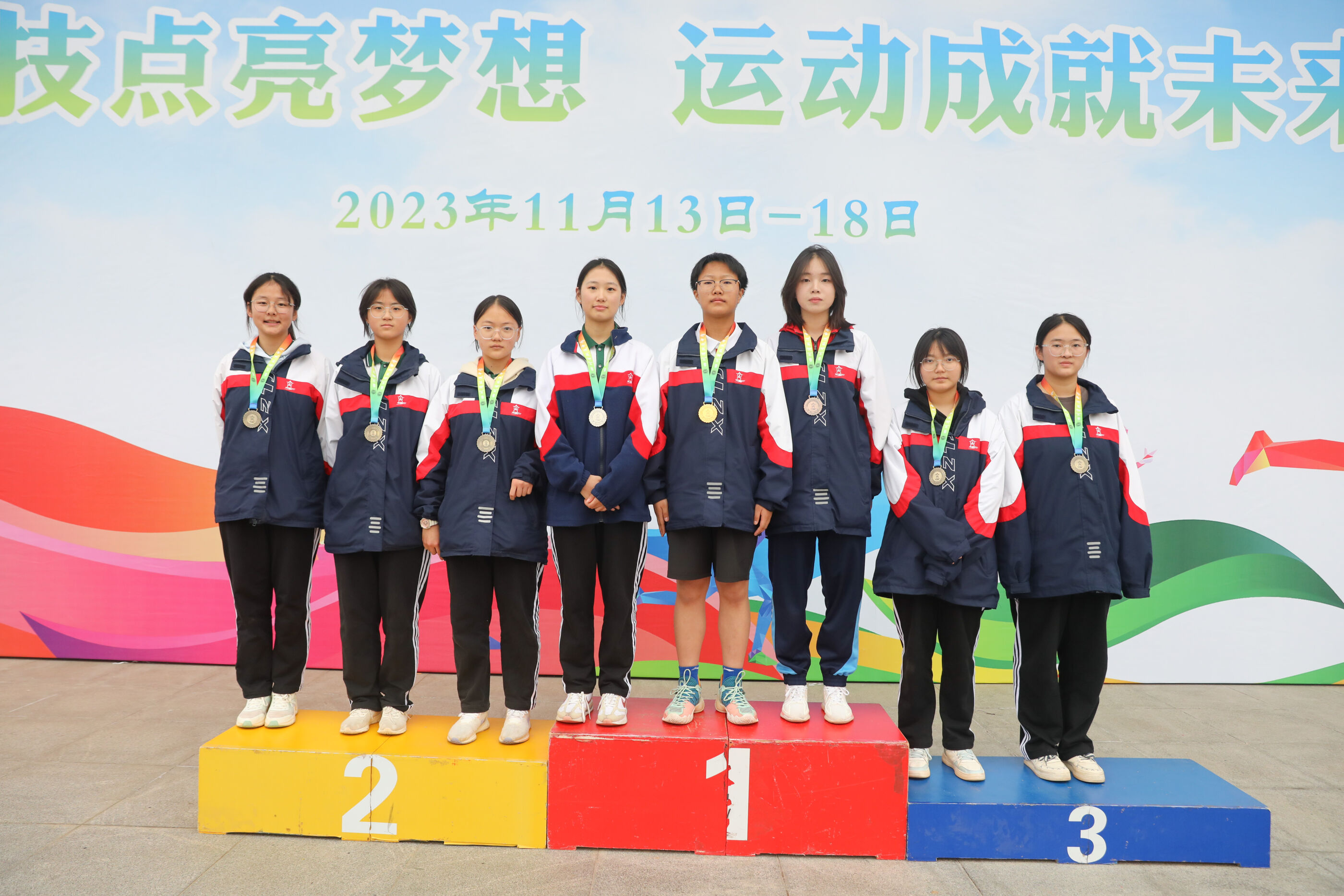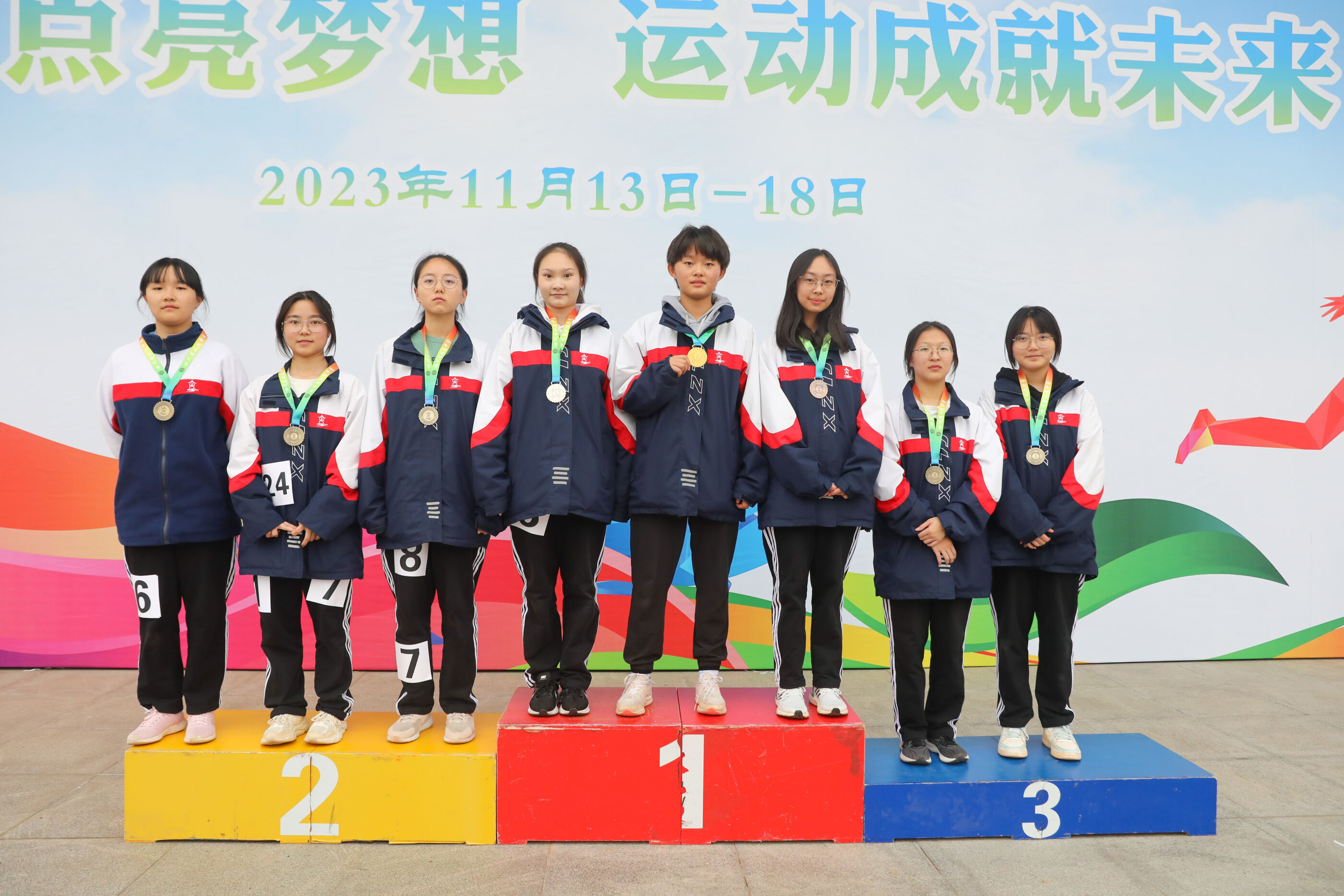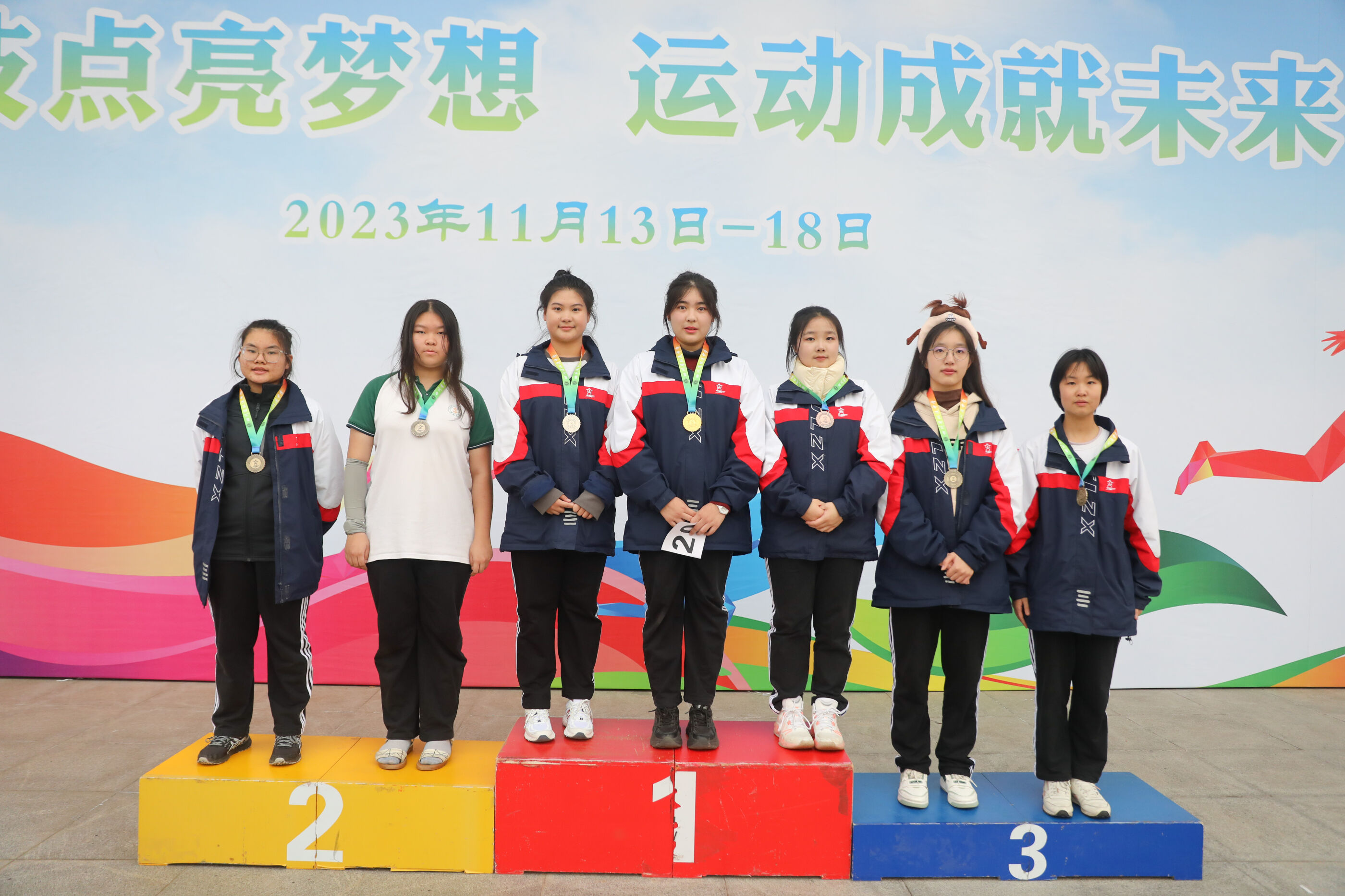 高二女子實(shí)心球比賽獲獎運(yùn)動員合影(王揚(yáng)樂6班 何偲玉蝶13班 曾琪盼14班<銀牌> 楊靜溢18班<金牌> 鄧雨欣4班<銅牌> 王茂媛18班 任雅琪11班