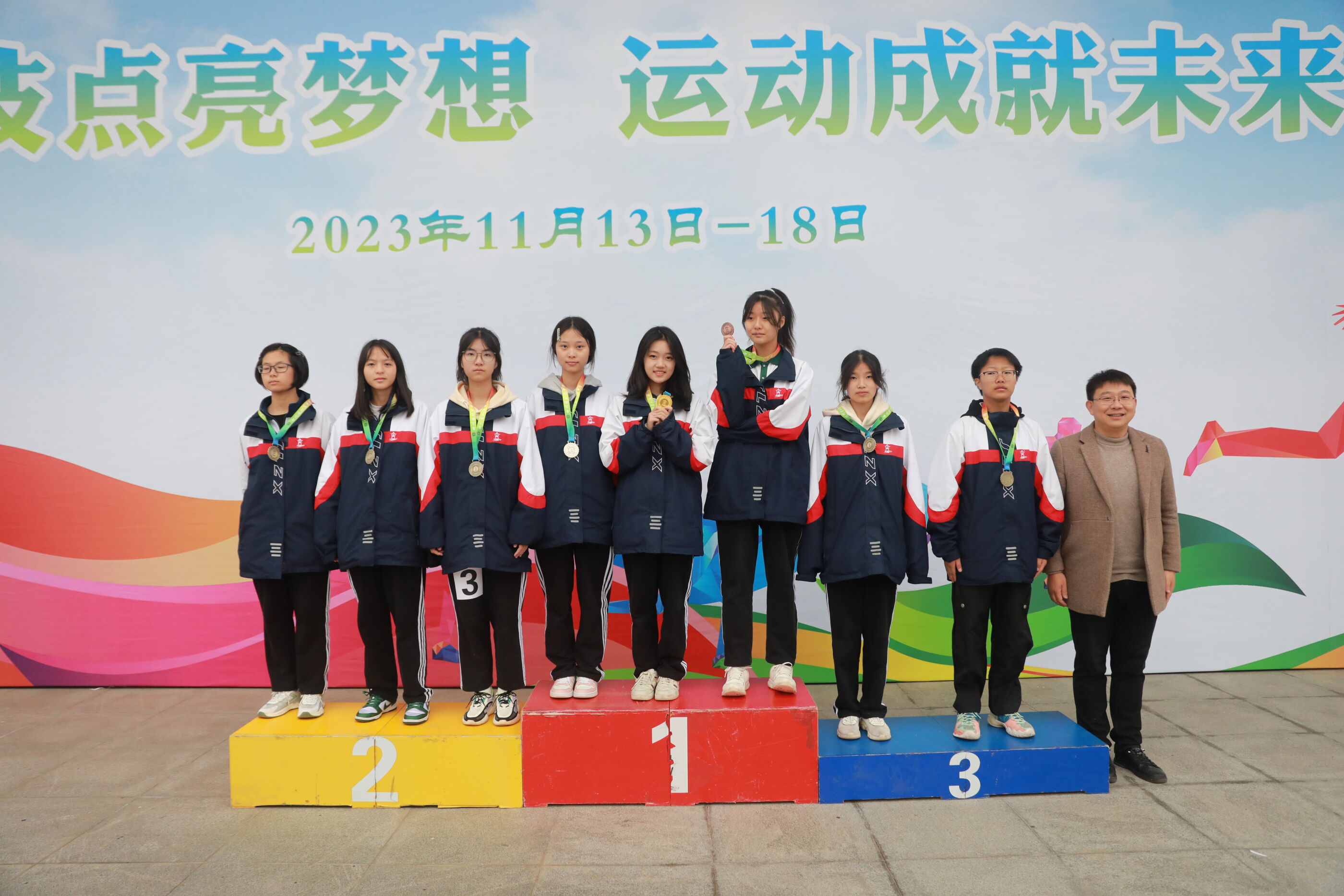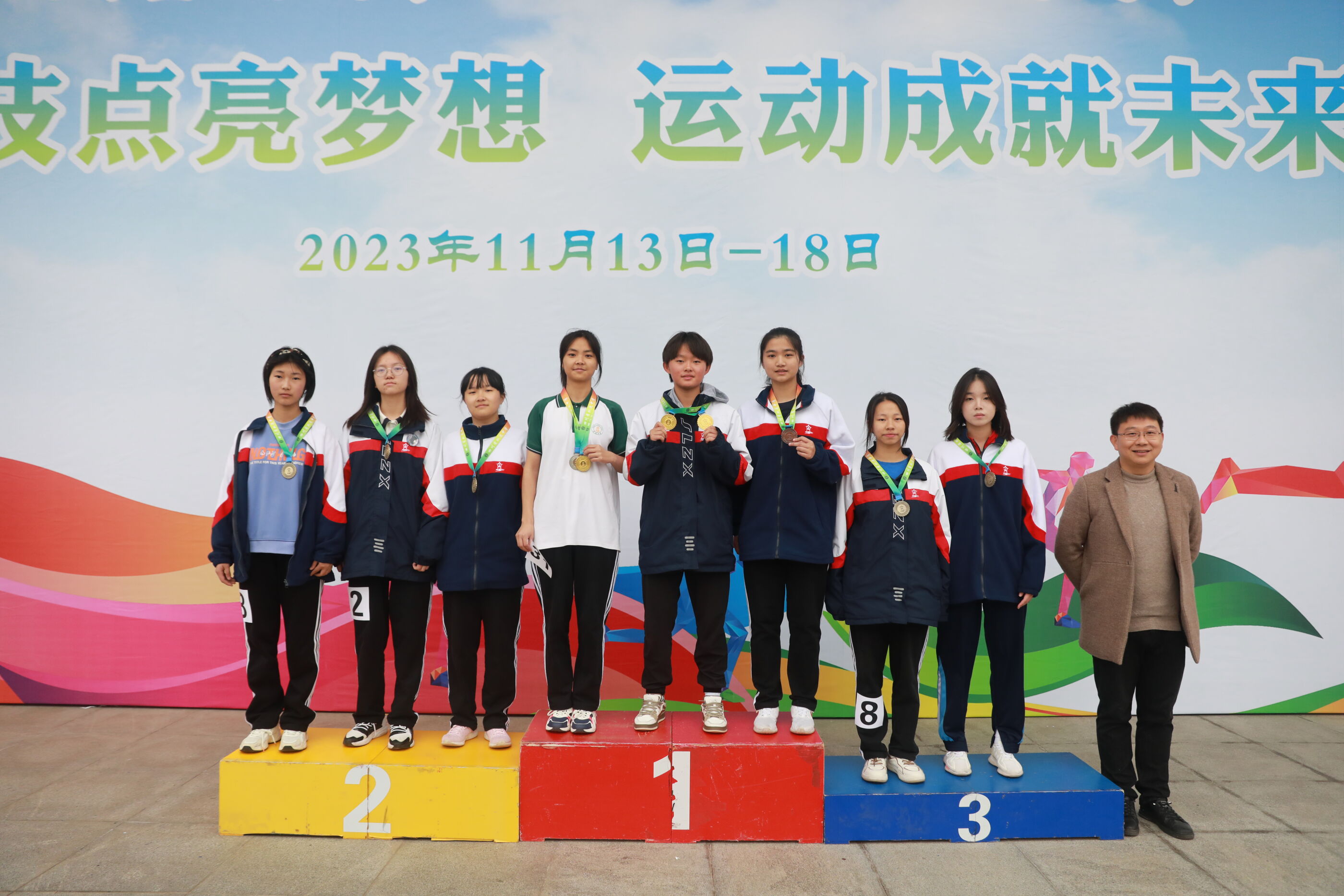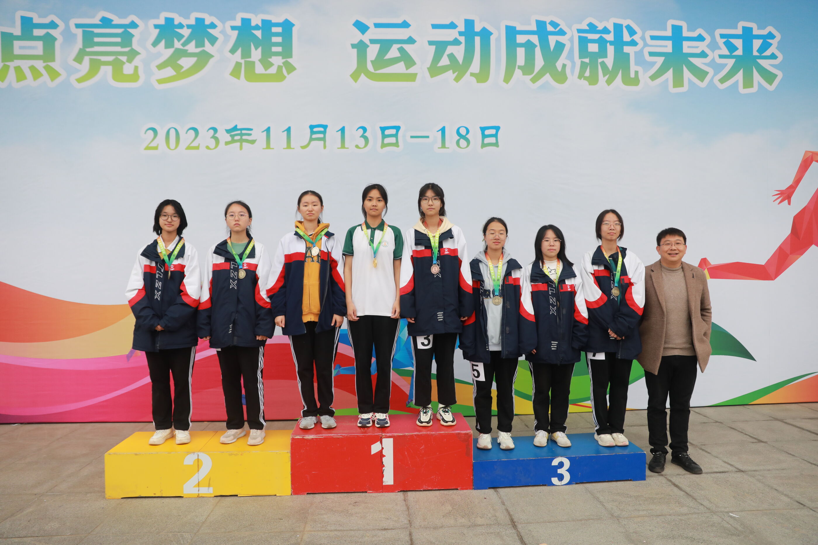 高二女子200米比賽獲獎運(yùn)動員與陳斌主任合影