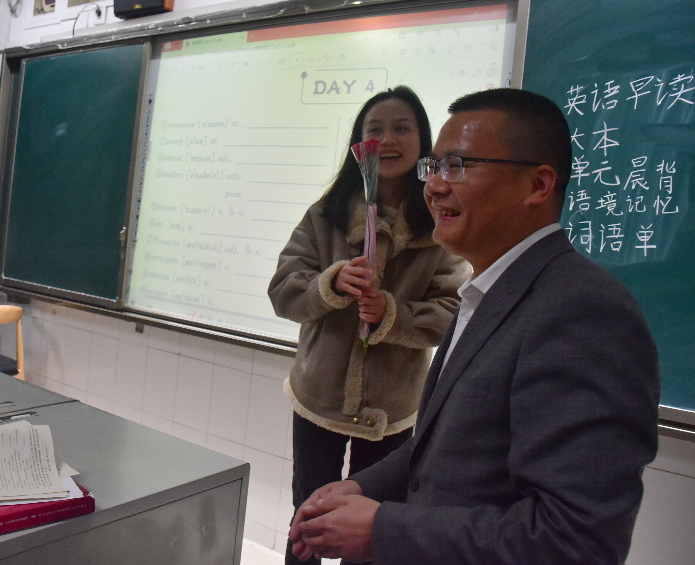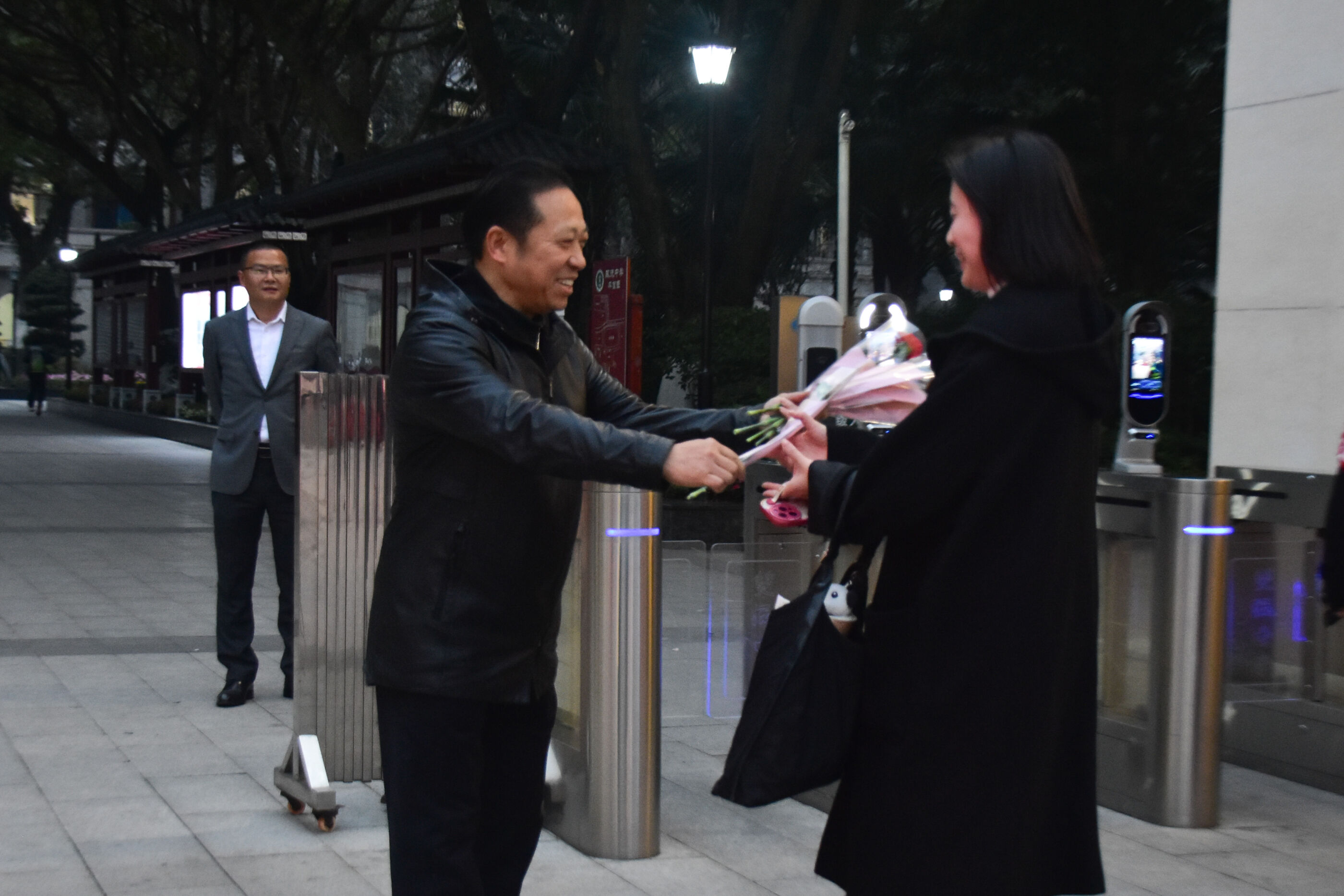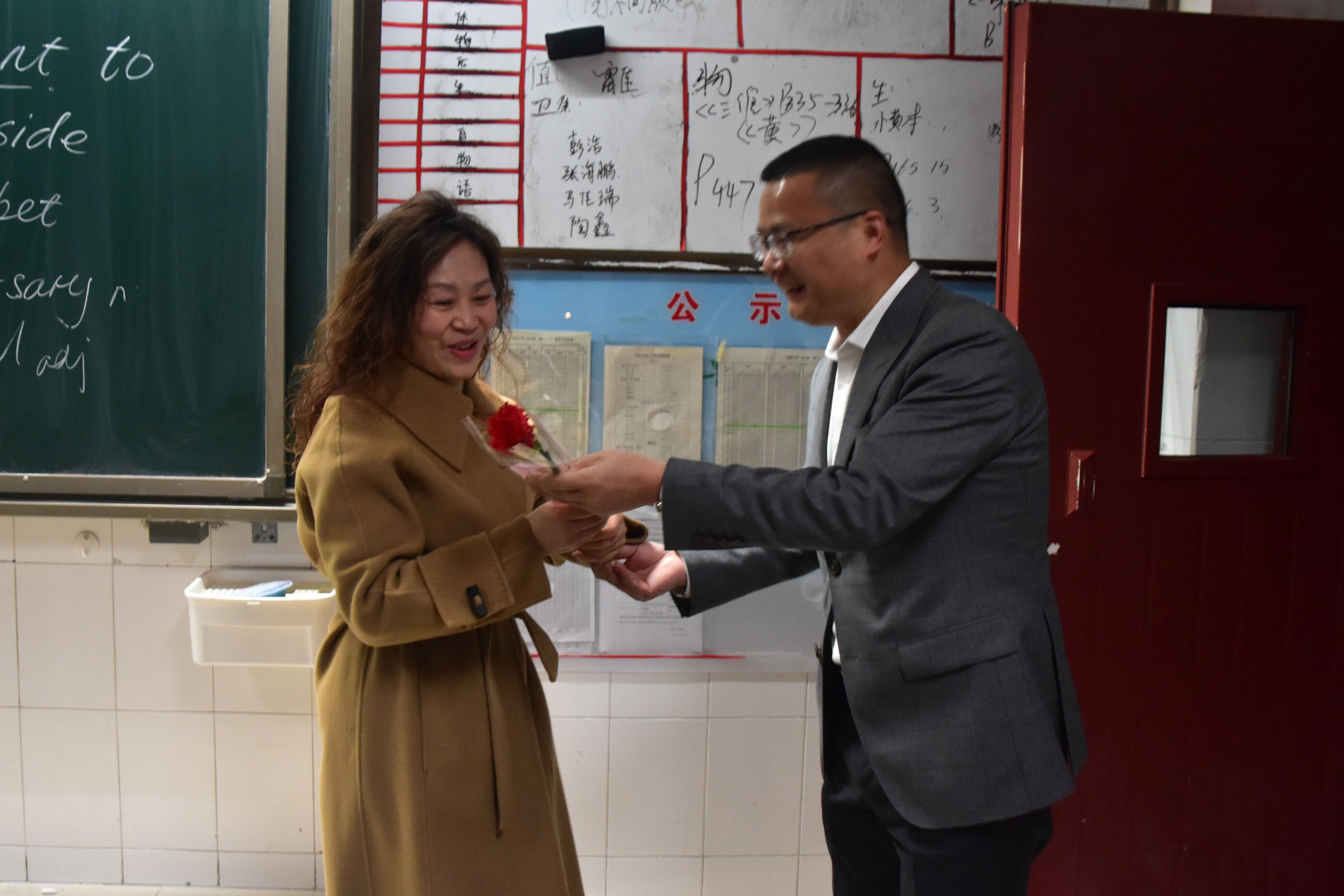 2024年3月8日清晨,黨委書(shū)記黃超攜雙中部分行政守候在校門(mén)口女教職工送上節(jié)日的鮮花。
