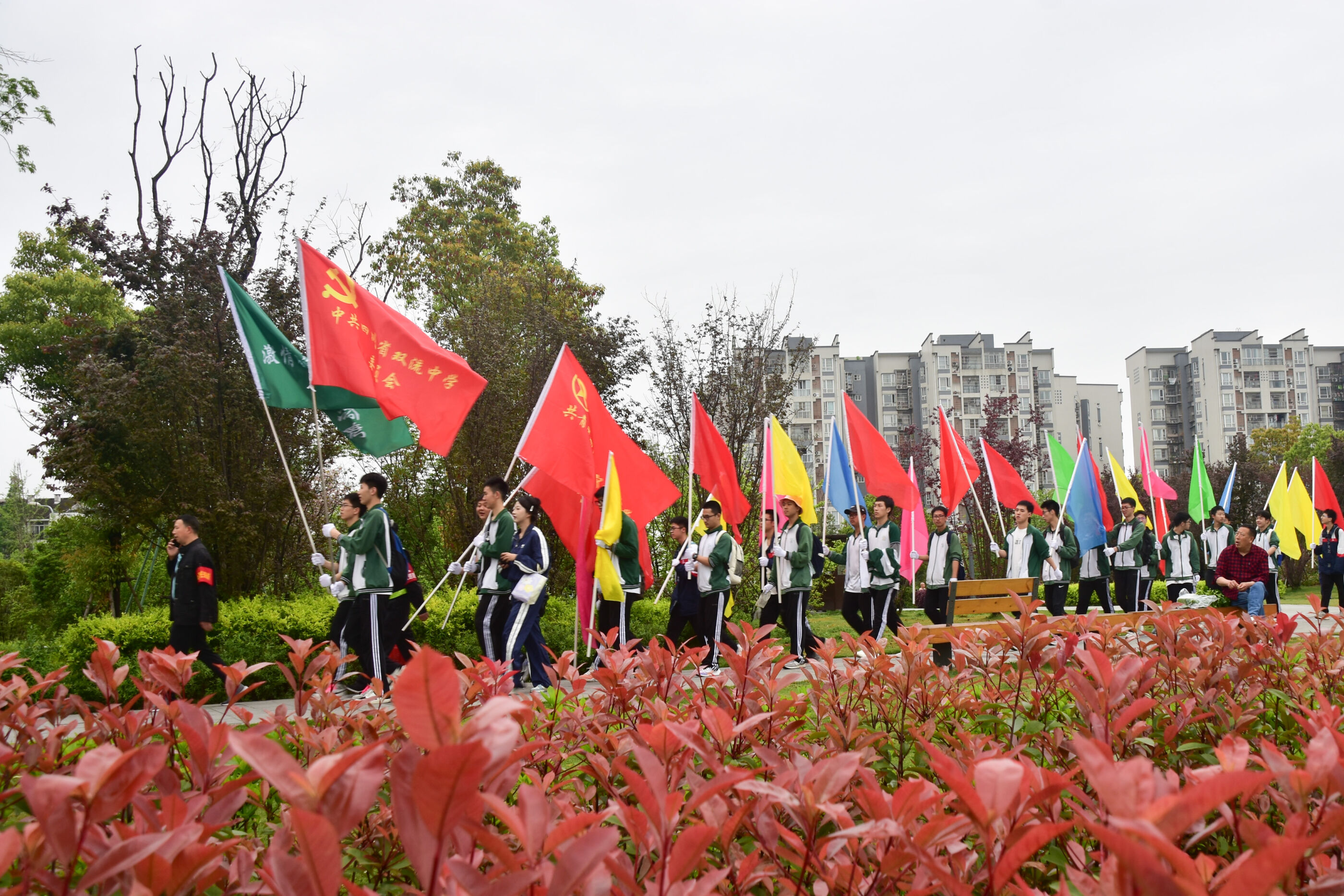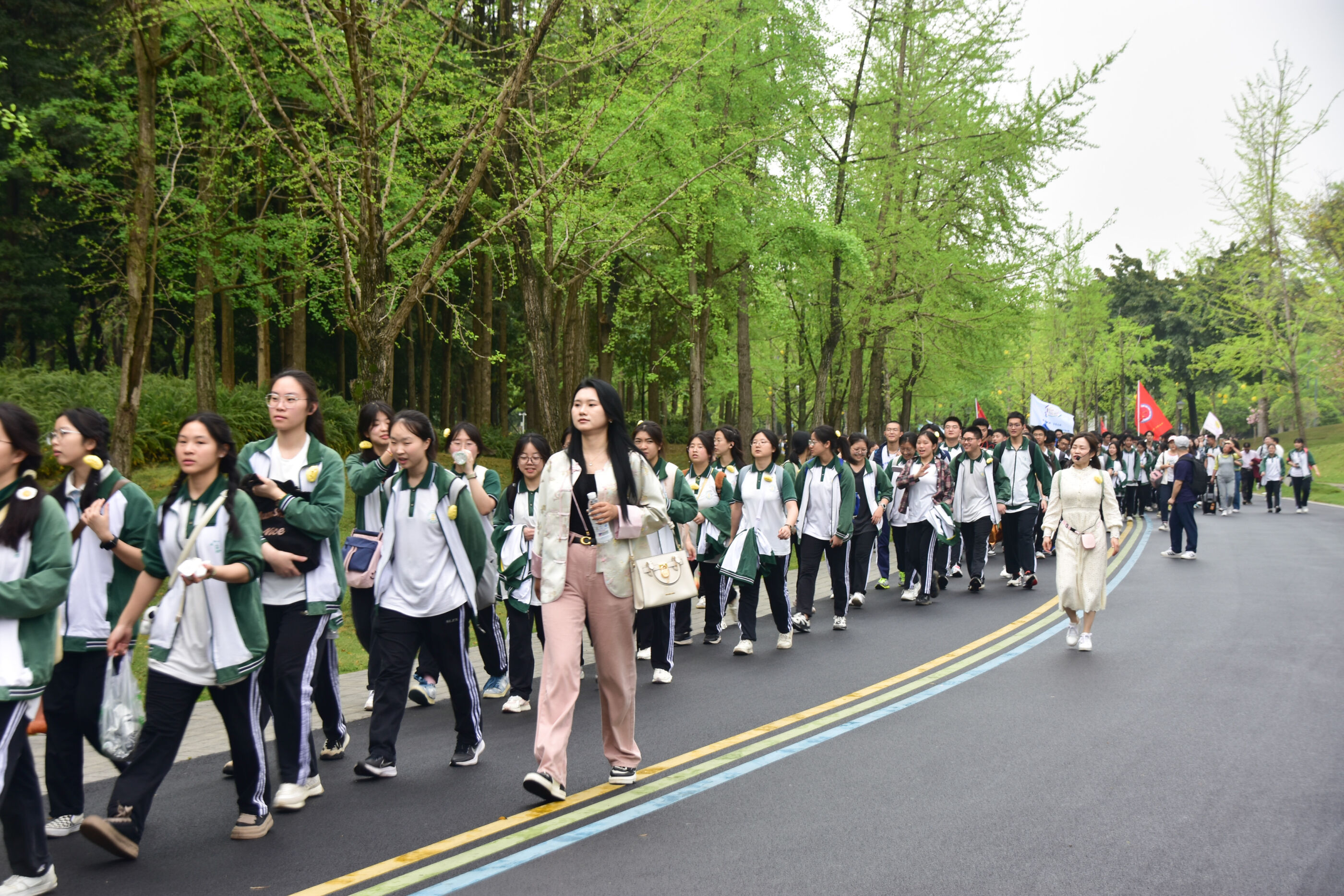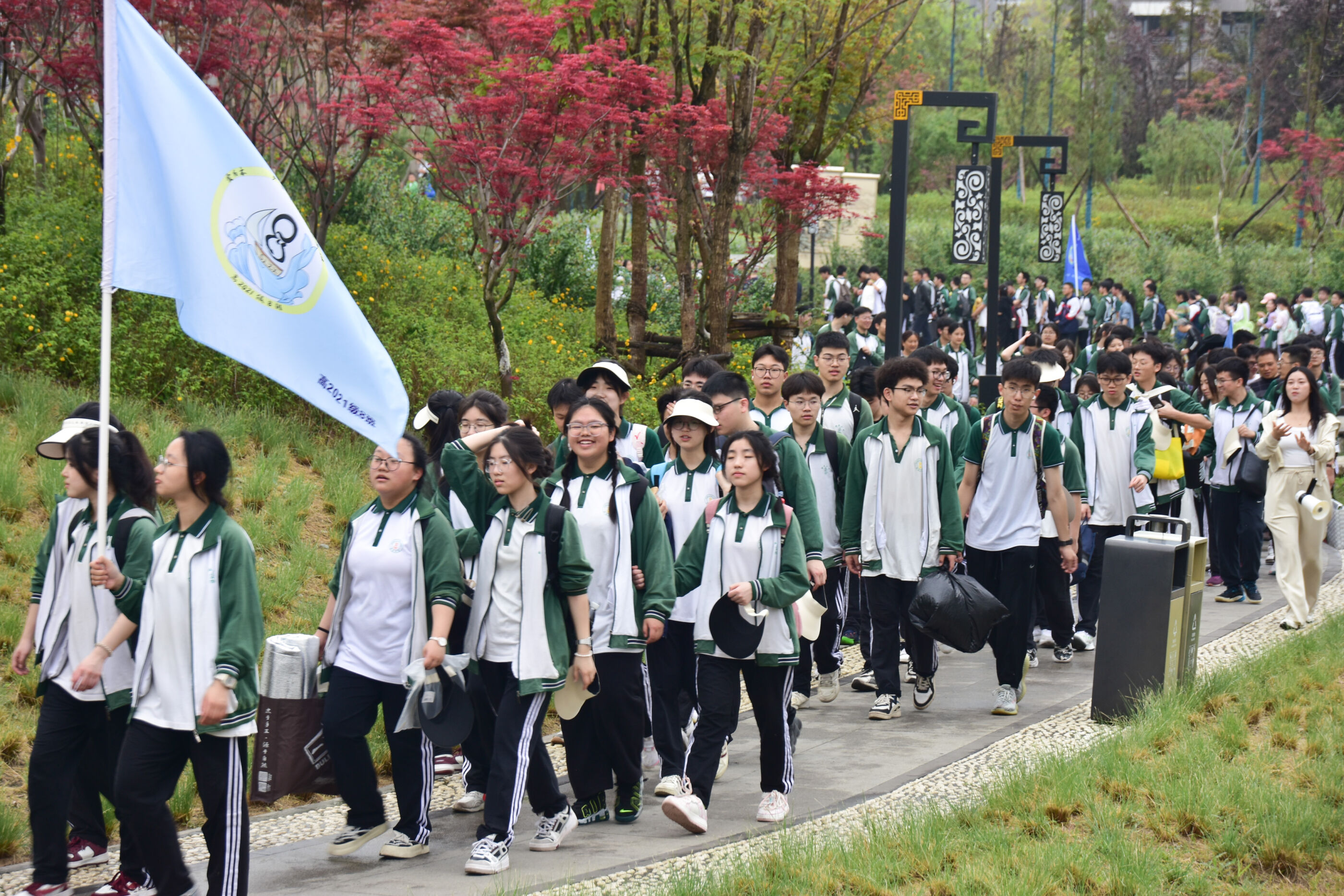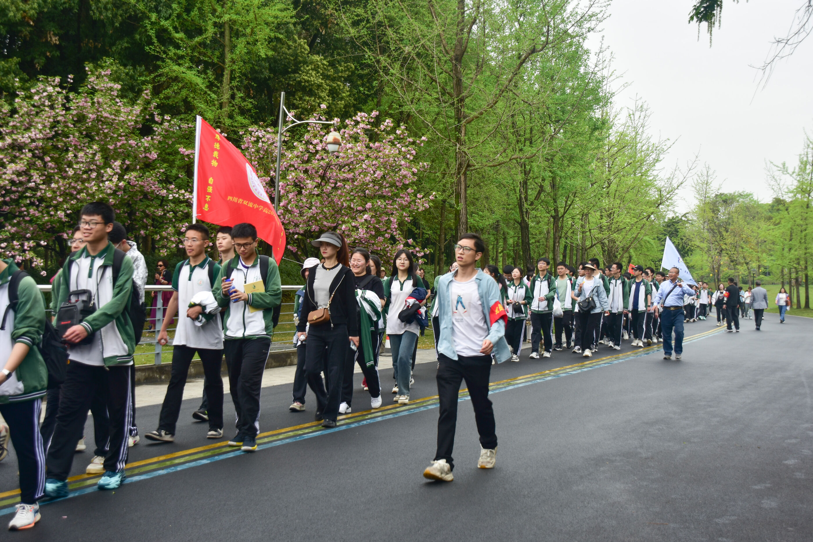 雙流中學(xué)舉行“激情奮進 逐夢遠(yuǎn)航”遠(yuǎn)足活動,彩旗隊伍領(lǐng)路