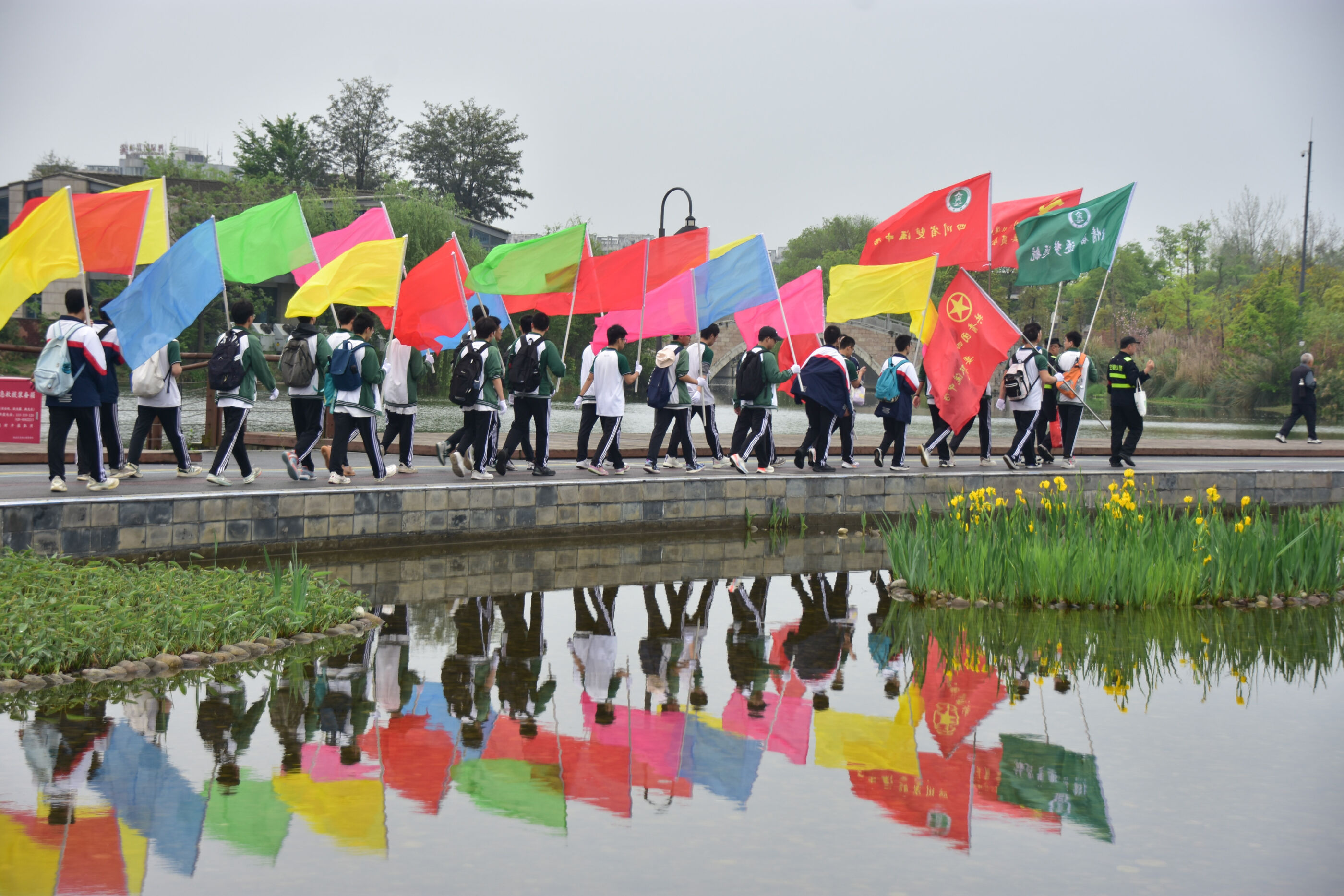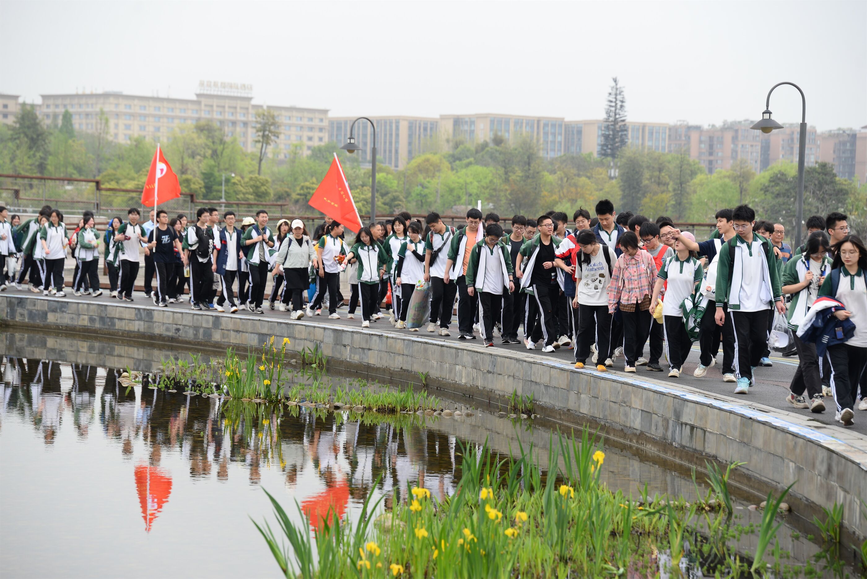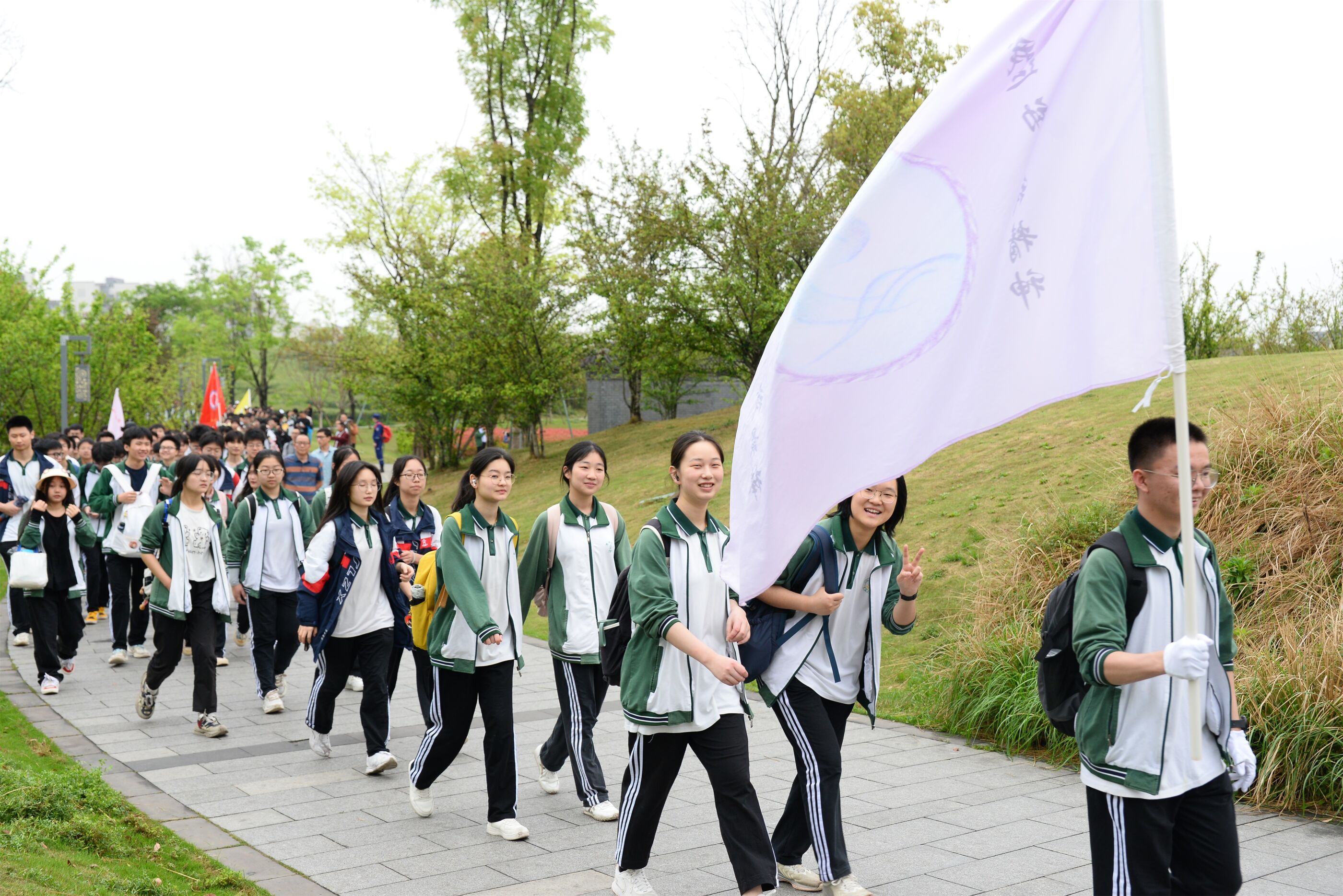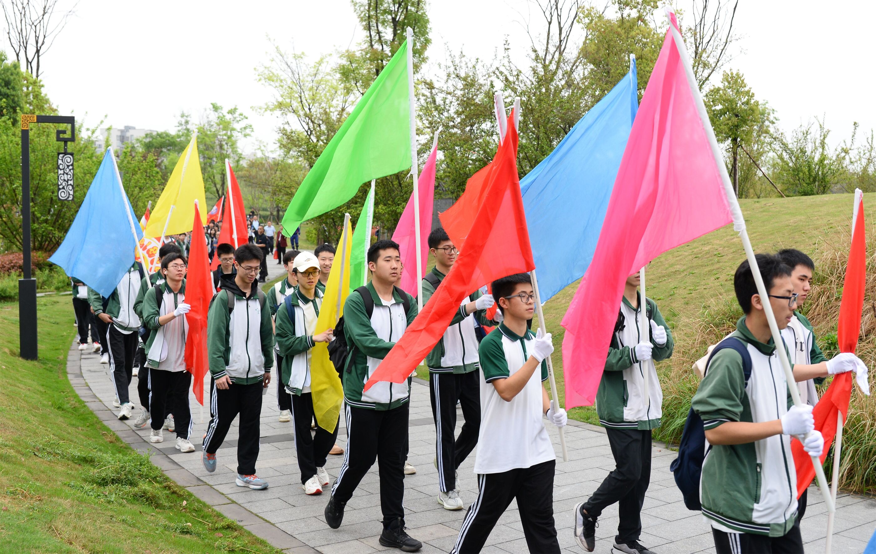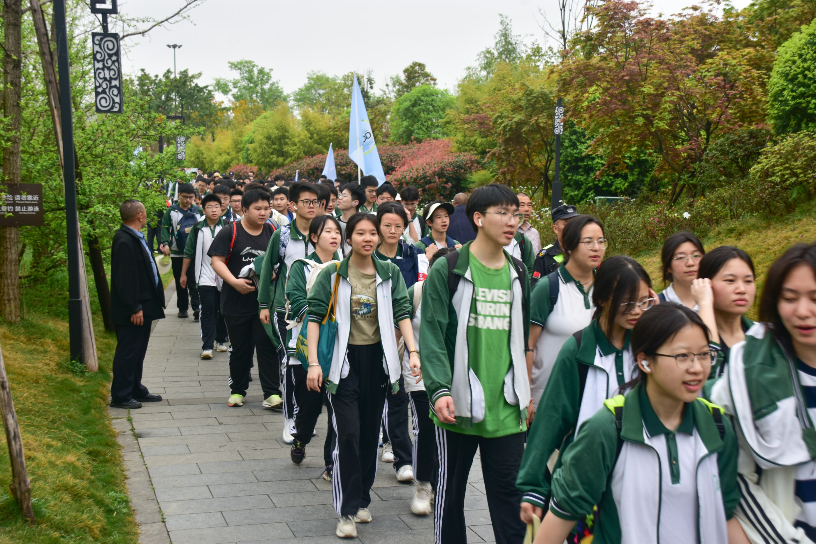 雙流中學(xué)舉行“激情奮進 逐夢遠(yuǎn)航”遠(yuǎn)足活動,彩旗隊伍領(lǐng)路