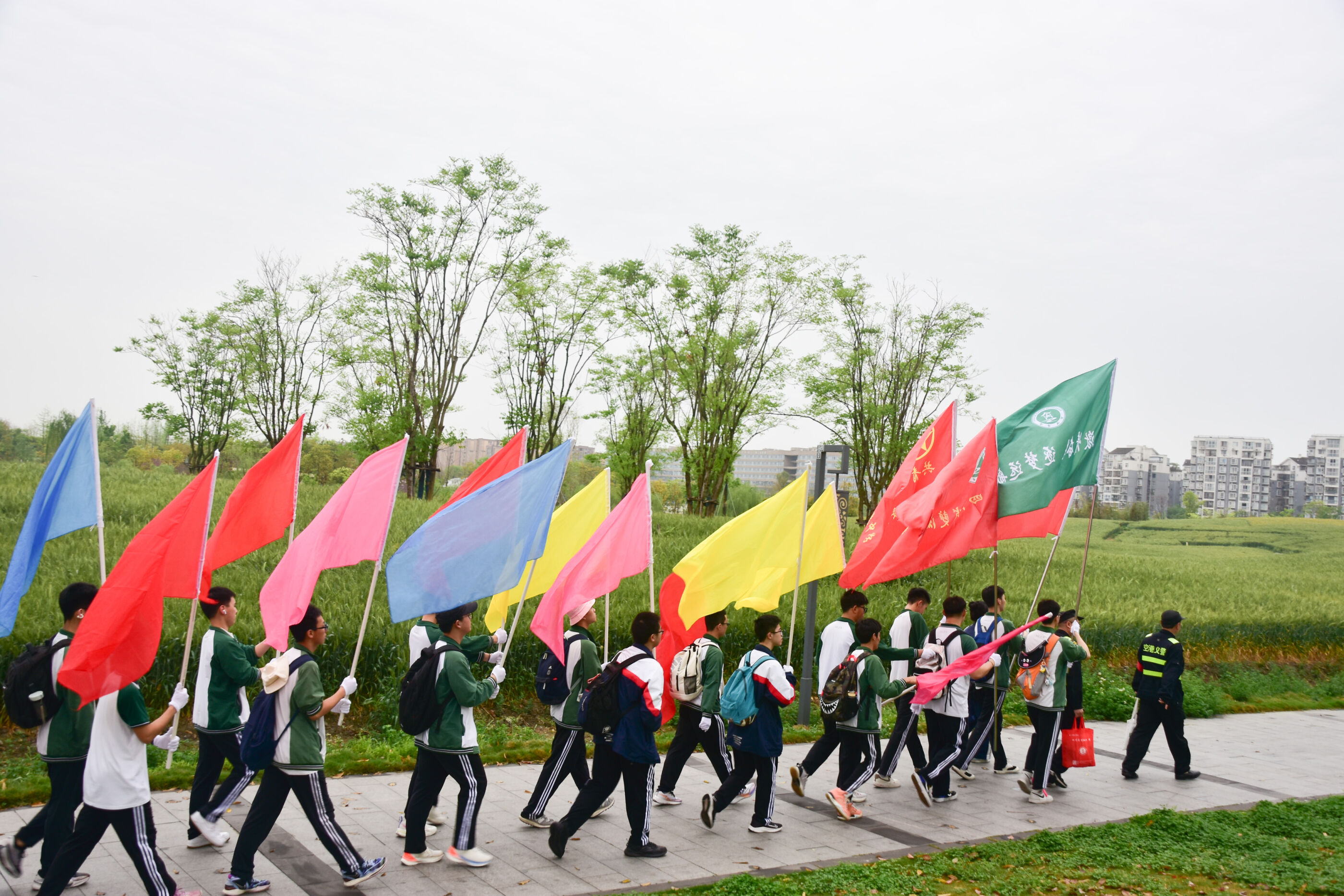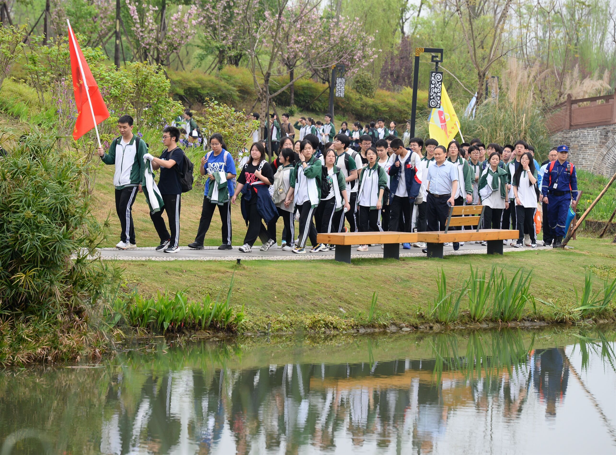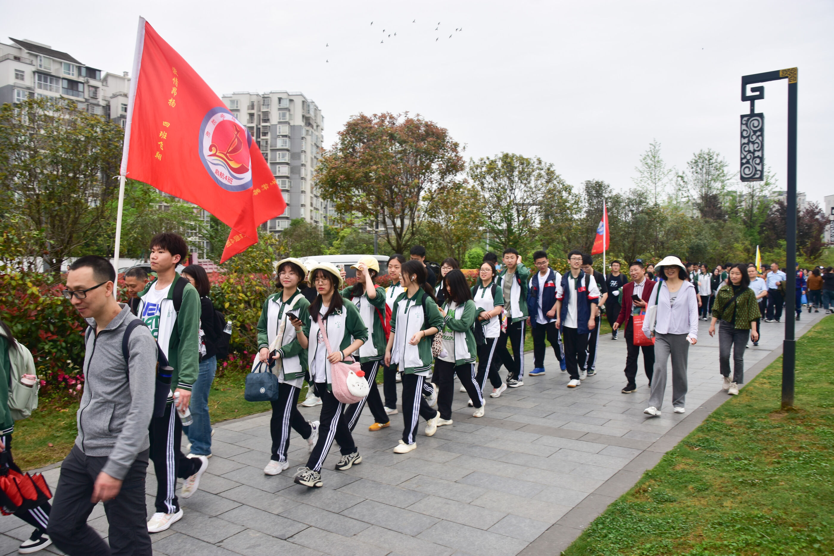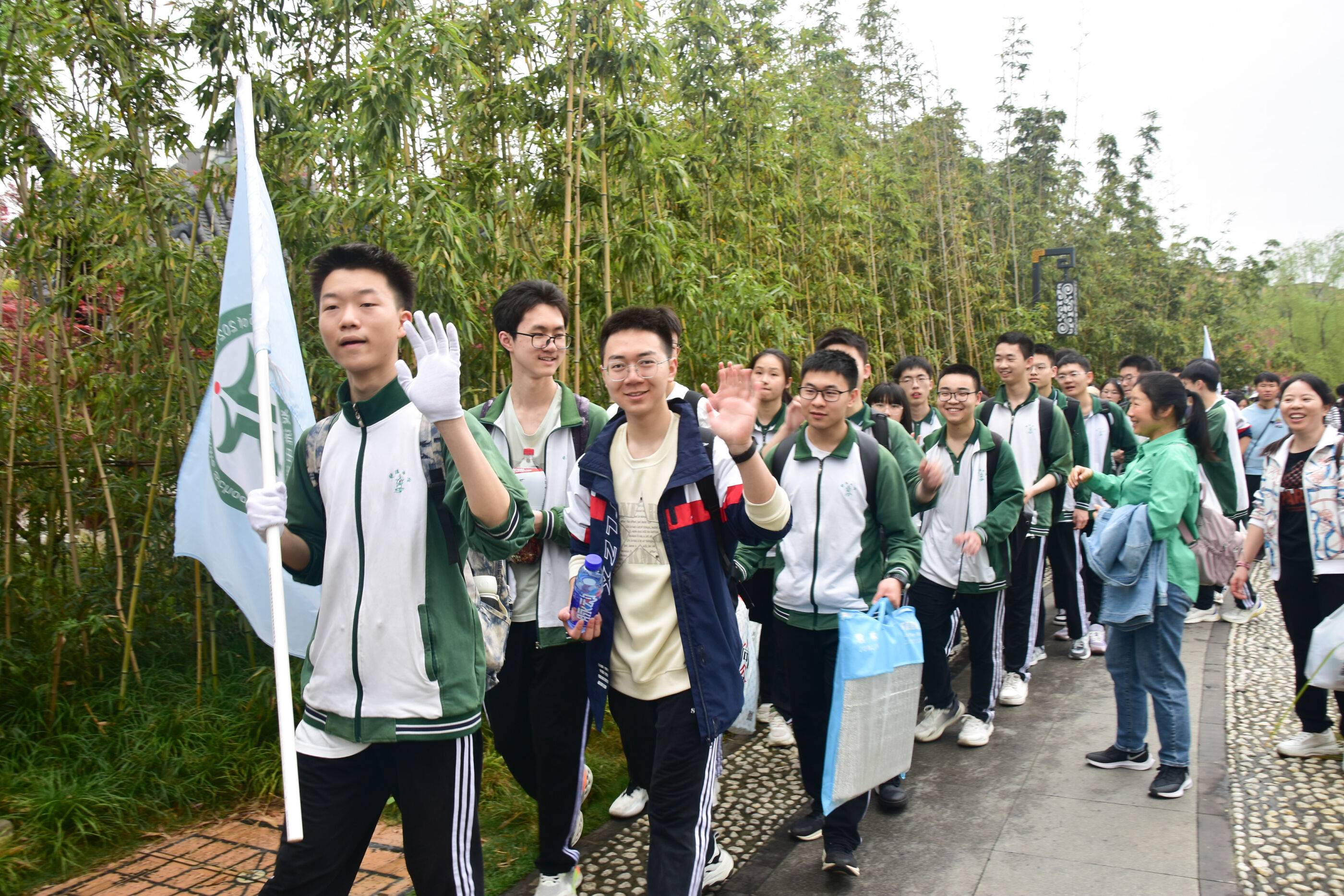 雙流中學(xué)舉行“激情奮進 逐夢遠(yuǎn)航”遠(yuǎn)足活動,彩旗隊伍領(lǐng)路