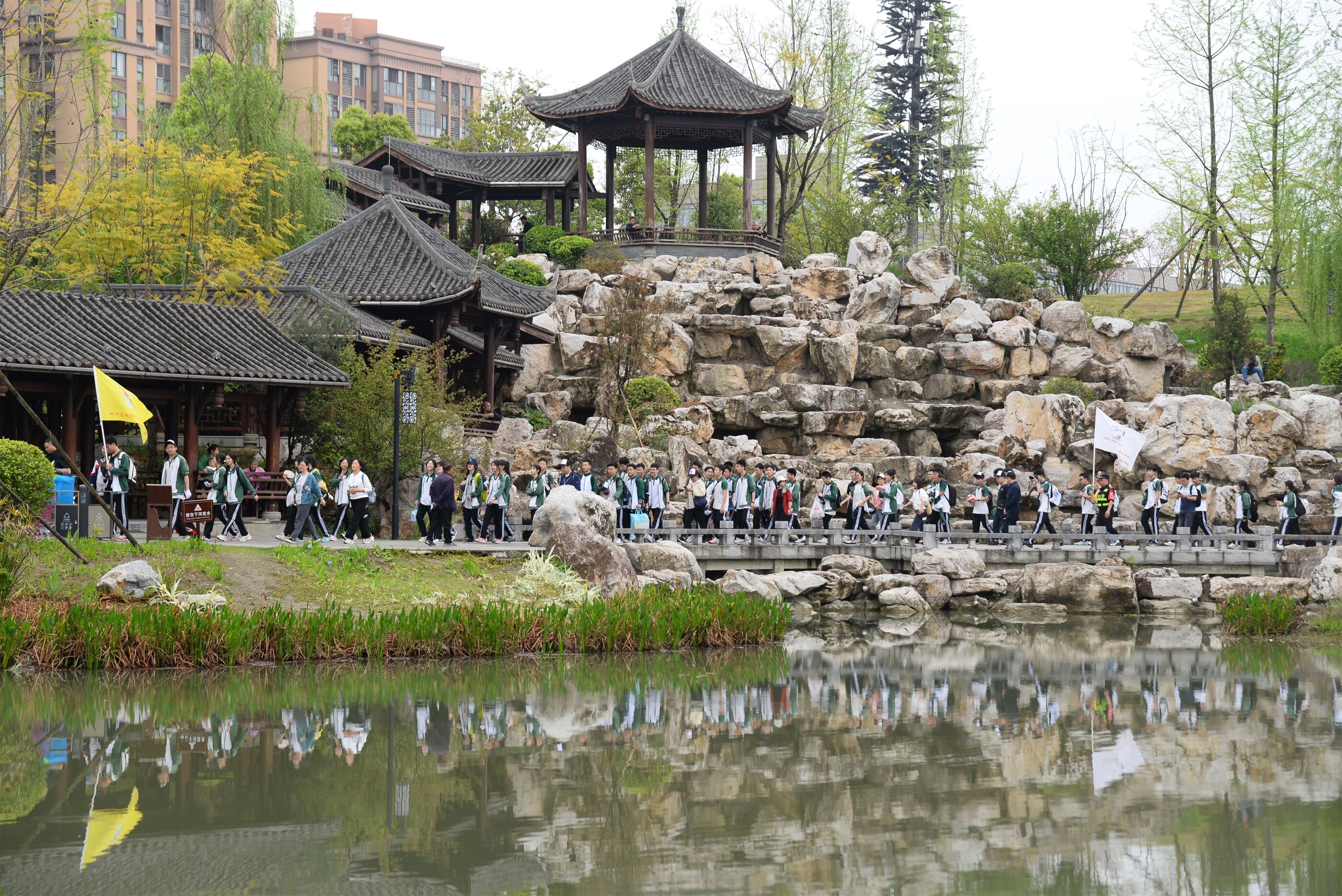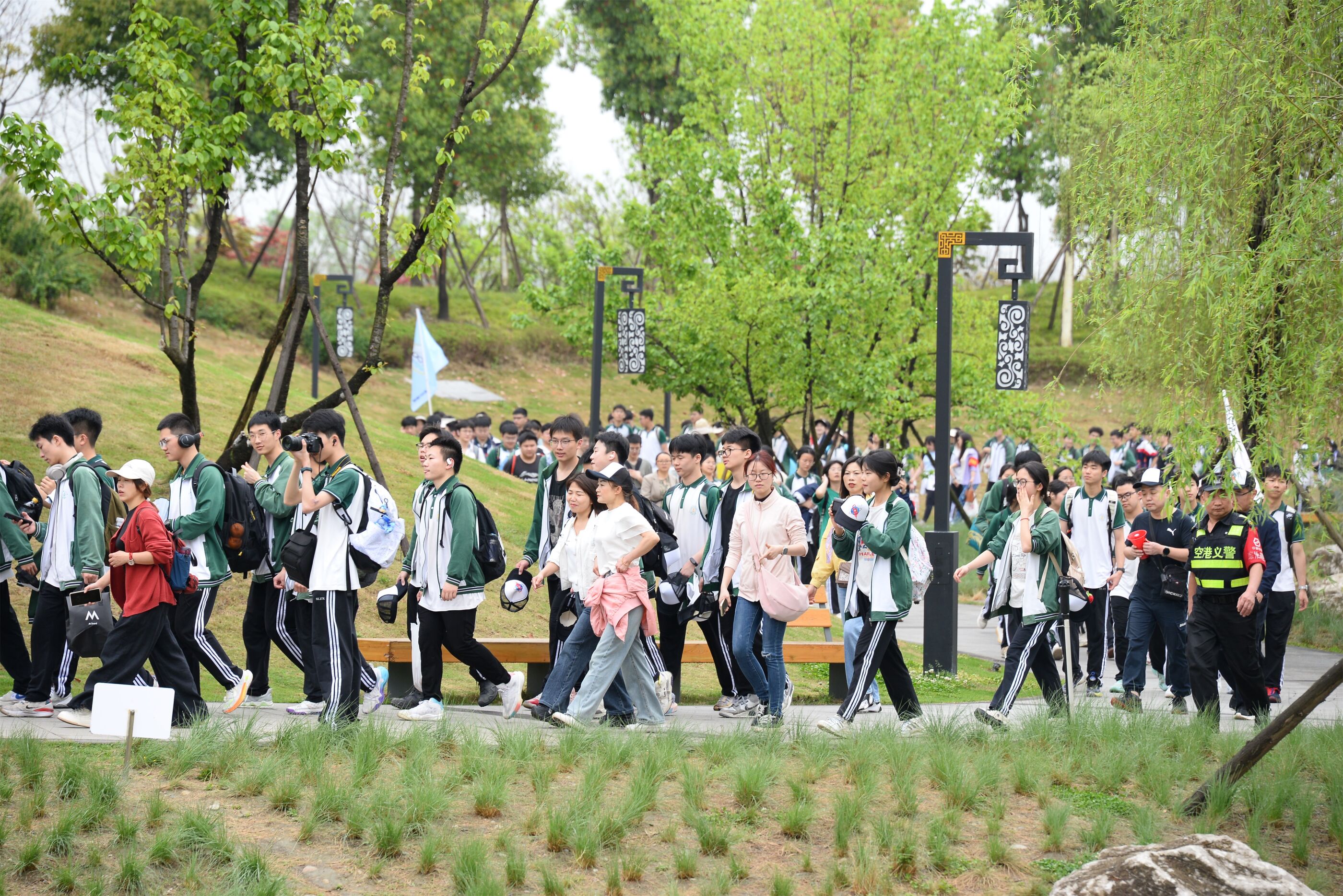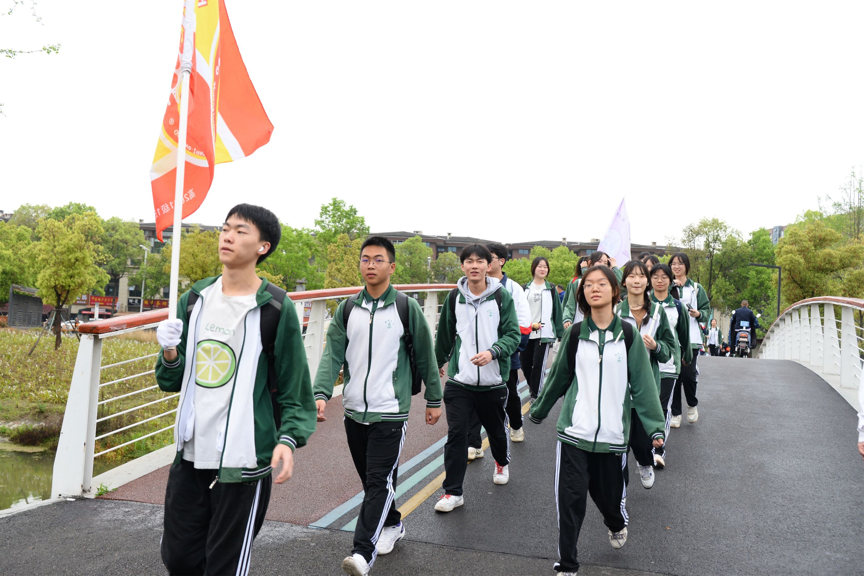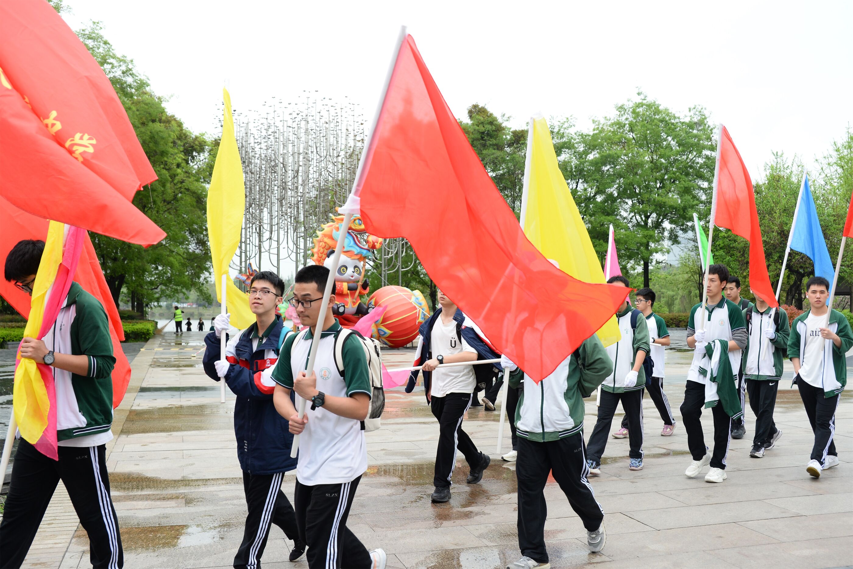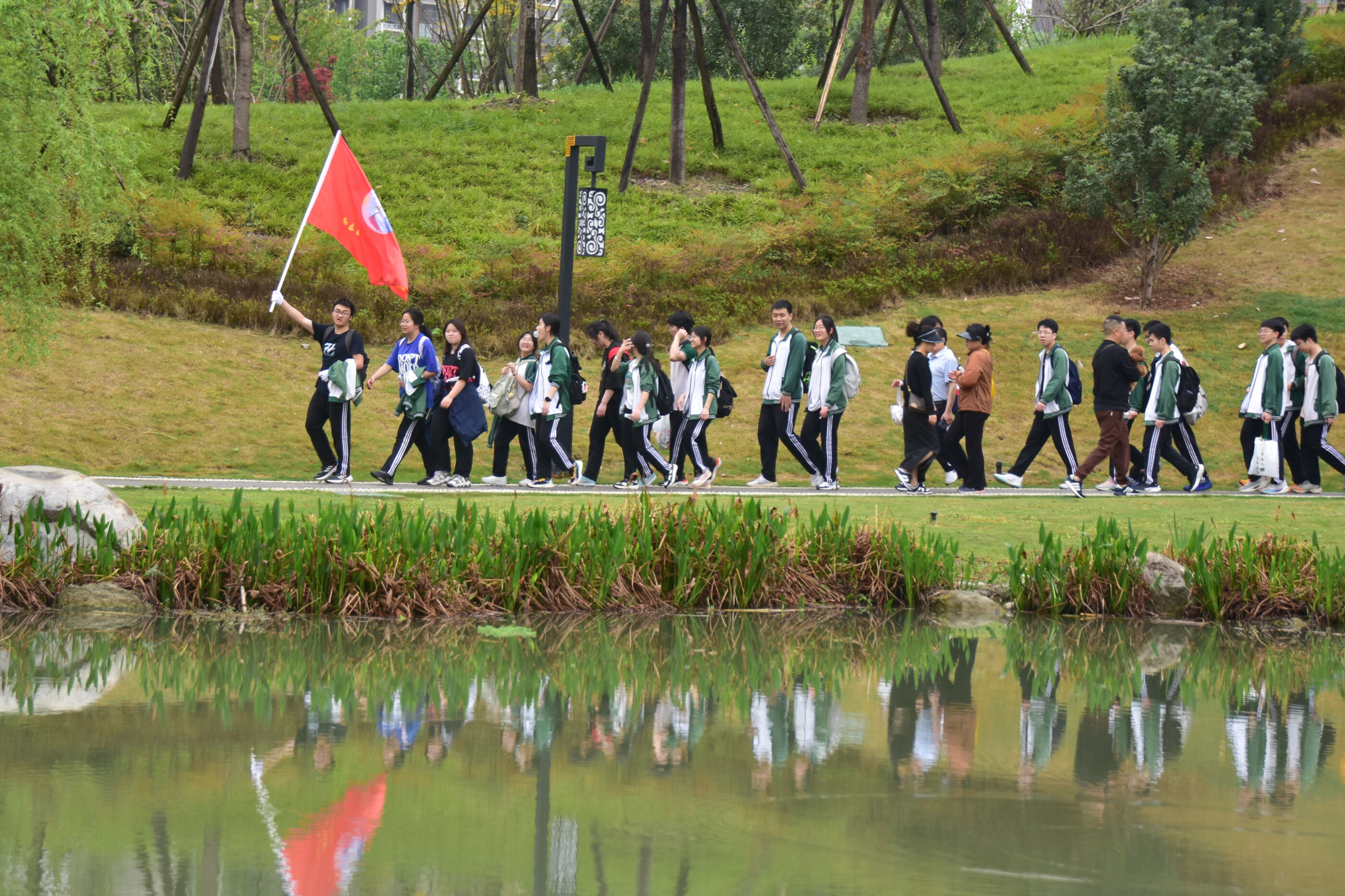 雙流中學(xué)舉行“激情奮進 逐夢遠(yuǎn)航”遠(yuǎn)足活動,彩旗隊伍領(lǐng)路