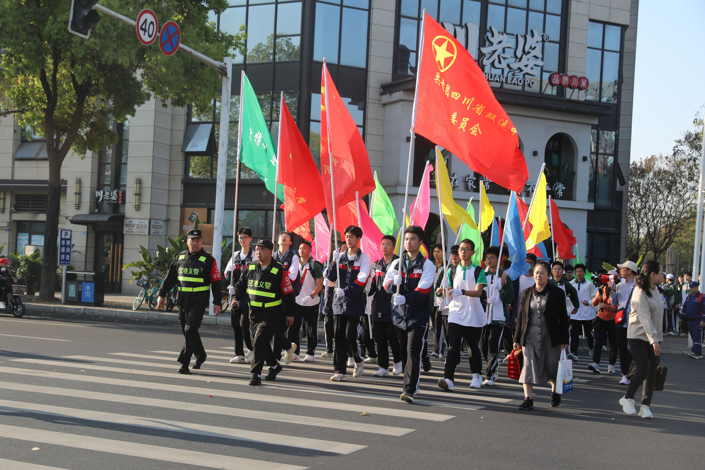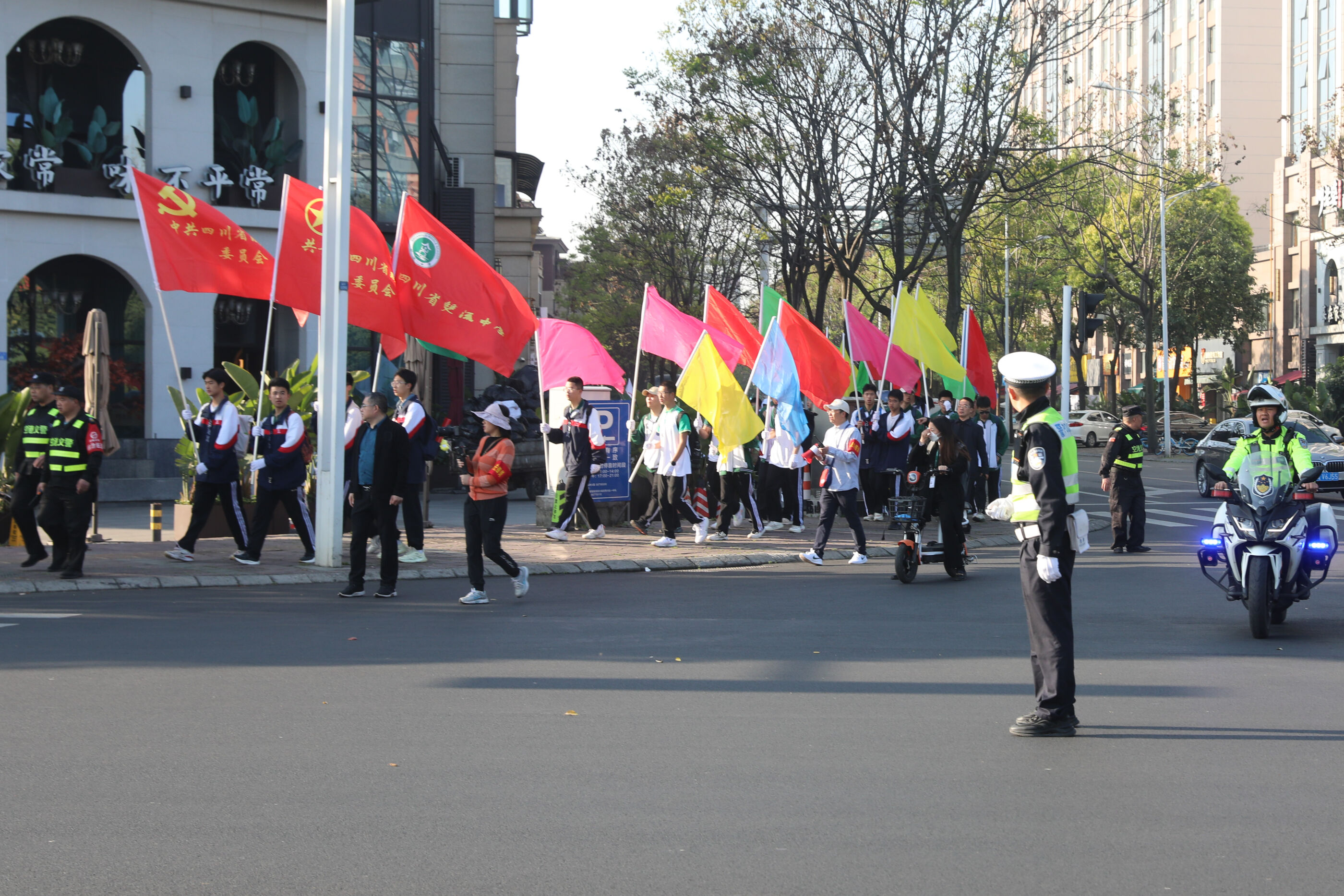在交警的護(hù)送下,隊(duì)伍有序過馬路