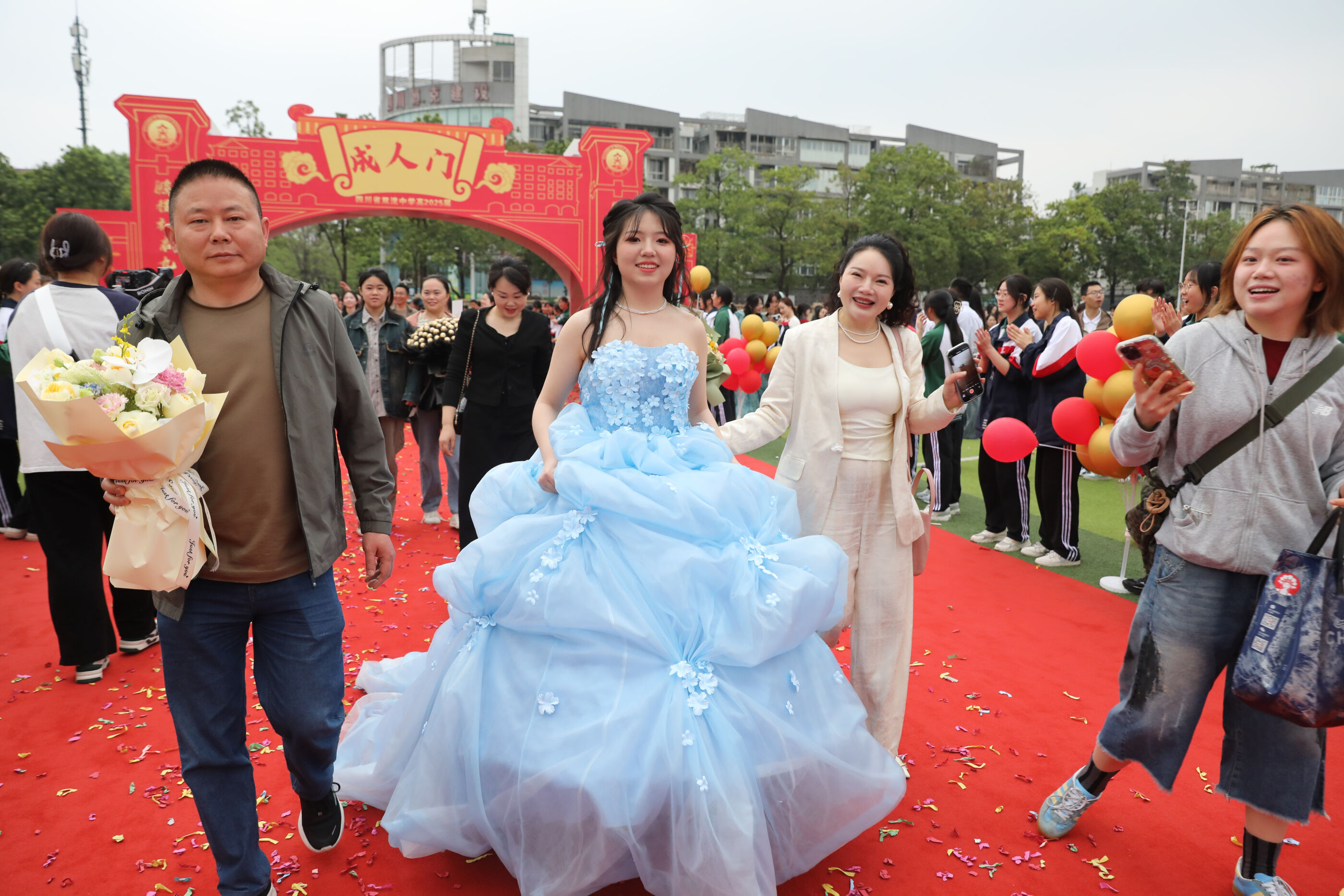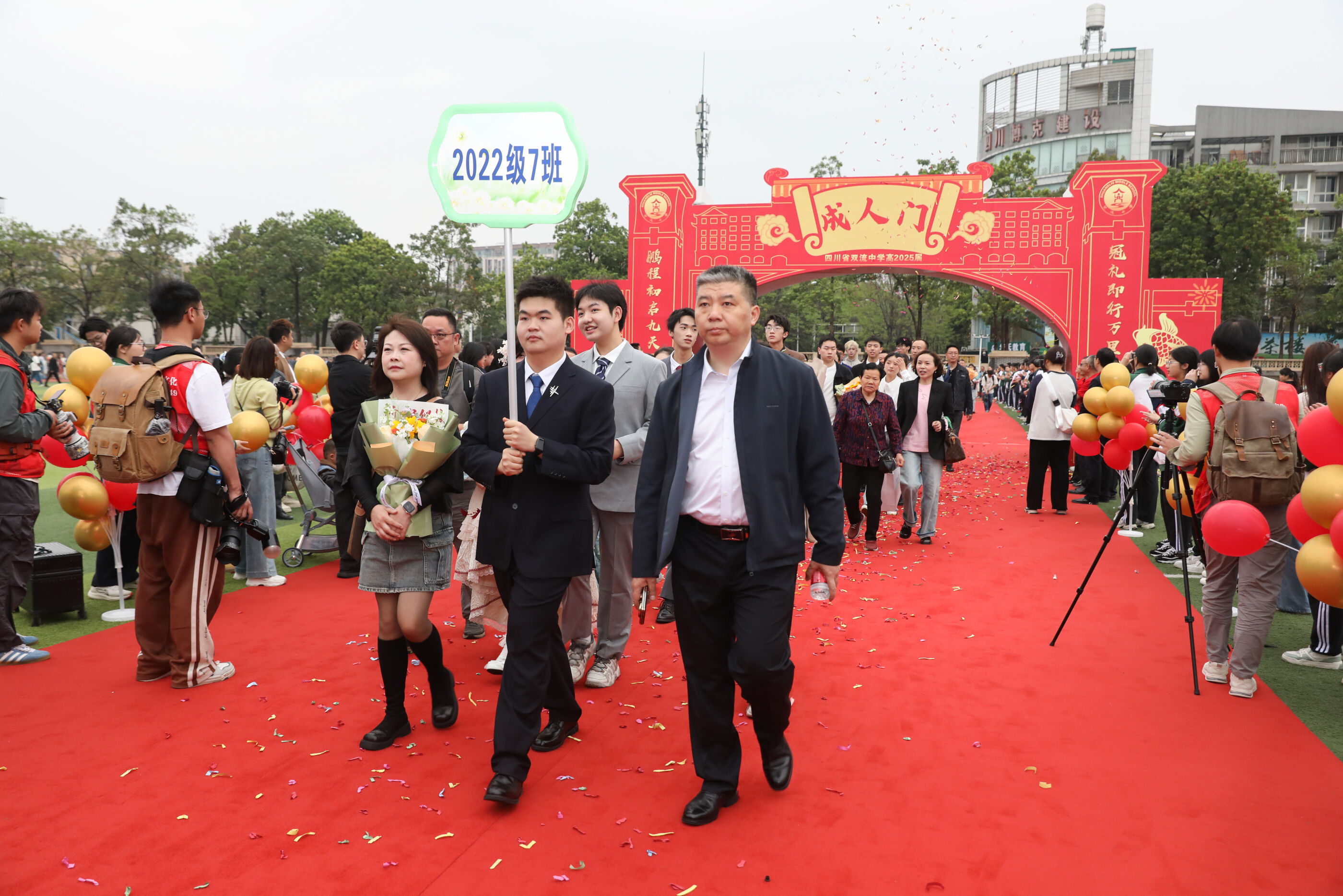 高三7班的學(xué)生在家長(zhǎng)陪同下通過成人門