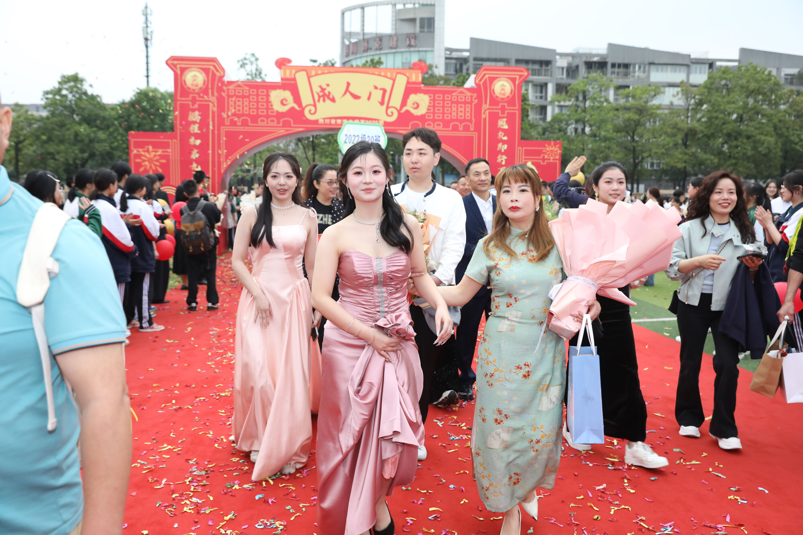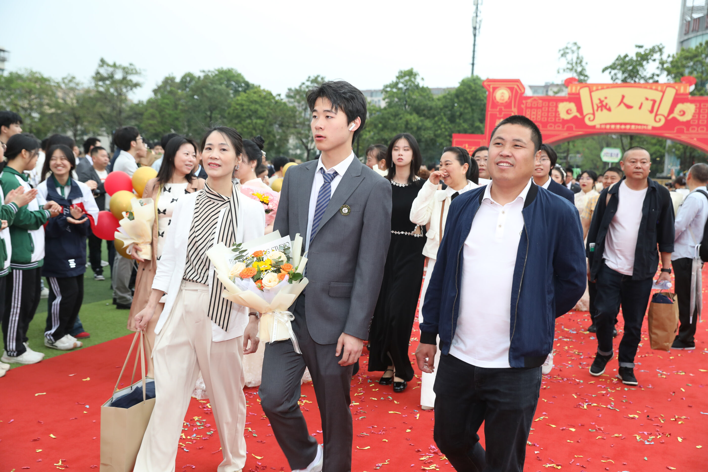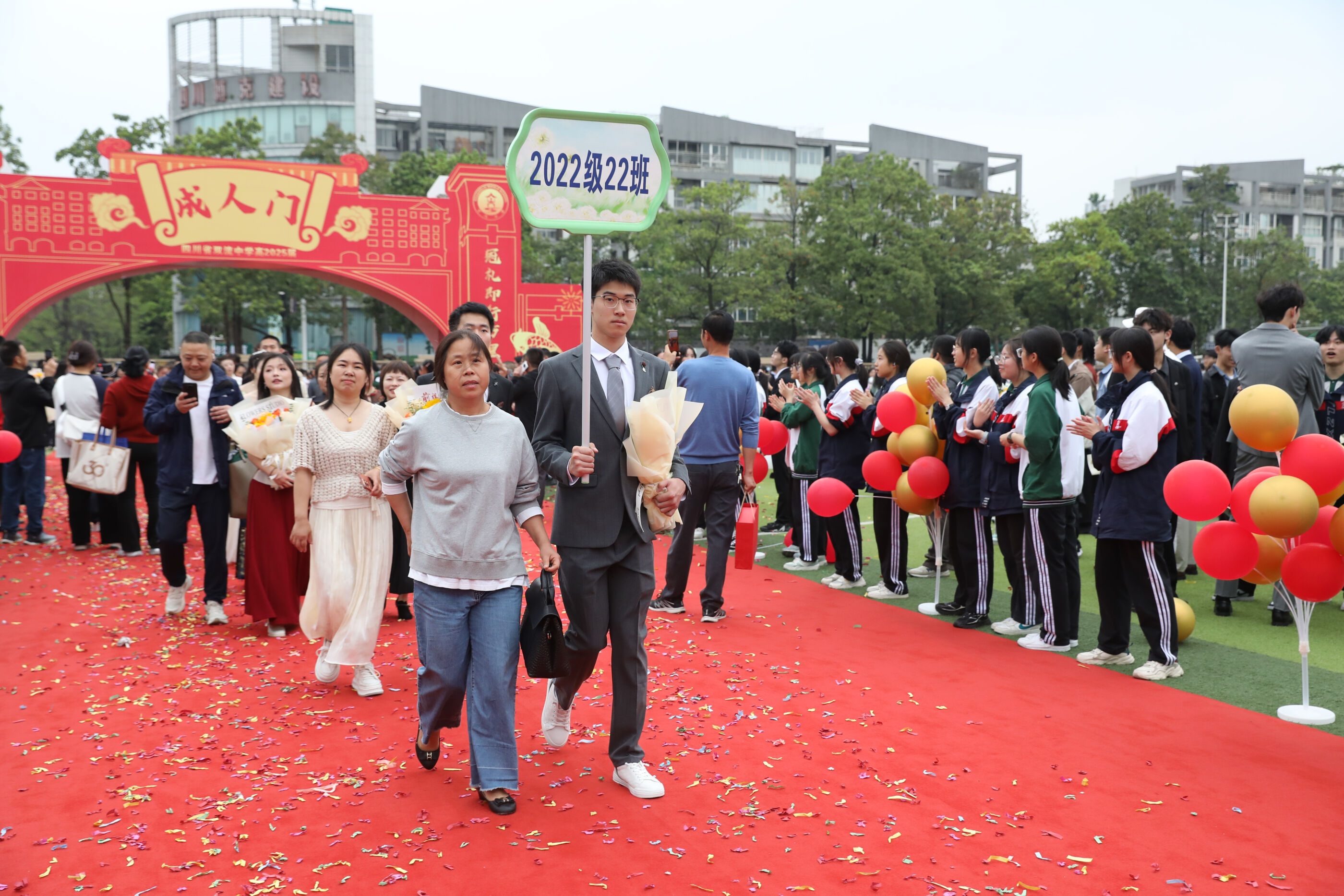 高三5班的學(xué)生在家長(zhǎng)陪同下通過成人門