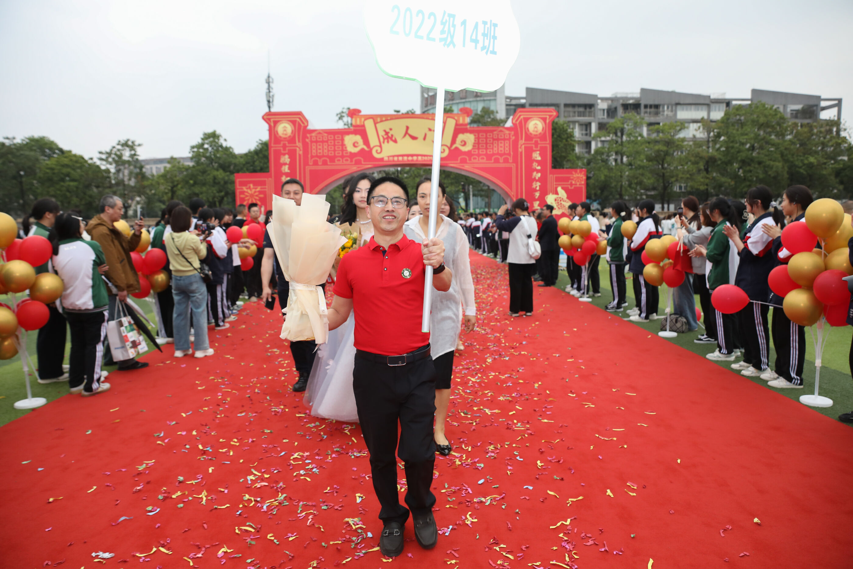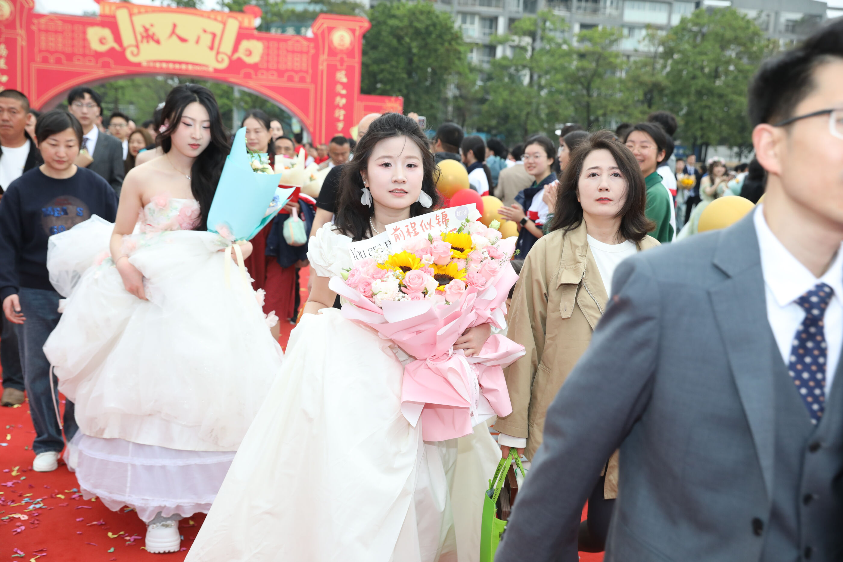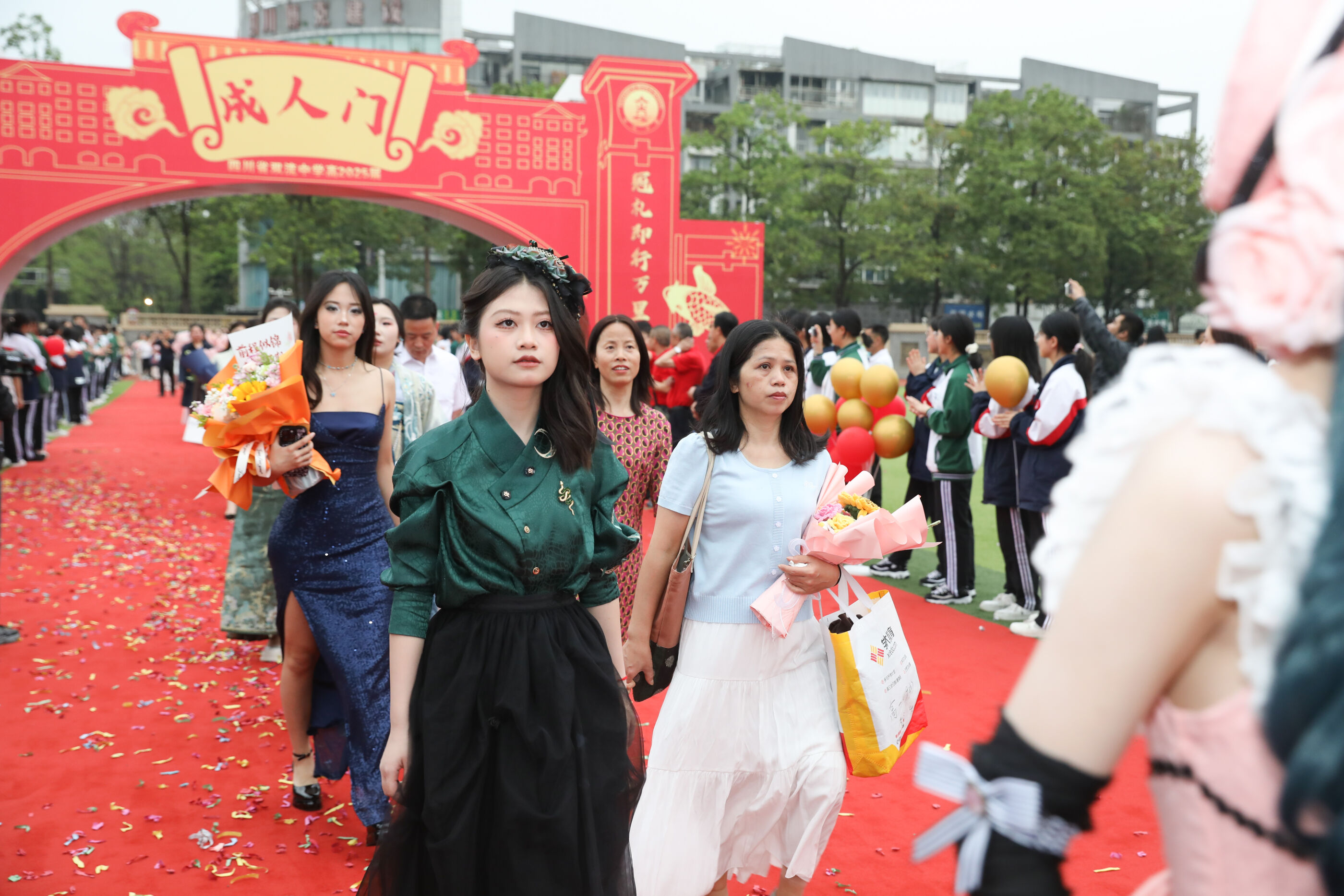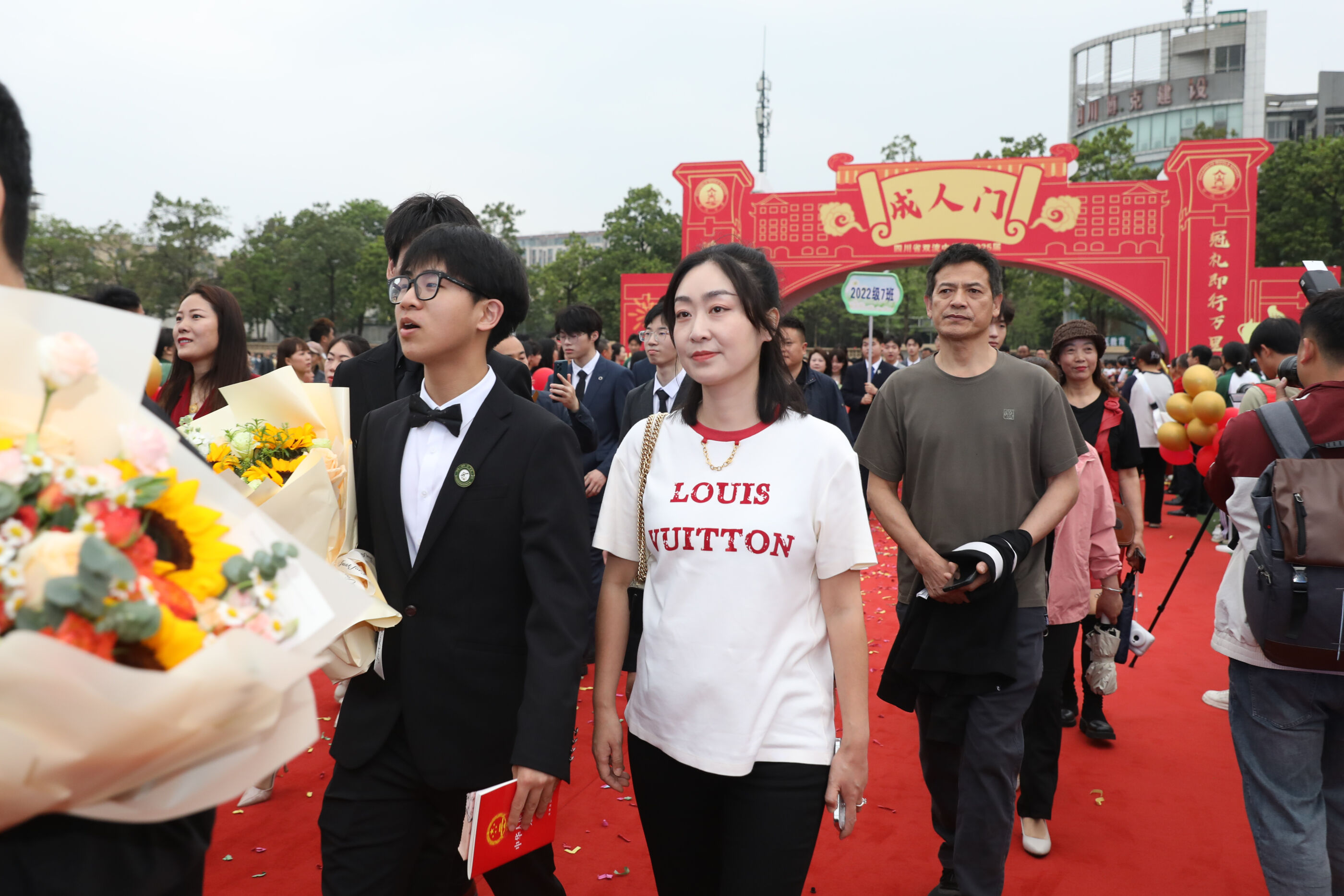 高三5班的學(xué)生在家長(zhǎng)陪同下通過成人門