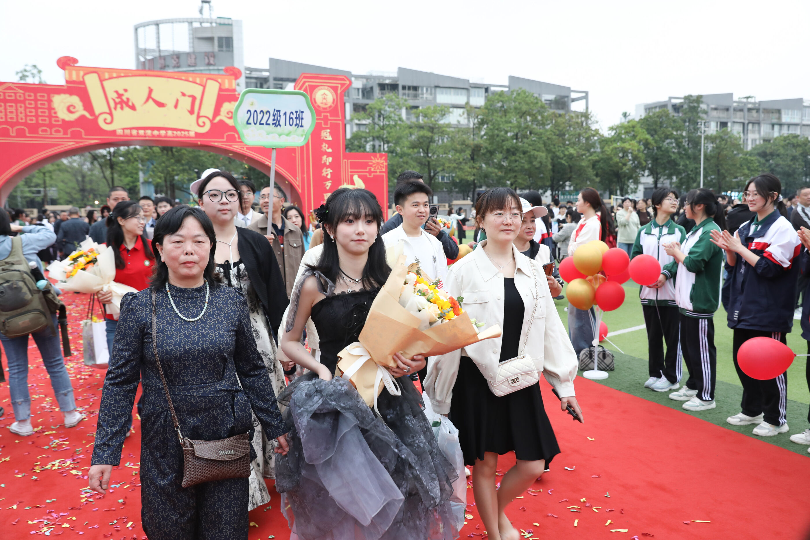 高三16班的學(xué)生在家長(zhǎng)陪同下通過成人門