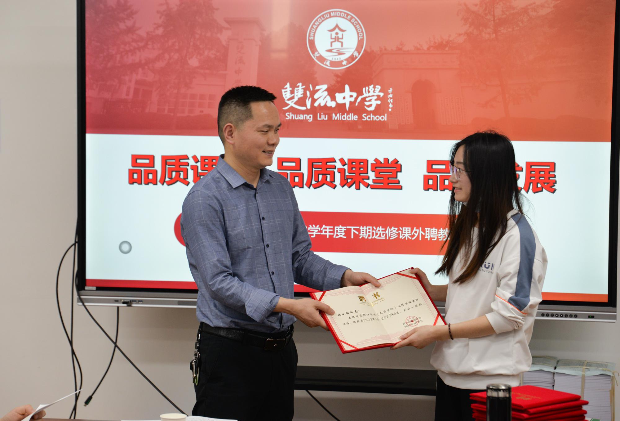 除了校內(nèi)老師開設(shè)的課程,雙流中學(xué)還積極引進(jìn)了大批熱愛教育的社會人士、高等教育學(xué)校專業(yè)人士進(jìn)校開課。2022年3月16日,雙流中學(xué)召開了校本課程校外兼職教師聘任會議,副校長徐天福、教務(wù)處副主任曾令勇出席了該會議。會上,曾主任對遠(yuǎn)程到來的來自高校和社會的外聘教師表示歡迎和感謝,為他們講解了雙流中學(xué)校本課程的開設(shè)理念與意義、實施方法。隨即,徐校長為各位老師頒發(fā)了聘書,并提出了課堂教學(xué)、常規(guī)管理等方面的具體要求。