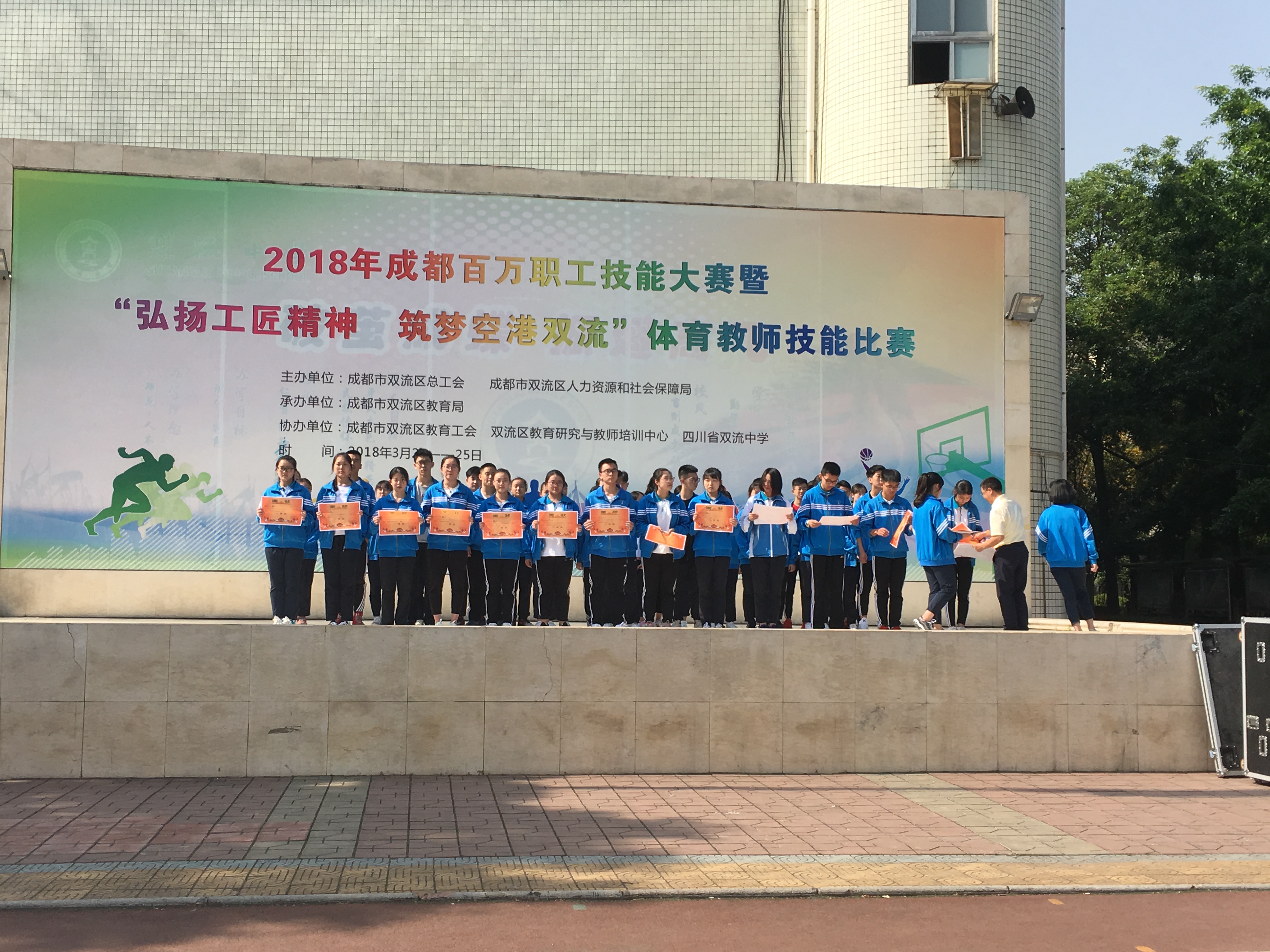 雙流中學(xué)龍清明校長上臺為獲獎班級頒獎。