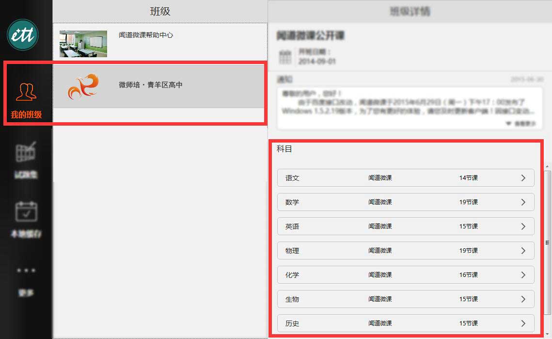 2、進(jìn)入平臺(tái)后,在“我的班級(jí)”界面選中所在班級(jí),在右側(cè)選擇相應(yīng)科目進(jìn)入。當(dāng)有新課發(fā)布時(shí),會(huì)有紅色小圓點(diǎn)提示。