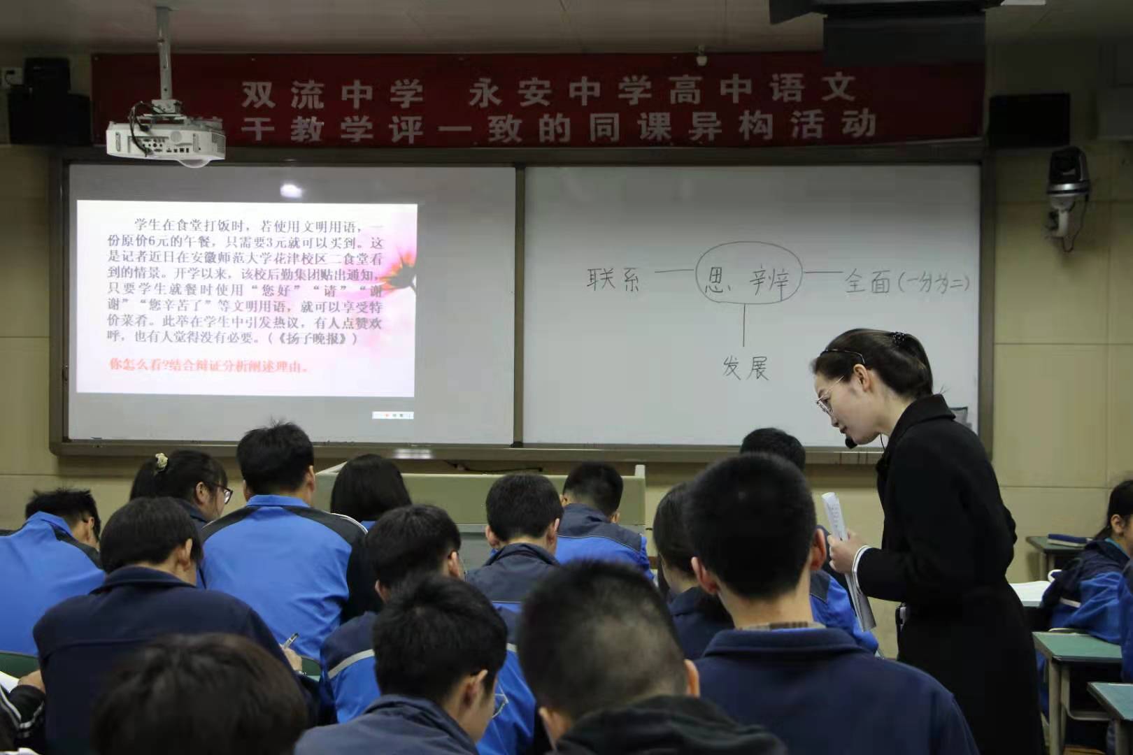 首先,由永安校區(qū)的青年教師蔣亞萍和雙流中學(xué)的名師李愛英以“善于思辨,學(xué)習(xí)辯證分析”為主題進(jìn)行同課異構(gòu)。