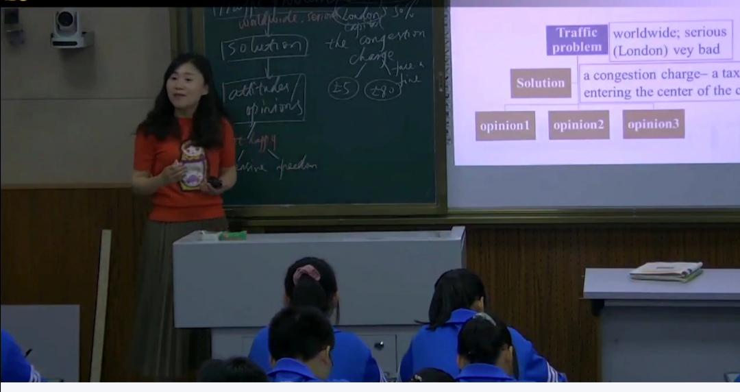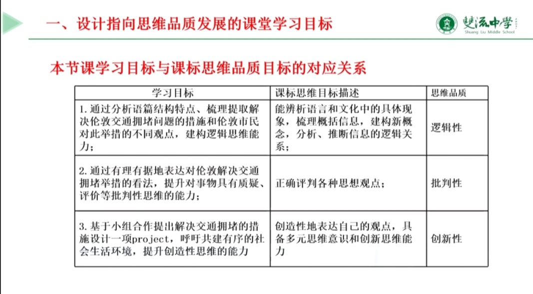 上午9點,活動準(zhǔn)時開始。李興勇老師介紹了到場的四位四川省雙流中學(xué)教師和本次活動的流程,隨即網(wǎng)絡(luò)研討課開始。課上,劉利勤老師圍繞培養(yǎng)學(xué)生的思維品質(zhì),設(shè)置各種學(xué)生活動,環(huán)環(huán)相扣,層層深入,探討語篇的主題意義。首先劉老師呈現(xiàn)London Congestion charge的路標(biāo),讓學(xué)生看、讀、思,引入了本節(jié)課的話題traffic jam,接下來劉老師引導(dǎo)學(xué)生閱讀文本,建構(gòu)語篇的宏觀結(jié)構(gòu)圖并完善語篇事實性信息,培養(yǎng)學(xué)生閱讀理解能力之邏輯思維能力。緊跟著,劉老師讓學(xué)生小組內(nèi)分享自己對倫敦交通擁堵費(fèi)的看法,培養(yǎng)學(xué)生有理有據(jù)發(fā)表自己觀點的批判性思維能力。緊跟著,劉老師引導(dǎo)學(xué)生們小組討論提出解決交通擁堵的措施并完成一項如海報;logo;廣告語;微視頻方案的project,呼吁共建有序的社會生活環(huán)境,這一環(huán)節(jié)的活動,學(xué)生們熱情高漲,創(chuàng)造性思維的火花迸發(fā)。最后,各個小組爭先恐后地上臺展示本組的project,上臺講訴的同學(xué)神采飛揚(yáng),底下傾聽的同學(xué)嘖嘖贊嘆,在一片片掌聲中,本堂課圓滿結(jié)束。