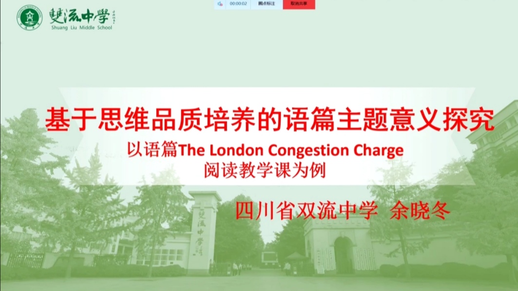 此次研討活動由兩個環(huán)節(jié)組成:第一,由四川省雙流中學(xué)劉利勤老師帶來“基于思維品質(zhì)培養(yǎng)的高中英語閱讀”研討課The London Congestion Charge;第二,“基于思維品質(zhì)培養(yǎng)的高中英語閱讀教學(xué)”專題研討,專題研討包含四個部分:首先劉利勤老師進(jìn)行課例說課,其次四川省雙流中學(xué)高中英語教研組長余曉冬老師進(jìn)行課例點評,接下來由四川省教育科學(xué)研究院高中英語兼職教研員李興勇老師進(jìn)行微講座《基于思維品質(zhì)培養(yǎng)的高中英語閱讀教學(xué)》;最后由四川省雙流中學(xué)高中英語巫麗娜、蔣玲兩位教師發(fā)表研討感言。