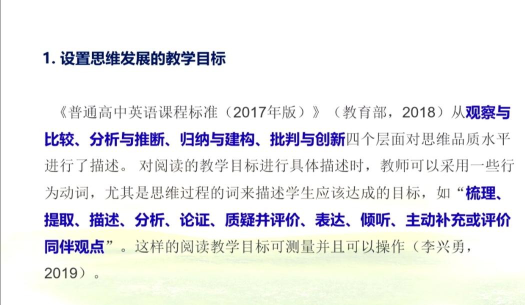 關(guān)于概念認(rèn)識,李老師通過梳理教育部課程標(biāo)準(zhǔn)和各種文獻(xiàn),闡述了什么是思維品質(zhì)、思維品質(zhì)發(fā)展目標(biāo)、思維品質(zhì)的內(nèi)容、思維品質(zhì)的層次等方面的內(nèi)容。關(guān)于現(xiàn)狀分析,李老師指出目前中小學(xué)英語閱讀教學(xué)中思維教學(xué)的意識的淡薄。關(guān)于培養(yǎng)策略,李老師提出:第一要設(shè)置思維發(fā)展的教學(xué)目標(biāo),在具體描述時,教師可采用如“梳理、提取、描述、分析、論證、質(zhì)疑并評價、表達(dá)、傾聽、主動補(bǔ)充或評價同伴觀點”等行為動詞讓其可操作可測量。同時,利用外研版選修7模塊2 Highlights of My Senior Year的案例進(jìn)行具體的分析和操作,詳細(xì)闡述怎樣設(shè)置思維發(fā)展的教學(xué)目標(biāo)。第二,要立足文本內(nèi)容,設(shè)計發(fā)展邏輯性思維的活動,列舉了邏輯性思維的表現(xiàn)并提出了培養(yǎng)邏輯性思維的途徑,同樣以Highlights of My Senior Year為例進(jìn)行闡釋。第三,要依托文本觀點,設(shè)計發(fā)展批判性思維的活動,李老師提出相關(guān)的培養(yǎng)途徑,如推斷言外之意等,通過以課例中問題的設(shè)置指導(dǎo)怎樣培養(yǎng)學(xué)生的批判性思維。第四,要聚焦語言運(yùn)用,設(shè)計發(fā)展創(chuàng)造性思維的活動,為學(xué)生語言的學(xué)習(xí)搭建支架,如開展讀后寫作,角色講述等培養(yǎng)途徑。第五,整合意義關(guān)聯(lián)的內(nèi)容,培養(yǎng)發(fā)展學(xué)生的分類比較和縱橫思維,從而培養(yǎng)出具有中國情懷、國際視野的人才。第六,設(shè)計鏈?zhǔn)降奶骄繉W(xué)習(xí)活動,讓思維培養(yǎng)有層次性,用教學(xué)情景主線把教學(xué)活動串聯(lián)起來,形成一條流暢、嚴(yán)密的邏輯鏈。關(guān)于啟示,李老師強(qiáng)調(diào),要將思維品質(zhì)發(fā)展和語言發(fā)展融合,并呈現(xiàn)了閱讀與思維發(fā)展過程。(圖10、11、12、13、14)