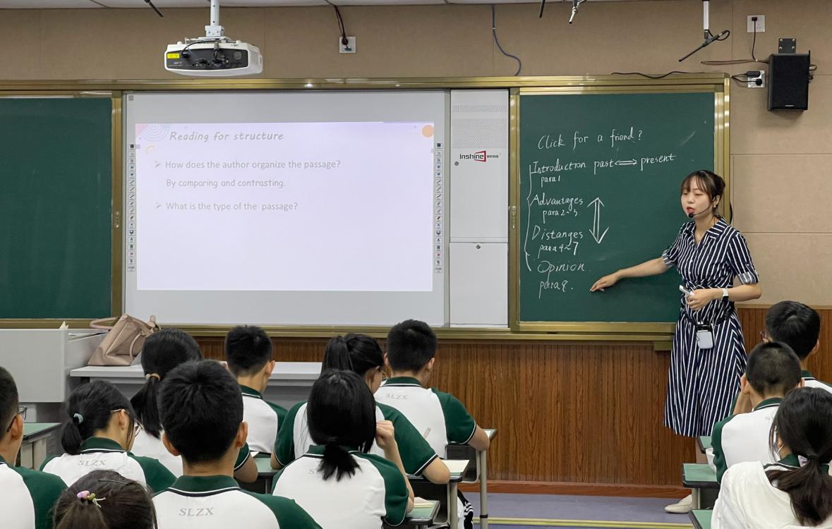 董文霞老師以友誼作為引入,探討科技與友誼的關(guān)系。同學(xué)們就標(biāo)題Click for a Friend?預(yù)測(cè)文本內(nèi)容和文章結(jié)構(gòu),引導(dǎo)同學(xué)們關(guān)注標(biāo)點(diǎn)符號(hào)所表達(dá)的意義。同學(xué)們通過(guò)思維導(dǎo)圖整理網(wǎng)絡(luò)交友的好處和壞處。最后董老師設(shè)置情景,“有一位朋友加你為好友,是否接受好友申請(qǐng)。接受之前需要注意什么,接受之后要注意什么”,對(duì)學(xué)習(xí)的知識(shí)進(jìn)行遷移創(chuàng)新。同學(xué)們?cè)谡n堂中能夠很好地跟著老師發(fā)散思維,理解文章行文邏輯,并能夠辨別網(wǎng)絡(luò)交友的利弊。