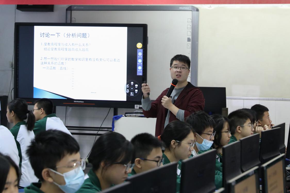 隨后是高鵬老師為大家?guī)淼囊浴毒幹朴?jì)算機(jī)程序解決問題》為主題的“教-學(xué)-評(píng)一致性”示范課。高鵬老師以“學(xué)歷與收入的大數(shù)據(jù)關(guān)系,編制程序預(yù)測(cè)畢業(yè)生的收入”為課堂研究任務(wù),帶領(lǐng)學(xué)生體驗(yàn)了使用Python編制計(jì)算機(jī)程序解決問題的過程。高鵬老師一步步引導(dǎo)學(xué)生從分析問題,數(shù)據(jù)的收集與處理出發(fā),使用計(jì)算機(jī)程序解決問題的思維來設(shè)計(jì)出解決問題的算法。學(xué)生通過設(shè)計(jì)算法流程圖的方式體驗(yàn)了編制計(jì)算機(jī)程序解決問題的過程,也親歷了計(jì)算機(jī)在處理大數(shù)據(jù)問題的方法和優(yōu)勢(shì),最終通過運(yùn)行與修改程序,實(shí)現(xiàn)了利用已有學(xué)歷數(shù)據(jù)預(yù)測(cè)年收入的功能。高老師的課深入淺出,將一個(gè)看似復(fù)雜的問題,通過層層剖析,最終用計(jì)算機(jī)程序?qū)崿F(xiàn),學(xué)生不僅體驗(yàn)了大數(shù)據(jù)預(yù)測(cè)的方法,更體驗(yàn)了計(jì)算機(jī)程序解決問題的整個(gè)過程,對(duì)提升計(jì)算思維能力有很大幫助。
