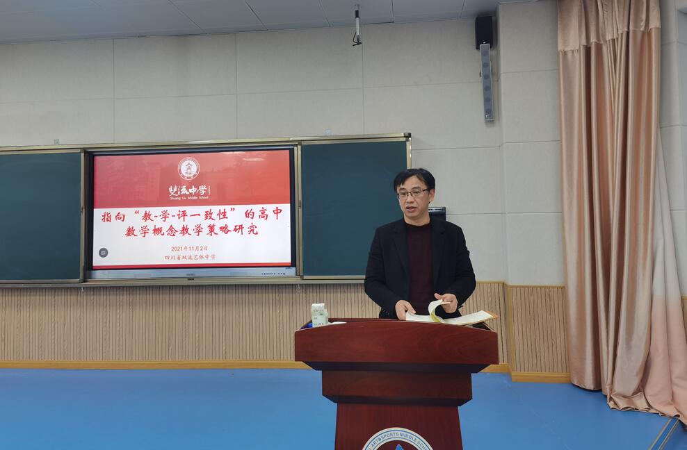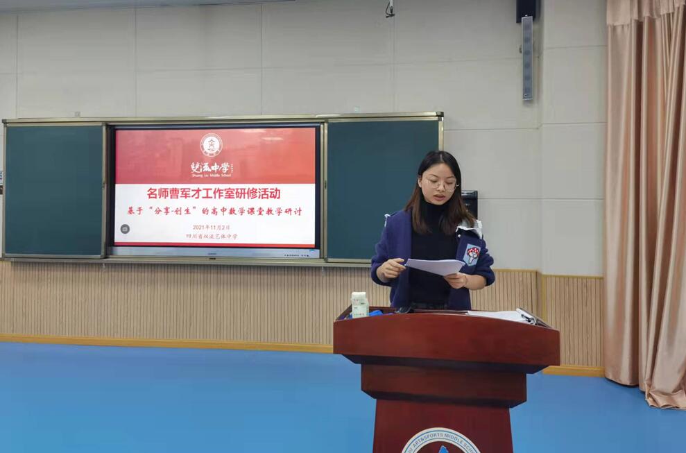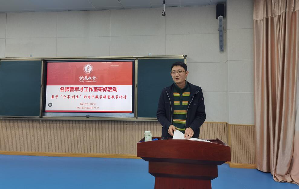 2021年11月2日下午14:00,成都市雙流區(qū)名師“曹軍才工作室”在四川省雙流藝體中學(xué)成功舉行“基于分享創(chuàng)生的高中數(shù)學(xué)課堂教學(xué)研討會”。會議特別邀請四川省教科院中學(xué)數(shù)學(xué)教研員、普通高中教育研究所所長、中小學(xué)正高級教師、四川省特級教師、四川省首批名師工作室領(lǐng)銜人吳中林所長蒞臨指導(dǎo);會議還邀請四川省雙流藝體中學(xué)教務(wù)處謝遠凈主任以及四川省雙流中學(xué)成都市優(yōu)秀教師喻立楊老師進行現(xiàn)場指導(dǎo)。雙流區(qū)高中數(shù)學(xué)名師領(lǐng)銜人曹軍才老師、工作室13名學(xué)員、區(qū)級“教-學(xué)-評一致性”課題組成員、藝體中學(xué)數(shù)學(xué)組教師參與此次活動。研修活動由學(xué)員李莎莎老師主持。