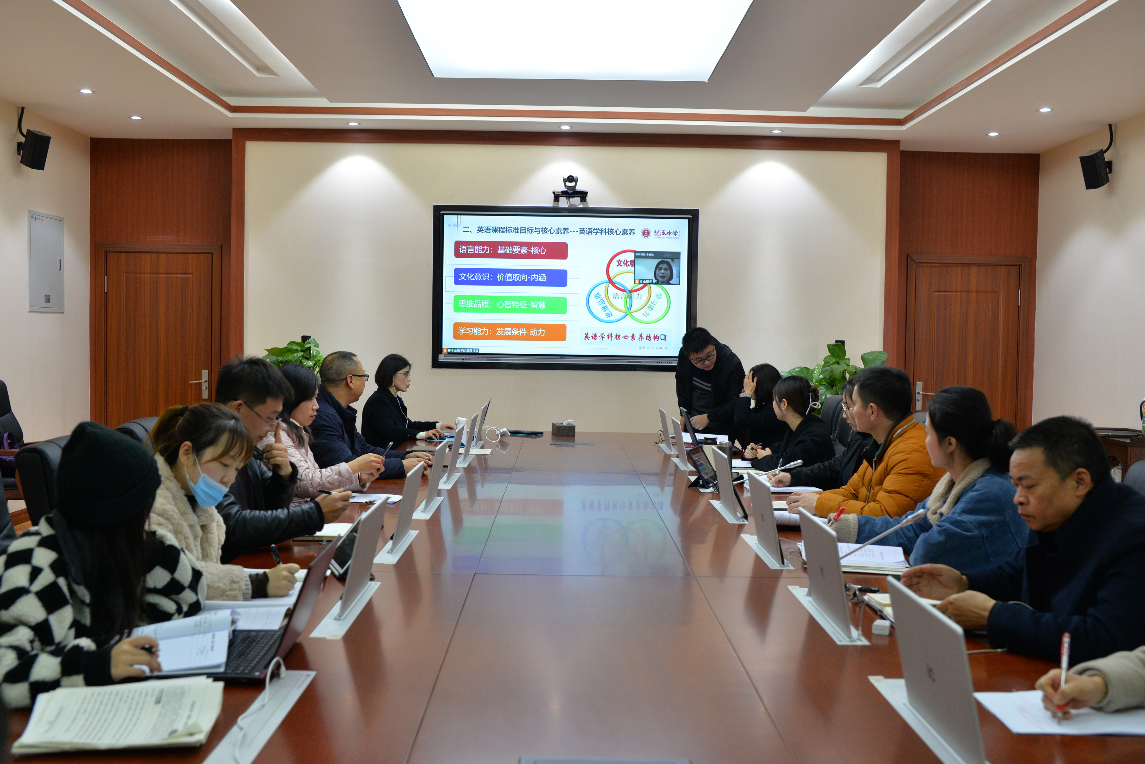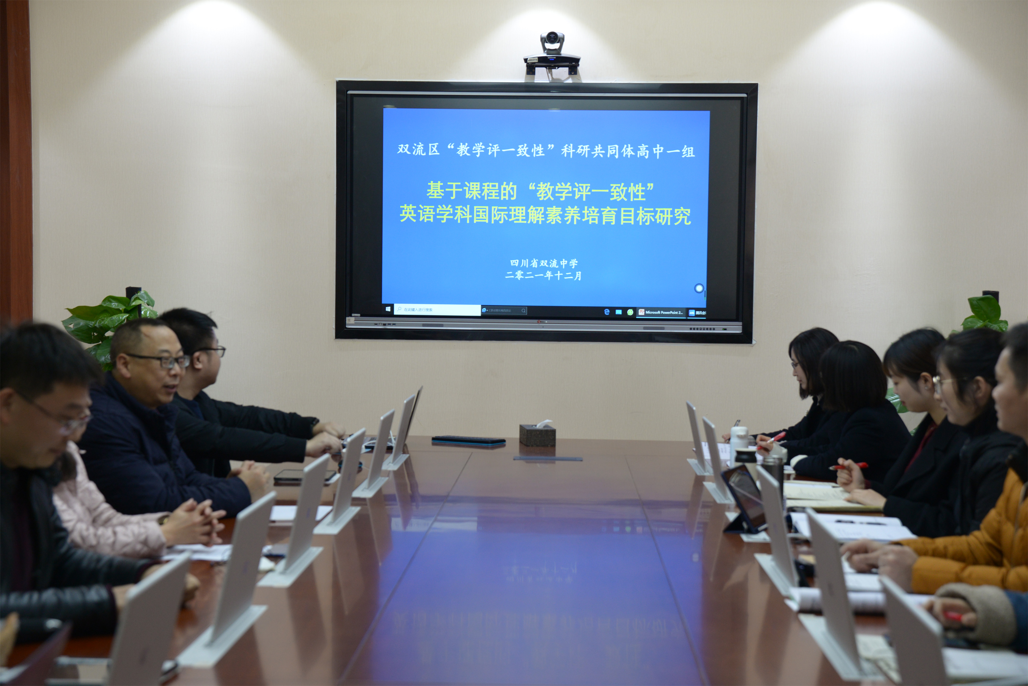 為進(jìn)一步深化科研興教、科研興校理念,推進(jìn)經(jīng)驗(yàn)交流與分享,深入調(diào)動(dòng)教師開展課題研究的積極性與主動(dòng)性,營(yíng)造濃郁的校園科研氛圍,2021年12月2日,雙流區(qū)“教學(xué)評(píng)一致性”科研共同體高中一組之“基于課程的教學(xué)評(píng)一致性英語學(xué)科國(guó)際理解素養(yǎng)培育目標(biāo)研究”專題研修活動(dòng)在雙流中學(xué)景賢樓521會(huì)議室舉行,本次聯(lián)組研修活動(dòng)采取了線上線下結(jié)合的方式。雙流區(qū)課題聯(lián)組指導(dǎo)員陳麗主任、雙流中學(xué)副校長(zhǎng)徐天福、雙流中學(xué)研培處主任彭春暉、高中一組八個(gè)課題負(fù)責(zé)人及主研教師參與了本次教研活動(dòng)。(圖片一、二)
