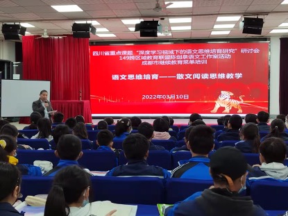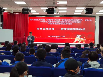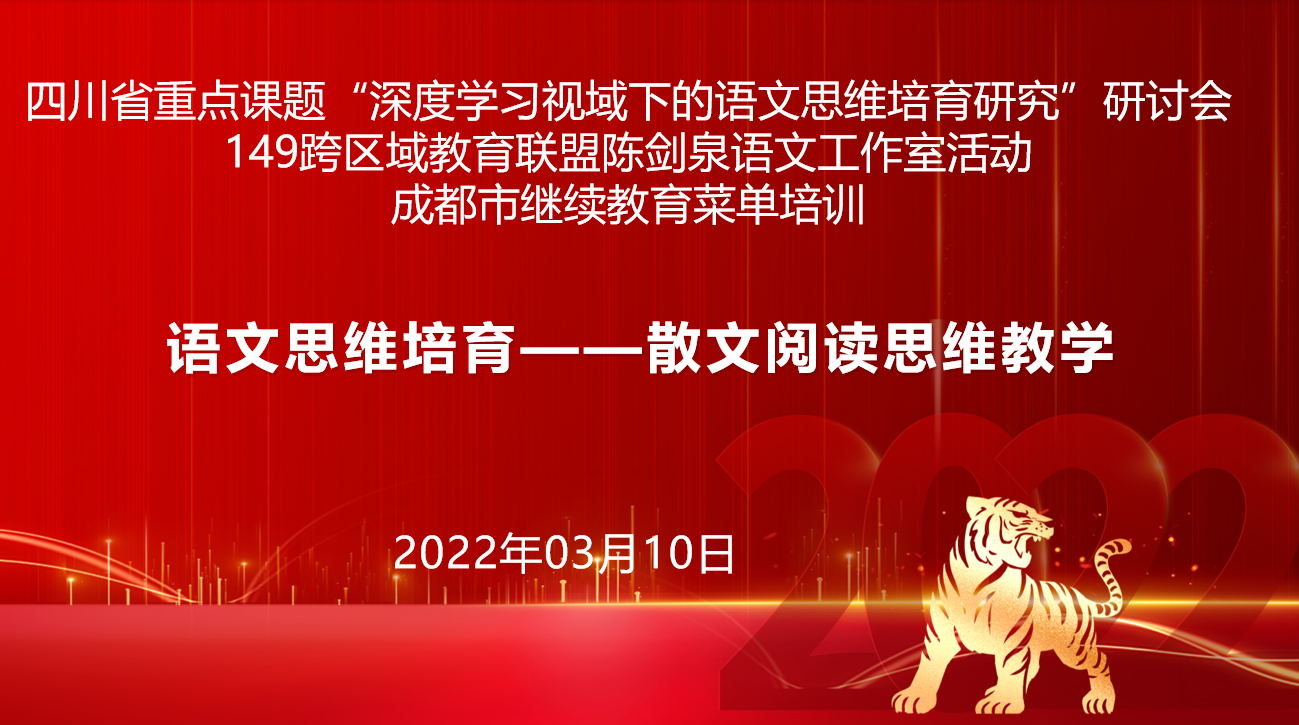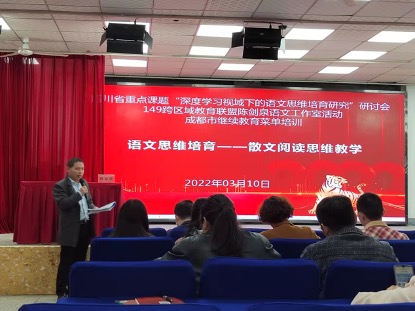 12022年3月10日上午,由四川省雙流中學承辦的成都市教師發(fā)展基地校語文學科春季菜單培訓在永安中學成功舉行。本次培訓由149跨區(qū)域教育聯(lián)盟陳劍泉語文工作室籌劃和實施,是四川省重點課題“深度學習視域的語文思維培育研究”的參研成員貢獻的一次專題研討活動。本次培訓以“語文思維培育——散文閱讀思維教學”為主題,線上直播活動和線下展示活動同時進行,線上直播活動在成都中小學教師繼續(xù)教育網(wǎng)和騰訊會議上同步開展,方便課題組其他成員及老師們在線觀摩。來自江蘇、浙江、山東、云南以及四川省除成都市以外的地市州學校參研教師通過騰訊會議遠程觀摩,成都市的參研人員、語文老師及149聯(lián)盟的高中老師通過師培通平臺參加研討。