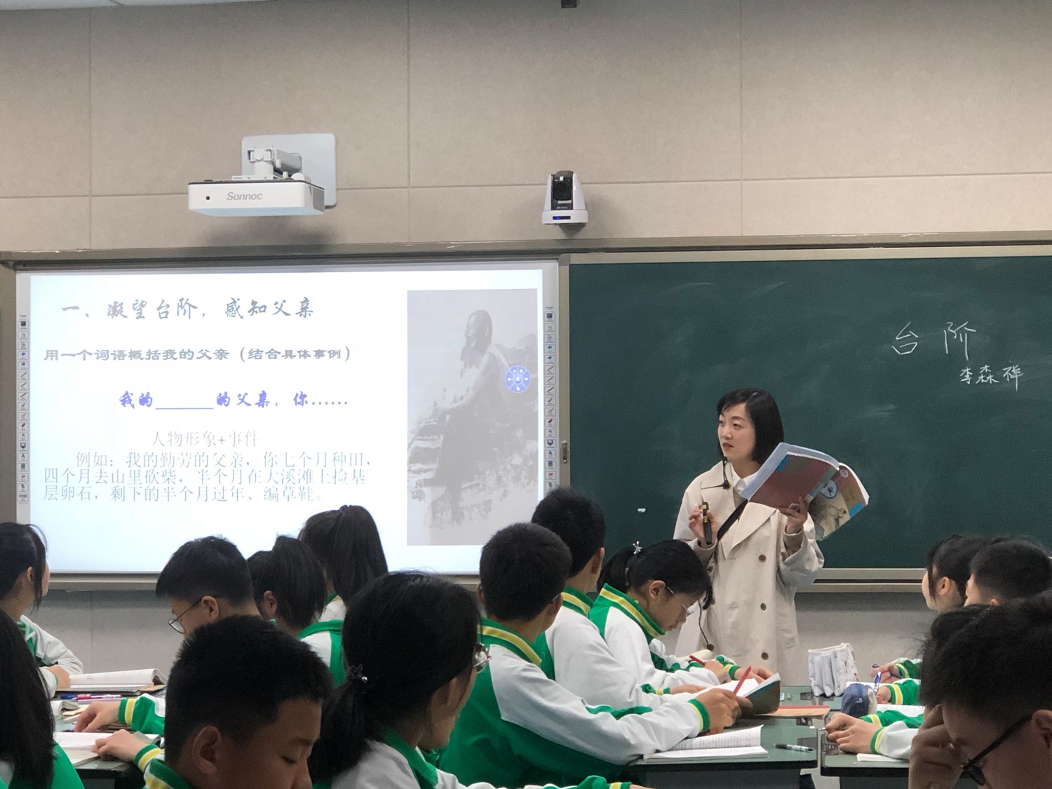 楊婉妮老師執(zhí)教《臺(tái)階》。楊老師首先請(qǐng)學(xué)生結(jié)合事件用一個(gè)詞概括父親的形象,以“我的     的父親,你......”的形式,在鍛煉學(xué)生的語(yǔ)言組織表達(dá)能力的同時(shí)加深學(xué)生對(duì)父親形象的感知。隨后,楊老師抓住父親修完臺(tái)階后的“不知所措”,引導(dǎo)學(xué)生抓細(xì)節(jié),從父親修臺(tái)階前后的變化中分析父親“不自適”的原因。最后,楊老師引導(dǎo)學(xué)生進(jìn)行拓展延伸,在勾連生活的過(guò)程中感受“父親”所代表的群體形象。