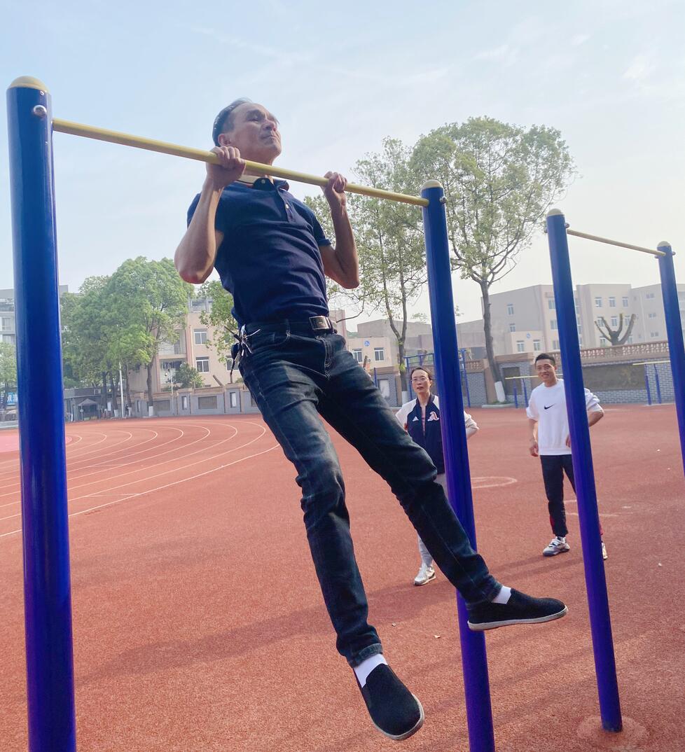 年過五旬的譚書華老師,毅然示范引體向上,以連續(xù)完成30個的成績驚訝全場,可謂老當(dāng)益壯,不墜青云志!