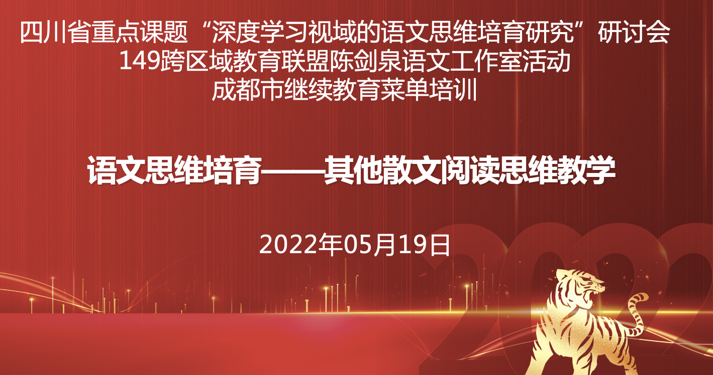 2022年5月19日上午,由四川省雙流中學(xué)承辦的成都市教師發(fā)展基地校語文學(xué)科春季菜單培訓(xùn)成功舉行,本次活動由149聯(lián)盟陳劍泉語文工作室策劃進行,主題為“語文思維培育——其他散文閱讀思維教學(xué)”,全程均采取線上活動的形式,在成都中小學(xué)教師繼續(xù)教育網(wǎng)和騰訊會議上同步開展,以方便課題組其他成員及老師們在線觀摩。成都市的參研人員、語文老師及149聯(lián)盟的高中老師通過師培通平臺參加在線研討,來自成都市之外學(xué)校的教師們通過騰訊會議遠程觀摩。