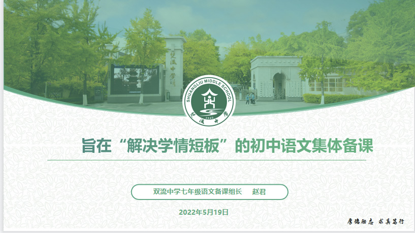 在雙流區(qū)初中語文教研線上培訓(xùn)會中,雙流中學(xué)初一語文備課組組長趙君老師分享了“旨在‘解決學(xué)情短板’的集體備課研討活動”,該活動給雙流區(qū)初中語文備課組教研活動做了很好的示范,起了很好的帶頭作用。雙流區(qū)初中語文教研員李艾琳老師對雙流中學(xué)初中語文備課組給予了高度評價。