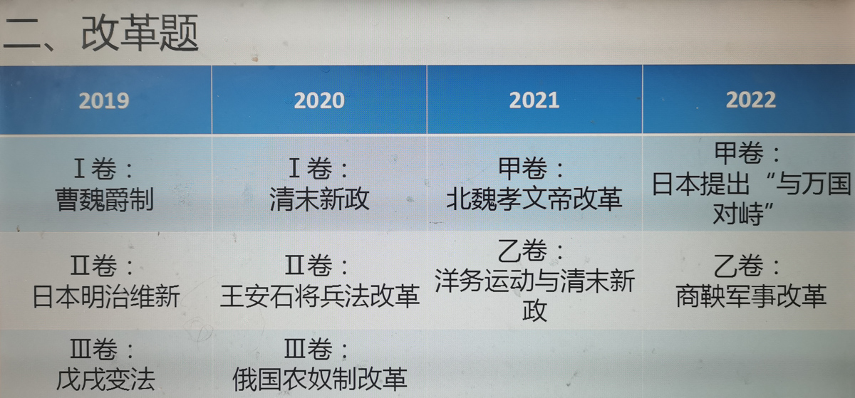 陳老師還對選做題進行了分析。近四年的改革類題目基本選取教材涉及的主要改革(商鞅變法、孝文帝改革、王安石變法、戊戌變法、清末新政、俄國農(nóng)奴制改革、日本明治維新),但多以小切口命題形式出現(xiàn)。教師需要引導(dǎo)學(xué)生夯實改革史的核心改革必備知識、總結(jié)小切口題的答題維度。近四年的人物評價類題目全部選取中國史人物,不涉及世界史部分,采取的依托試題材料信息和所學(xué),考查學(xué)生必備知識、關(guān)鍵能力和學(xué)科思維的小切口命題。針對材料的不可預(yù)測性,教師應(yīng)該重視方法的總結(jié)訓(xùn)練。