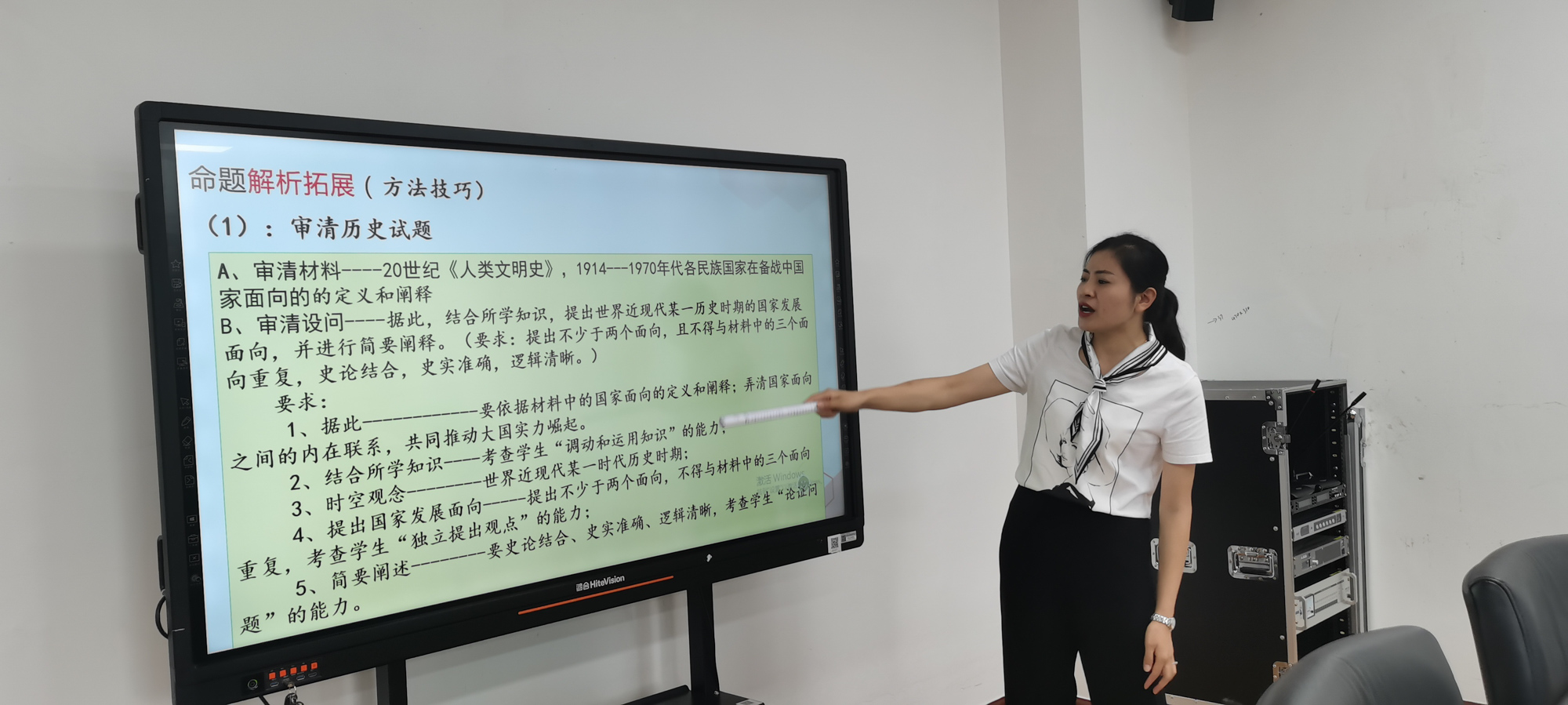 最后由高二備課組長李萍老師對開放性試題進行了分析交流。開放性試題是高考試題中對學(xué)生來說難度較大的題目,其開放和靈活多變的形式對學(xué)生是一種挑戰(zhàn)。通過設(shè)置開放性試題,加強對學(xué)生獨立思考和歷史思維能力的考查,鼓勵學(xué)生從不同角度發(fā)現(xiàn)和提出問題,多角度分析問題,引導(dǎo)高中教學(xué)改變追求唯一標(biāo)準(zhǔn)答案,總結(jié)答題套路、機械、固化的訓(xùn)練模式,促進學(xué)生主動學(xué)習(xí)。面對靈活多變的開放性試題先要讀透讀懂題干,錨定答題方向。在進行闡述時要注重邏輯建構(gòu),格式規(guī)范、卷面整潔。這道題要得高分還要注意語言要寫出歷史學(xué)科味道和體現(xiàn)主流價值。