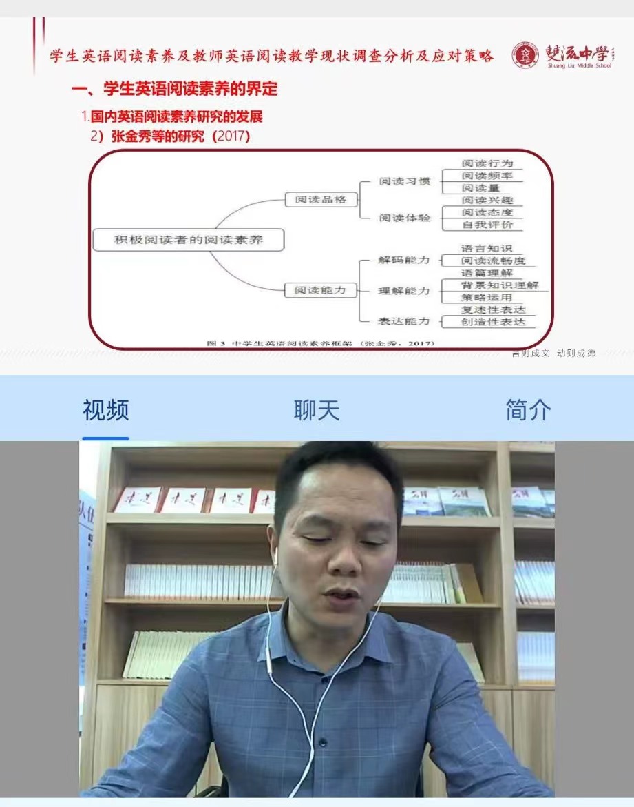 首先,雙流中學徐天福副校長帶來了主題為《英語閱讀素養(yǎng)與英語閱讀教學現(xiàn)狀問題分析及應(yīng)對策略》的講座?;趯τ⒄Z閱讀素養(yǎng)的界定、對學生閱讀素養(yǎng)和教師閱讀教學現(xiàn)狀進行調(diào)查,徐老師提出了踐行語言、思維、文化融為一體的英語學習活動,從而提升學生英語閱讀素養(yǎng)。具體而言,通過對英語閱讀素養(yǎng)研究的發(fā)展進行文獻綜述后,梳理出了雙流中學學生英語閱讀素養(yǎng)框架。學生英語閱讀素養(yǎng)現(xiàn)狀調(diào)查的問卷反映出了學生閱讀興趣薄弱,缺乏內(nèi)在閱讀動機;閱讀習慣不佳,缺失自主閱讀能力;閱讀策略缺失,閱讀效率低效;閱讀面狹窄,難以提升文化意識等問題。據(jù)此,提出了教師教學應(yīng)關(guān)注主題意義探究,踐行英語學習活動觀,實現(xiàn)語言、思維、文化融為一體的深度學習。