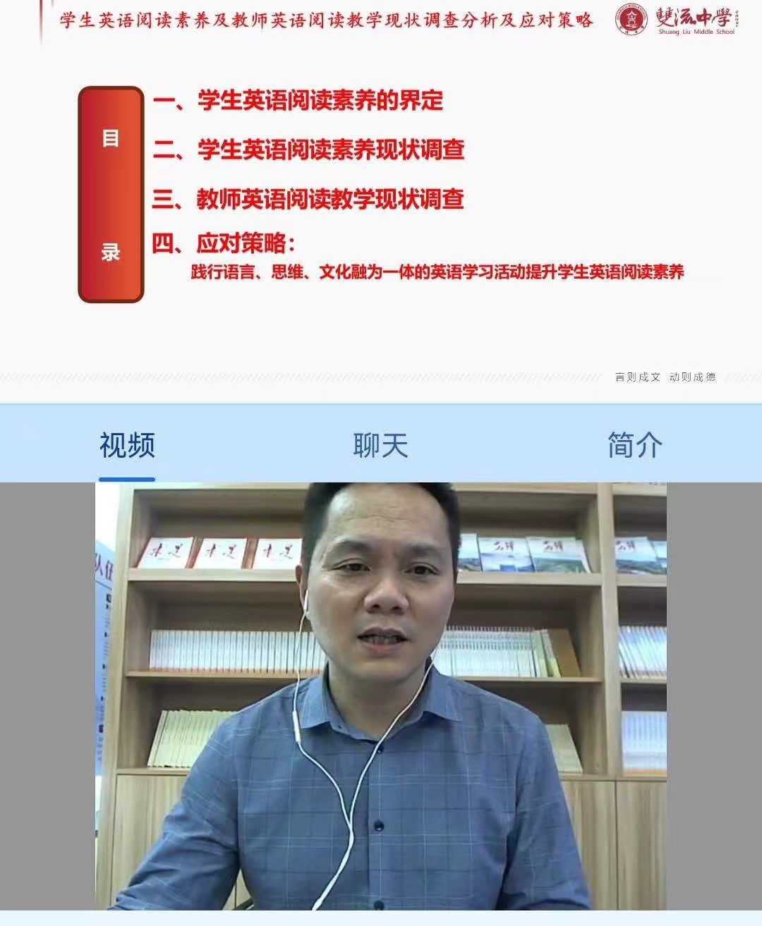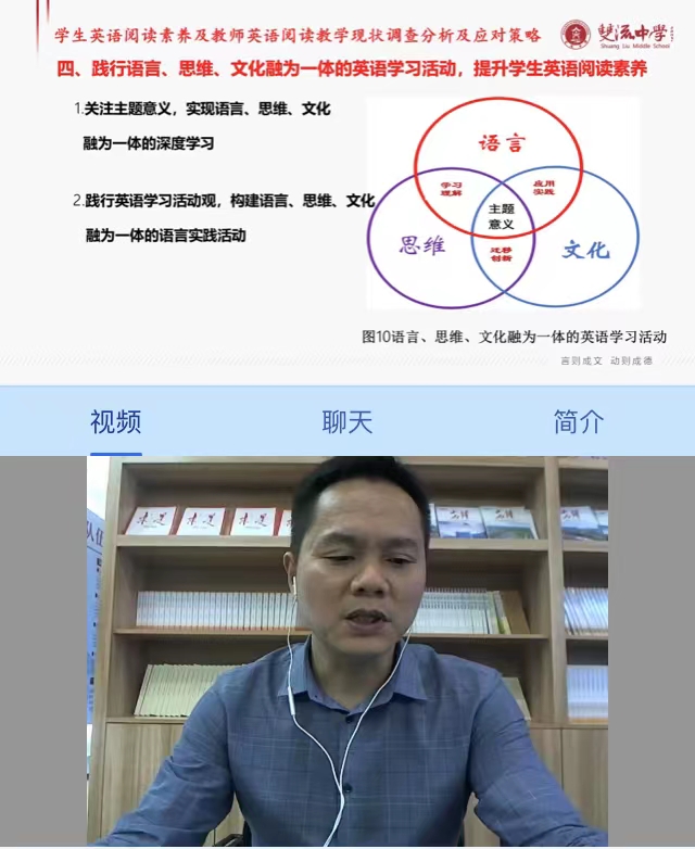 普通高中英語課程標準指出,英語課程應(yīng)該把對主題意義的探究視為教與學的核心任務(wù),并以此整合學習內(nèi)容,引領(lǐng)學生語言能力、文化意識、思維品質(zhì)和學習能力的融合發(fā)展。三位優(yōu)秀教師用講座和課例展示,共同呈現(xiàn)了踐行語言、思維、文化融為一體的英語學習活動,提升學生英語閱讀素養(yǎng)的策略和路徑。今后雙流中學的全體英語教師將繼續(xù)群策群力,深耕教研,踐行課標理念,助力學生發(fā)展!