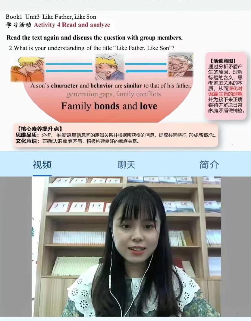 羅芳梅老師呈現(xiàn)了外研版新教材Book 1 Unit 3 Like Father, Like Son的課例說課。本語篇為戲劇,講述了父親與兒子由于立場不同,就兒子的未來職業(yè)規(guī)劃產(chǎn)生分歧和沖突,并最終由祖父調(diào)和的故事,傳達“正確認識家庭沖突,構(gòu)建良好家庭關(guān)系”的家庭觀。羅老師以主題意義探究為核心任務(wù),以層層遞進的問題鏈驅(qū)動學生語言、思維、文化融合發(fā)展。在問題鏈引領(lǐng)下,學生梳理概括家庭沖突發(fā)展過程,構(gòu)建語篇信息結(jié)構(gòu)圖并落實語言學習;分析家庭沖突產(chǎn)生原因并解讀標題含義,探究主題意義;最后聯(lián)系自身生活,正確處理自己的家庭沖突,實現(xiàn)語言的感知、理解、運用與遷移。學生通過梳理概括語篇信息,辨析評判語篇信息并運用所學批判性地審視、解決生活中的問題,促進邏輯性、批判性及創(chuàng)新性思維的鍛煉與發(fā)展。學生的文化認知從認識到因職業(yè)規(guī)劃產(chǎn)生的家庭分歧和沖突,到樹立正確的家庭觀,再到踐行正確的家庭觀,實現(xiàn)知行合一。本堂課通過學習理解、應(yīng)用實踐、遷移創(chuàng)新等層層遞進的語言、思維、文化融合的活動,逐步引導學生加深對主題意義的理解與運用。