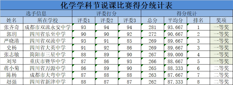 最后,王教授宣布了本次說課比賽的獲獎(jiǎng)結(jié)果,雙流永安中學(xué)張齊奇老師以優(yōu)異的成績(jī)獲得第一名,同時(shí)祝賀其他老師取得優(yōu)秀的成績(jī)。