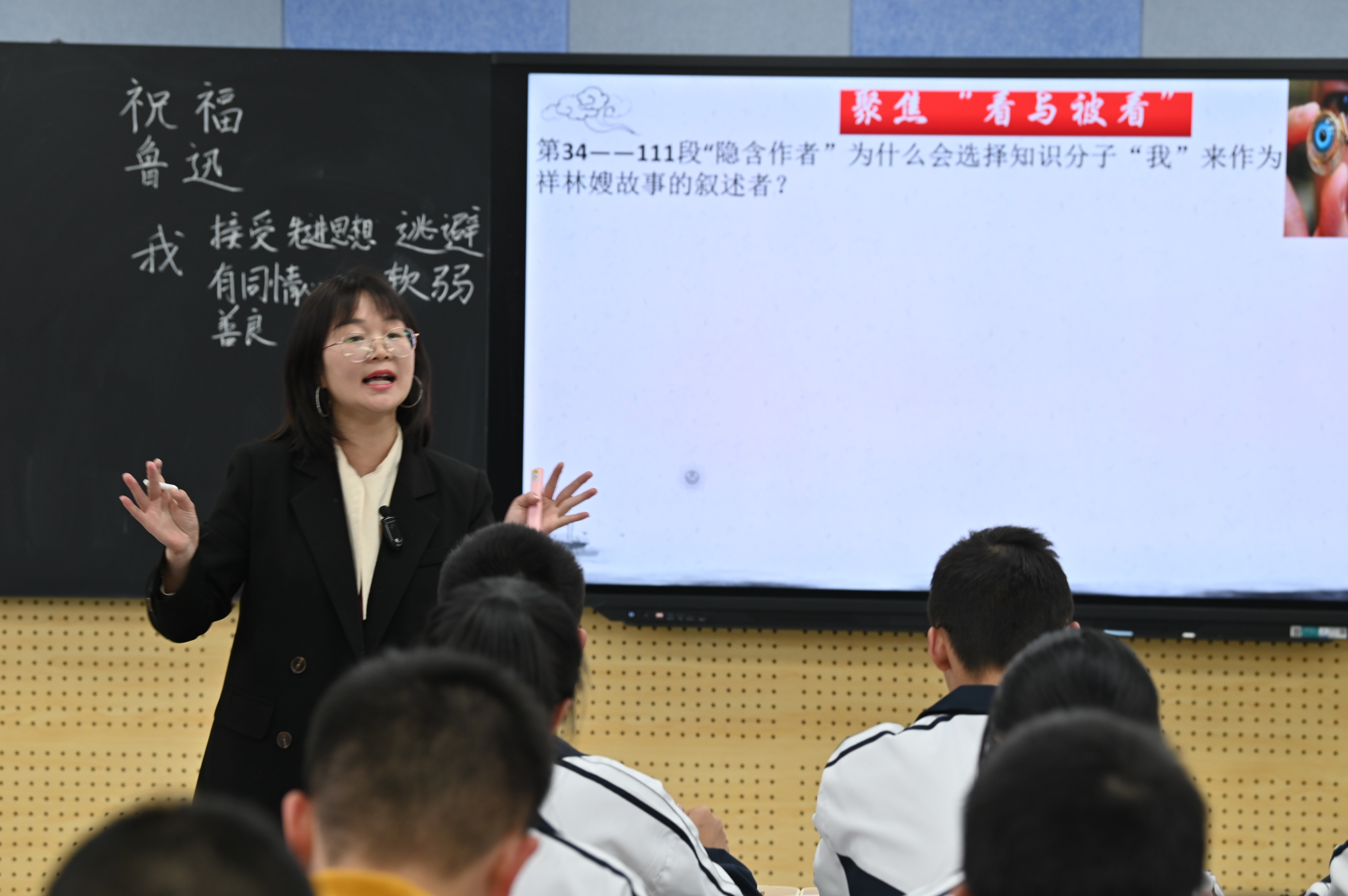 四川省大英中學(xué)柯麗娟老師帶領(lǐng)我們探究《祝?!返摹翱磁c被看”,傾聽時代之聲??蔓惥昀蠋熂ぐl(fā)和引導(dǎo)學(xué)生從文本細節(jié)處去概括“我的形象”;問題設(shè)置難度逐步加深,以啟發(fā)式的教學(xué)語言促進學(xué)生的思維品質(zhì)的提升;以一種全新解讀文本的方式——隱含作者走進作品,揭示主旨。
