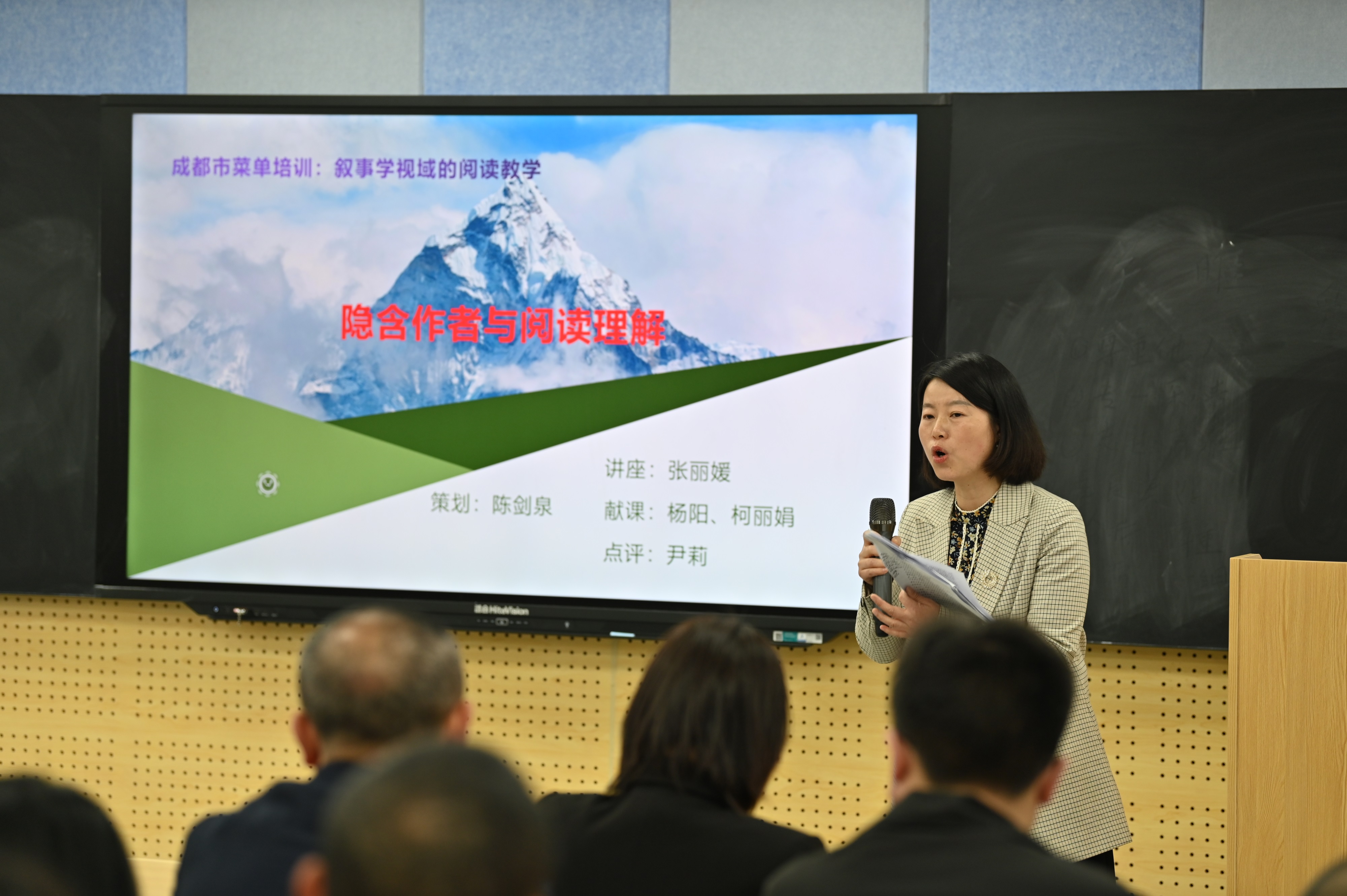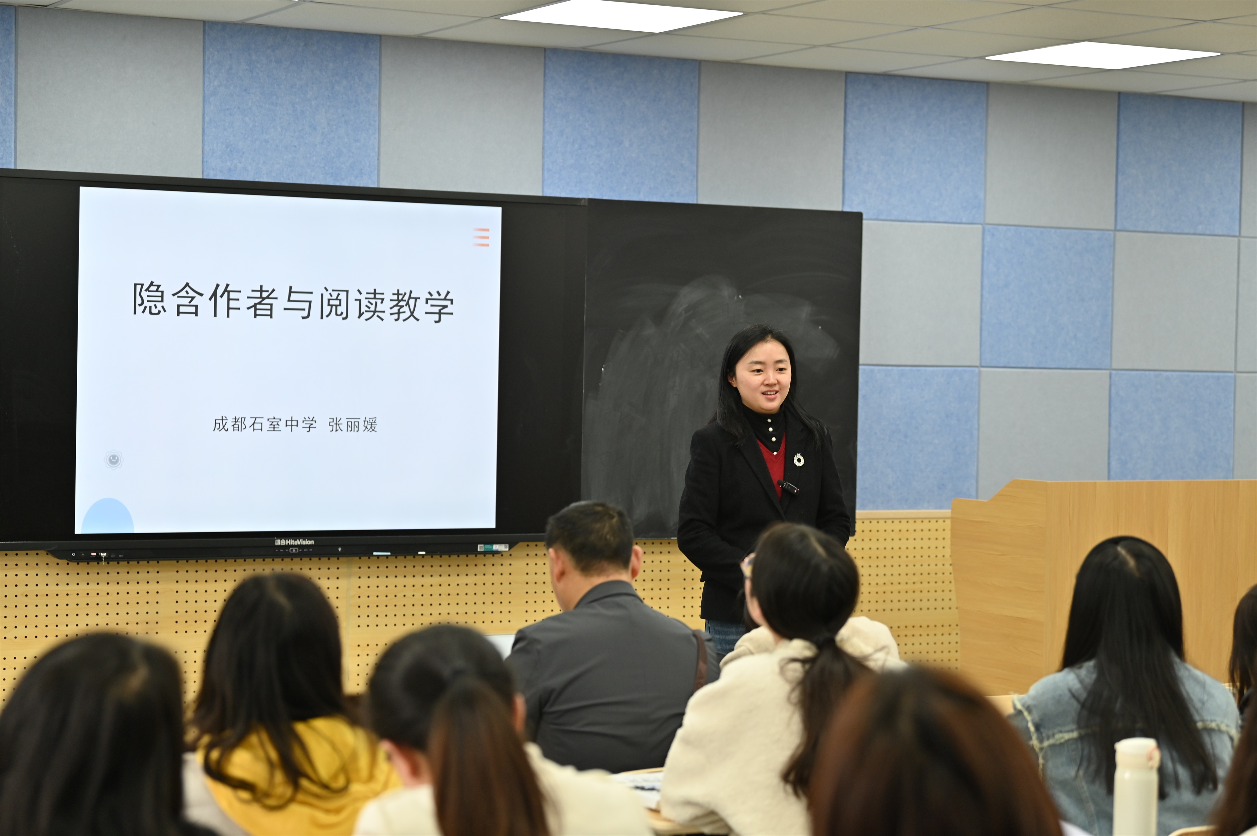 隨后,成都石室中學(xué)(北湖校區(qū))教壇新秀、備課組長張麗媛老師帶來題為《隱含作者與閱讀教學(xué)》的講座,深度剖析“何為隱含作者?”“隱含作者有幾個?”“隱含作者在教學(xué)中的價值”等問題,層層遞進、層層解疑,幫助老師們從理論層面再次深入理解“隱含作者”。