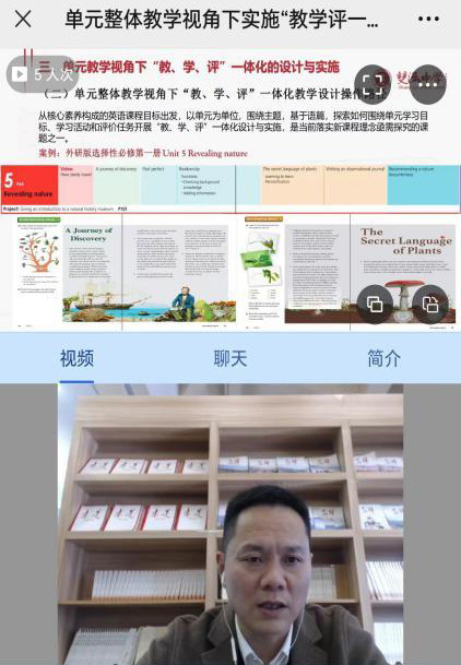 首先,徐天福老師帶來了主題為“單元整體教學視角下實施‘教、學、評’一體化促進思維品質(zhì)的發(fā)展”的專題講座,分析了“教學評一體化”的內(nèi)涵和意義,并以外研社版英語教材選擇性必修一Unit5為例,詳細闡釋了單元教學視角下教學評一體化的設計與實施,為英語一線教師提供了教學評一體化的具體實施路徑。