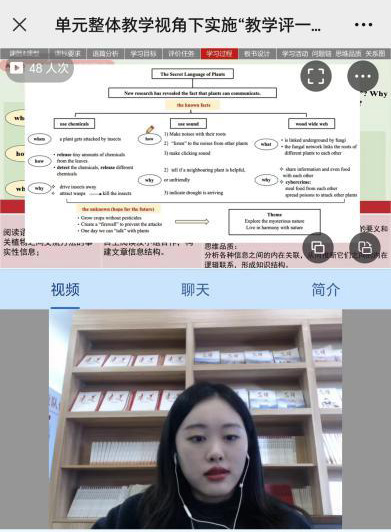 最后,鄧貽之老師呈現(xiàn)了本單元第二篇閱讀語篇The Secret Language of Plants的說課及課堂展示。鄧老師以主題意義探究為核心任務,以層層遞進的問題鏈驅(qū)動學生語言、思維、文化的融合發(fā)展。學生通過一系列具有關聯(lián)性、層次性的活動實現(xiàn)了對語篇信息的梳理整合,了解了植物間的溝通方式,并且提煉出了本課的主題意義,即與自然和諧共處。