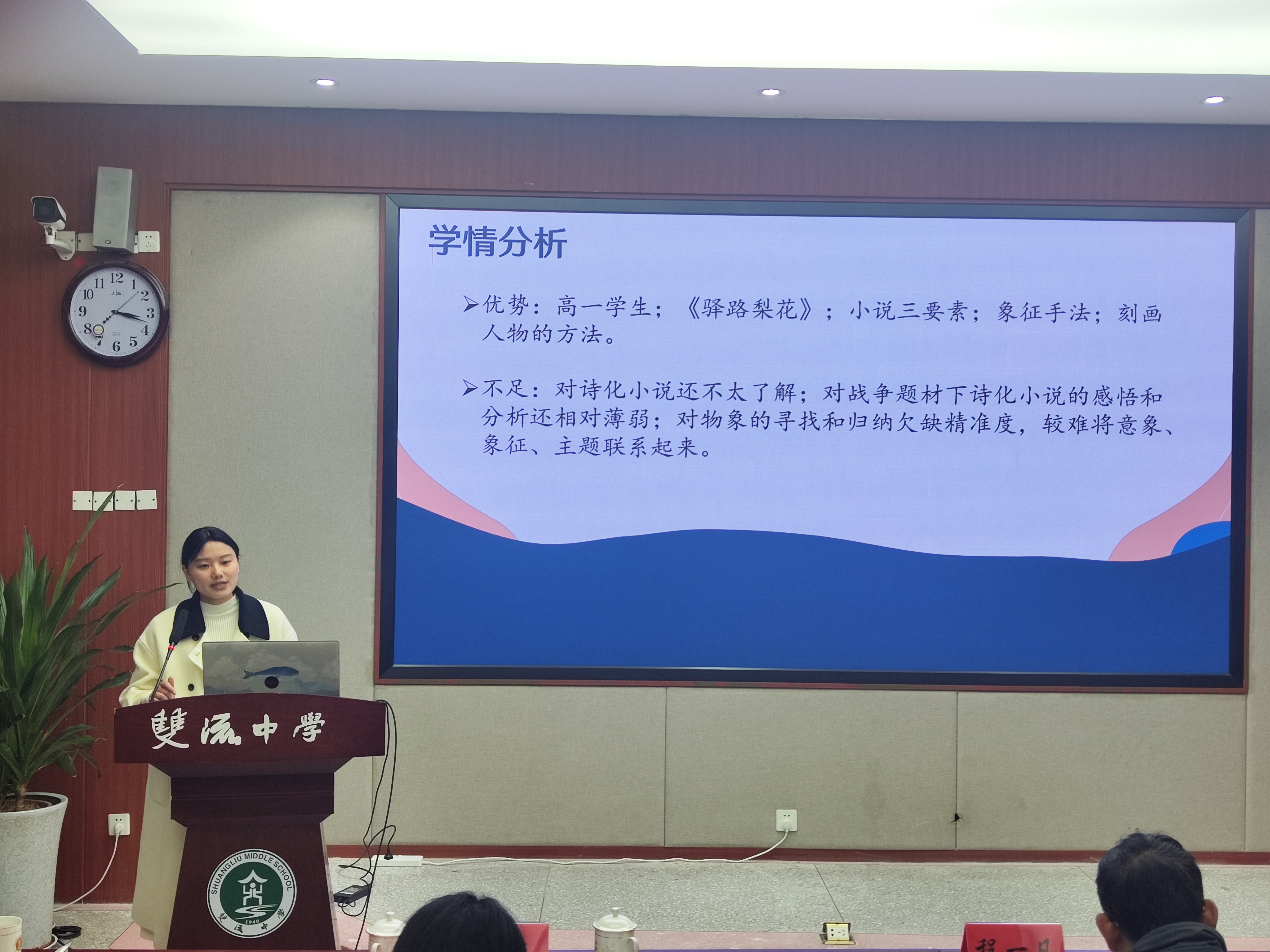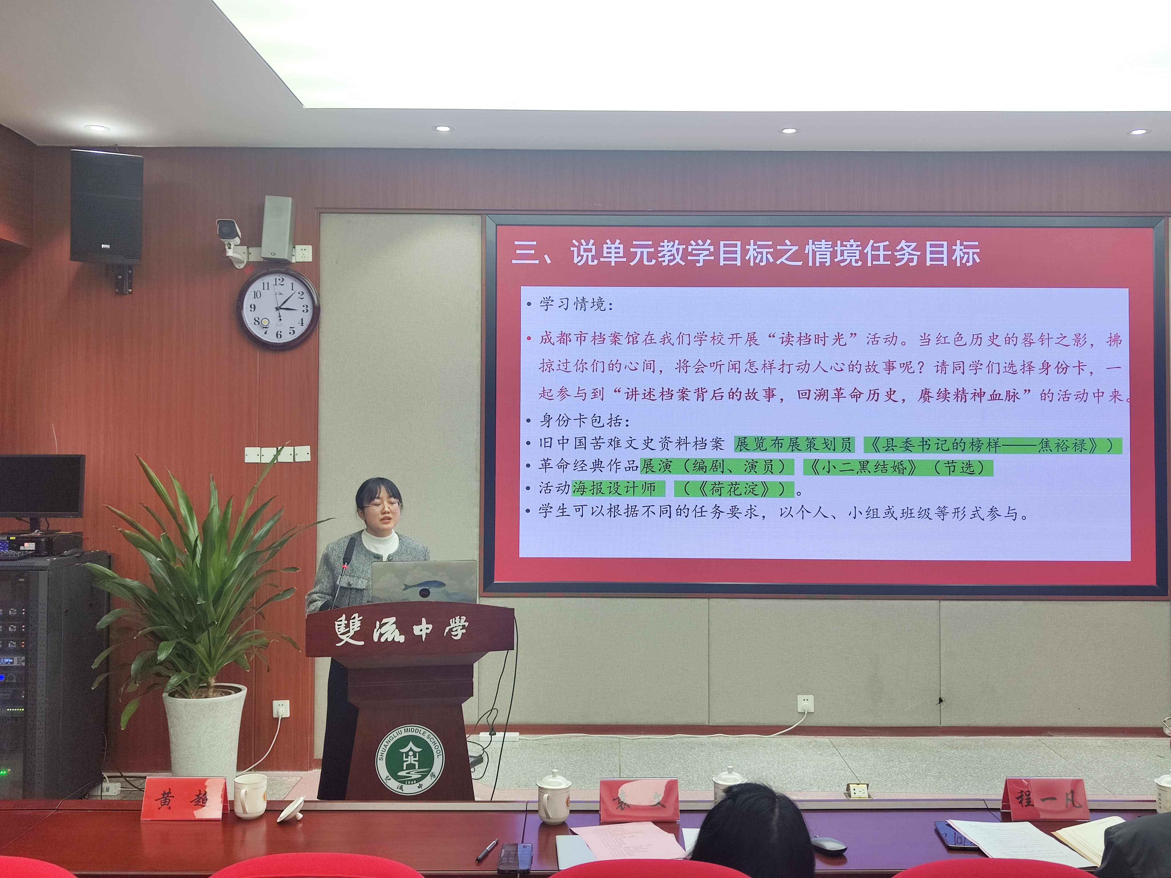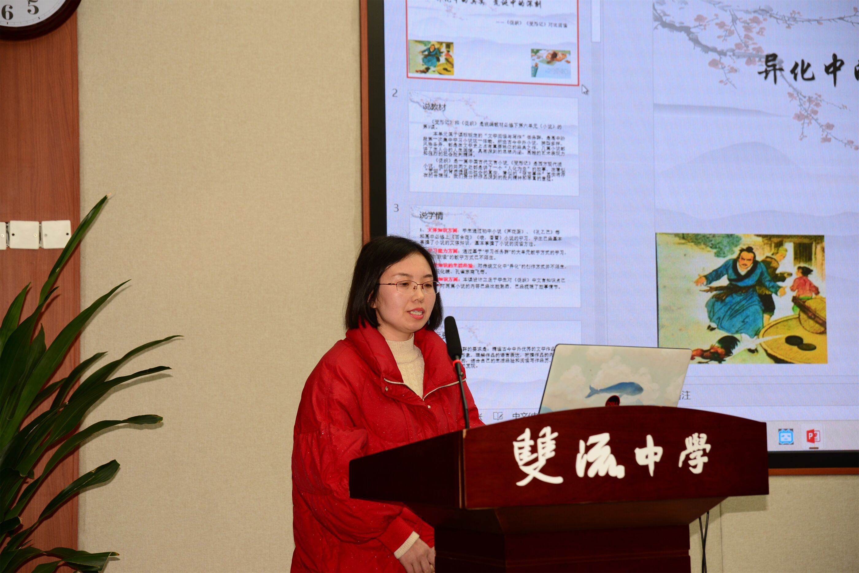 大英中學(xué)唐敏老師以“柔肩擔(dān)重任,巾幗吐芳華”為主題,對比分析《百合花》和《黨費》中“新媳婦”“黃新”兩位女性形象的不同之處,探討人物表現(xiàn)的共同革命精神。