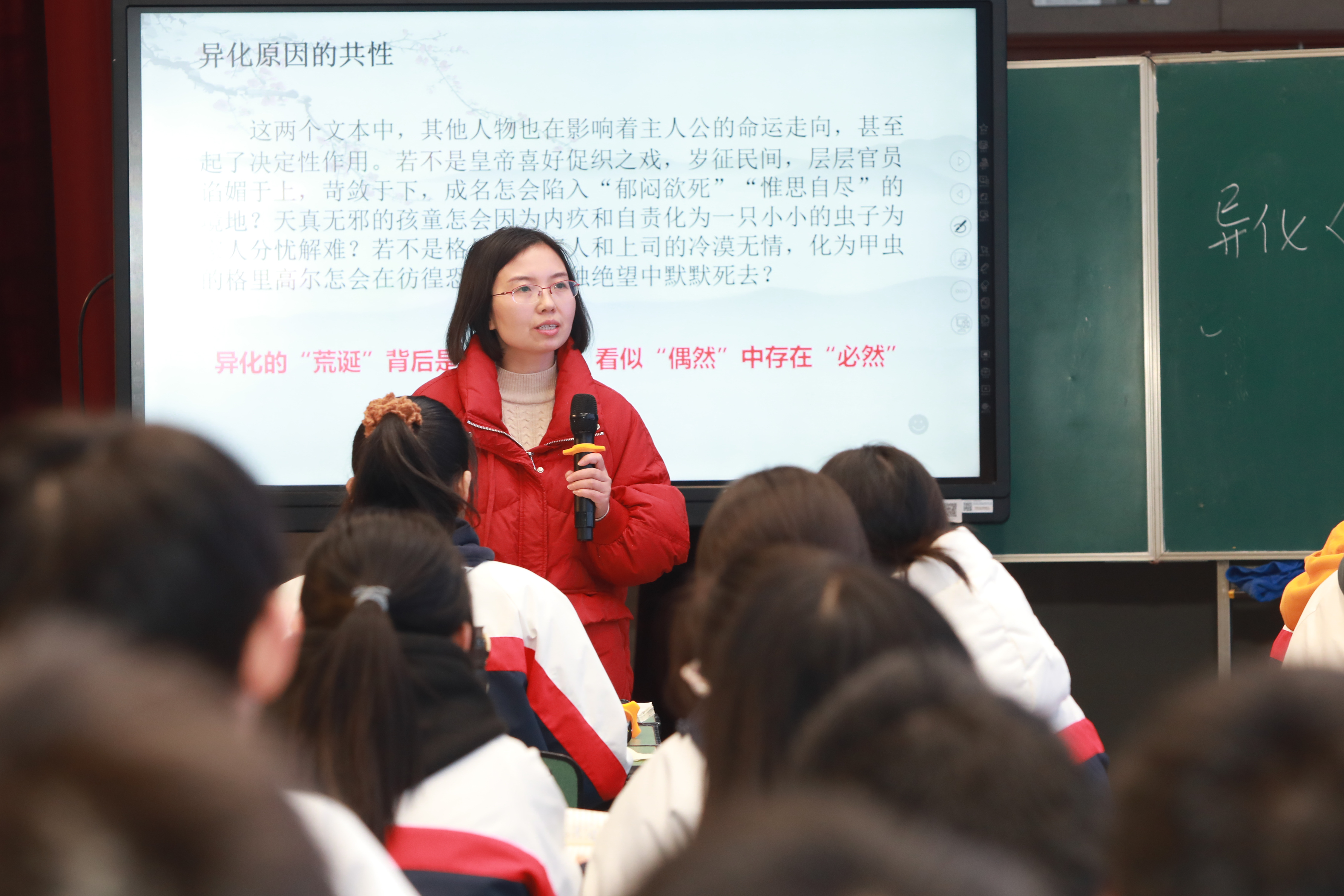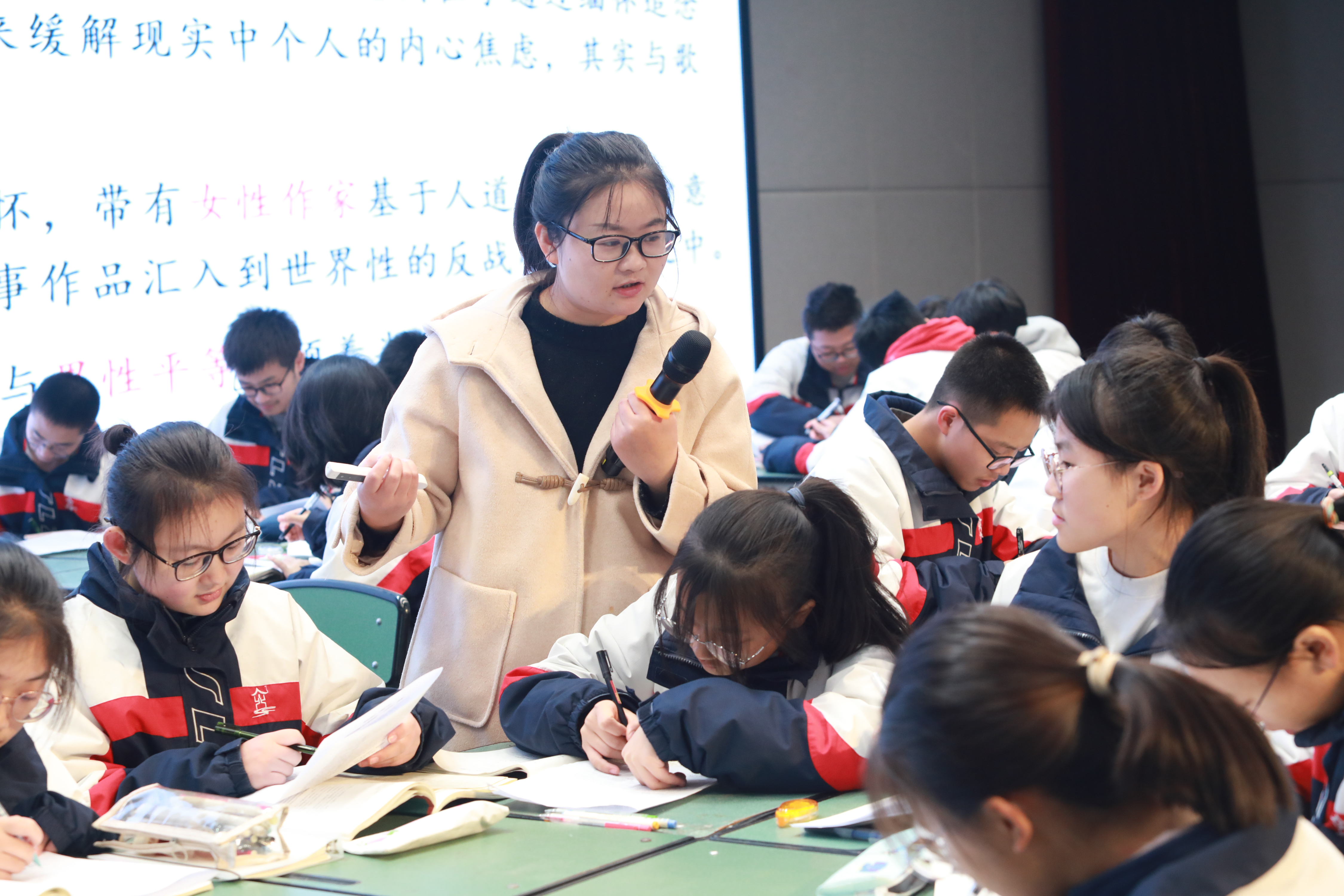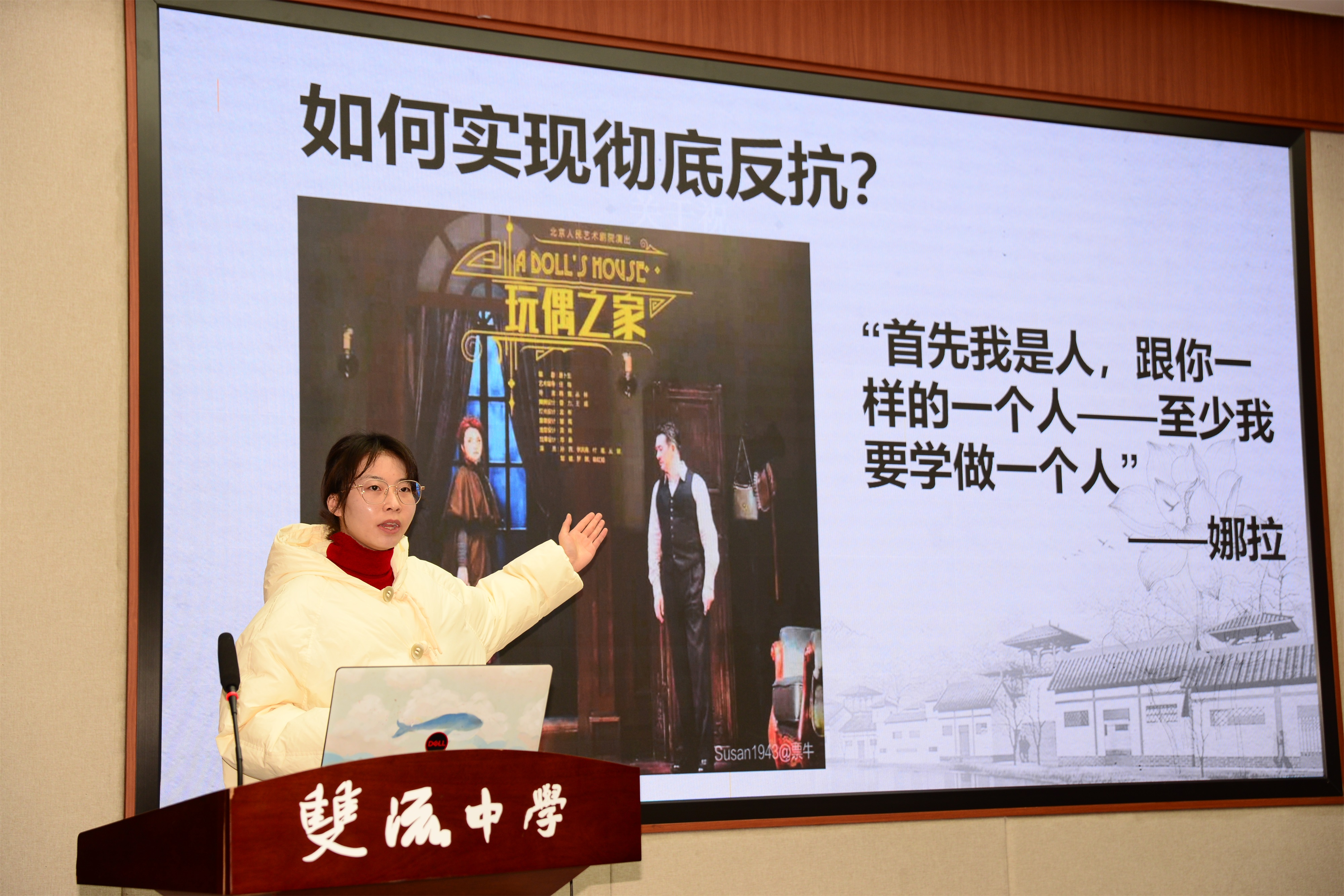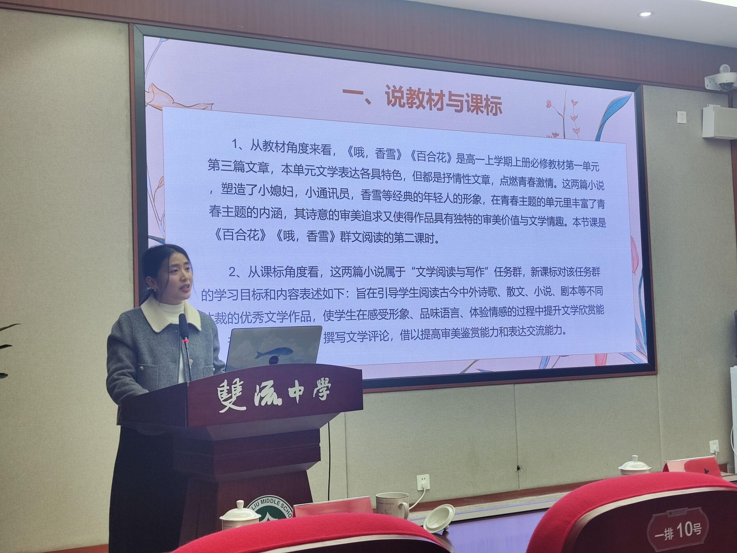 大英中學(xué)唐敏老師以“柔肩擔(dān)重任,巾幗吐芳華”為主題,對比分析《百合花》和《黨費》中“新媳婦”“黃新”兩位女性形象的不同之處,探討人物表現(xiàn)的共同革命精神。
