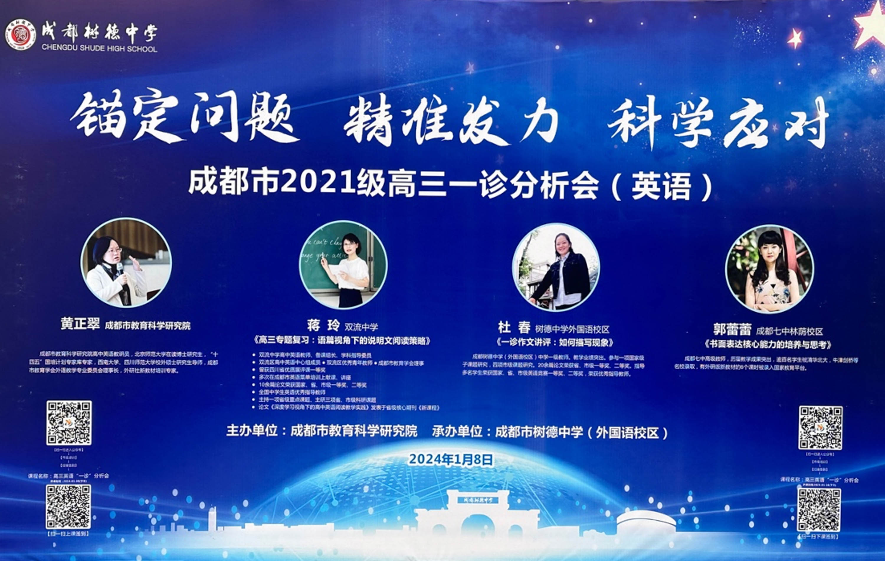 為進(jìn)一步優(yōu)化高三復(fù)習(xí)工作,提升成都市各普通高中高三復(fù)習(xí)備考的針對(duì)性和有效性,2024年1月8日下午,成都市2021級(jí)英語一診分析會(huì)在樹德中學(xué)(外國語校區(qū))如期舉行。全市各區(qū)縣及市直屬學(xué)校的數(shù)百位高中英語教師、教研員匯集一堂,圍繞一診考試情況與高三英語教學(xué)、復(fù)習(xí)工作展開了熱烈的討論與充分的交流。我校高三英語備課組組長蔣玲老師受邀作為雙流區(qū)高中英語代表,與參會(huì)教師交流分享了雙流中學(xué)高三專題復(fù)習(xí)——語篇視角下說明文閱讀能力提升策略。