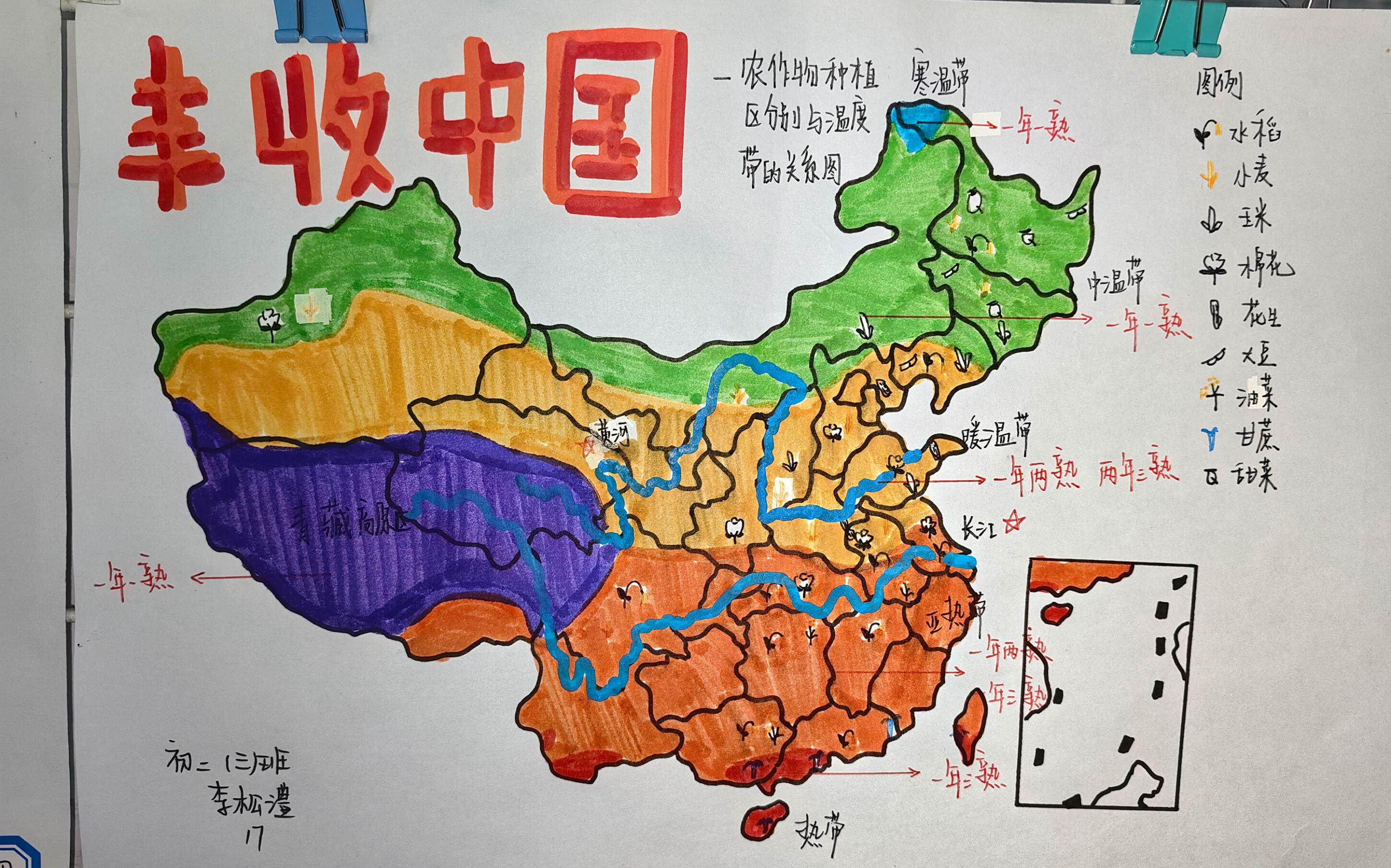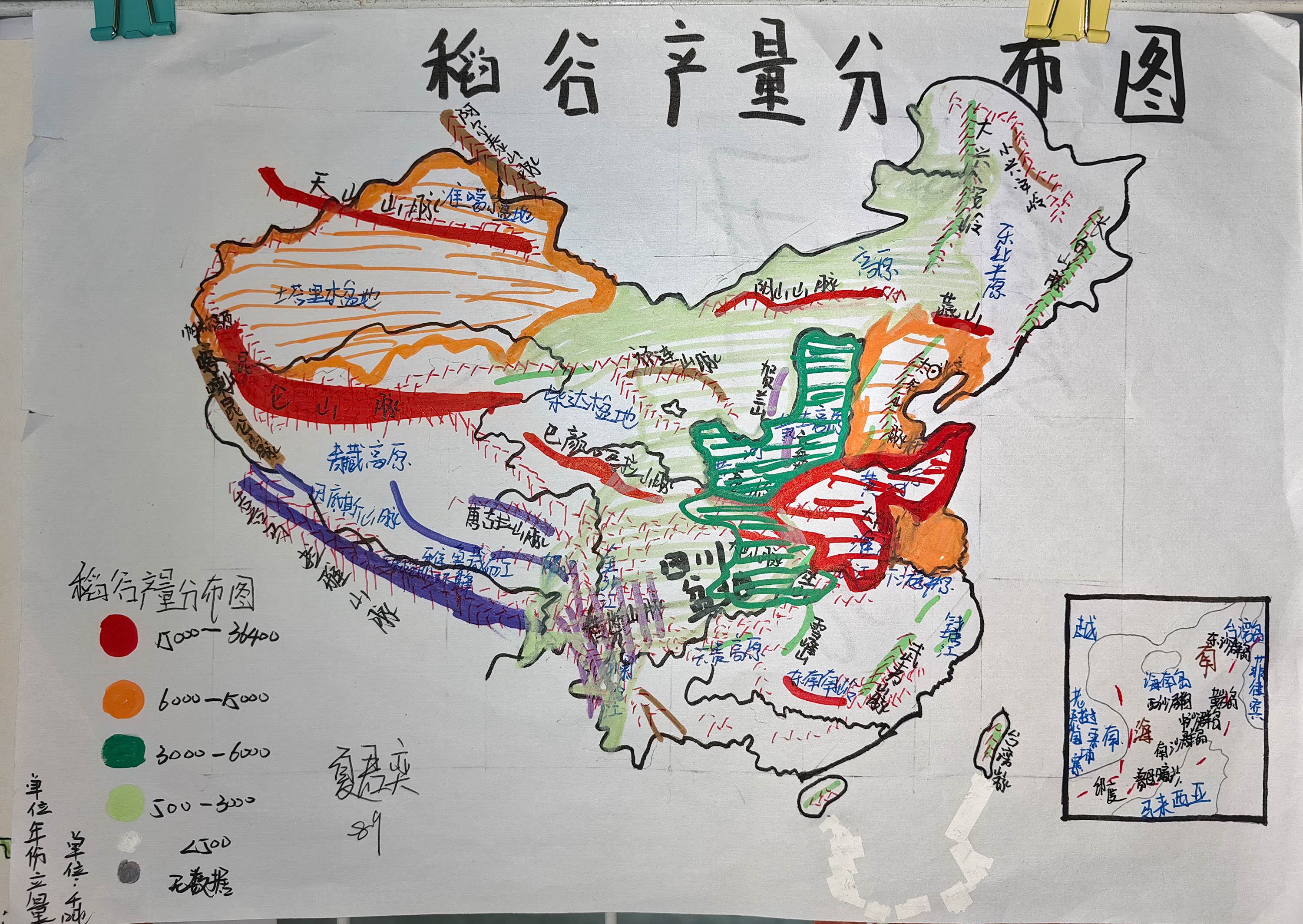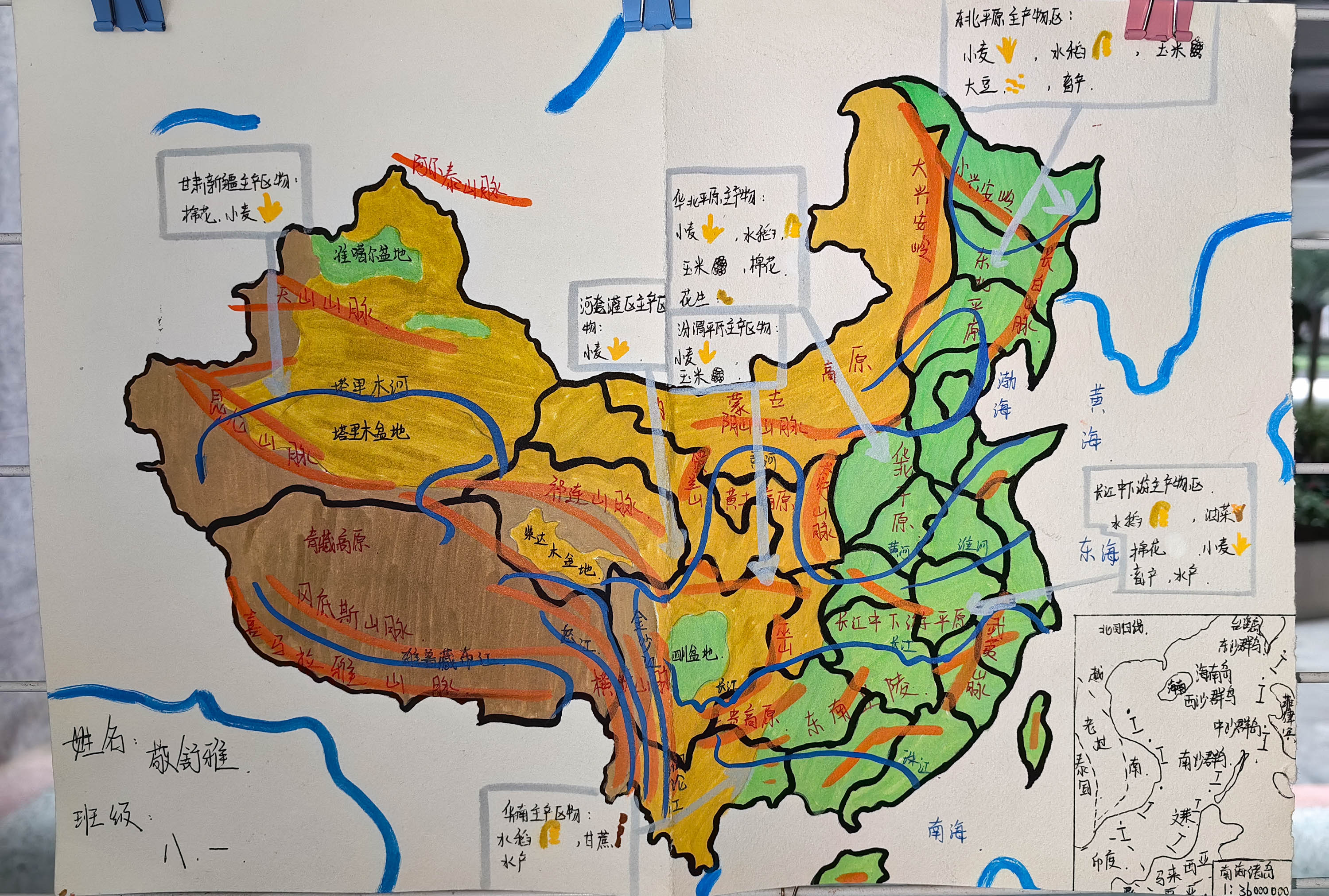 八年級以《秋立不解暑意,萬物醞釀豐收》——繪制中國豐收地圖為主題。通過在熟記中國地形地勢圖的前提下,結(jié)合地形創(chuàng)作中國豐收地圖。