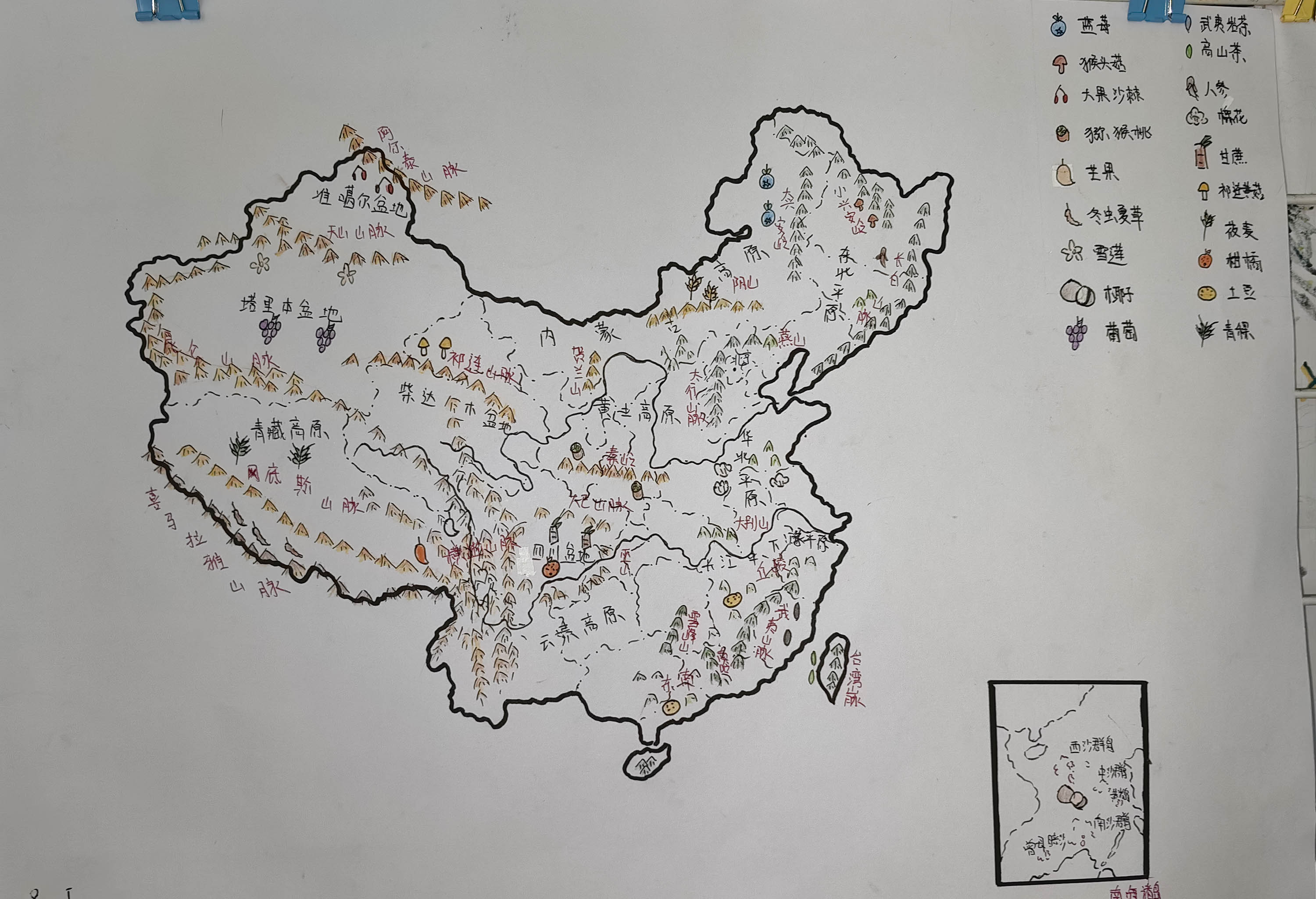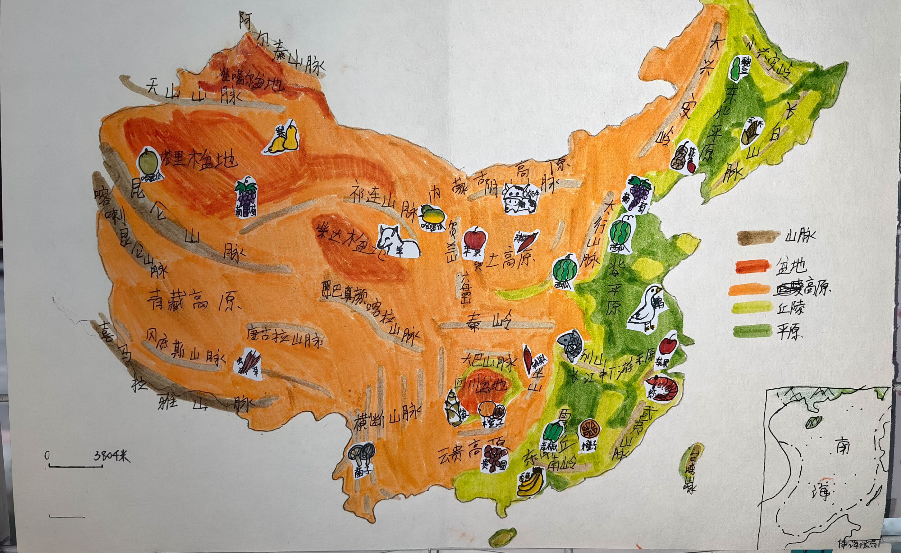 第二步:在此基礎(chǔ)上利用彩筆繪制各大地形區(qū)及山脈的特色農(nóng)產(chǎn)品。進行基于地理學科素養(yǎng)培養(yǎng)的學習任務(wù)展示。