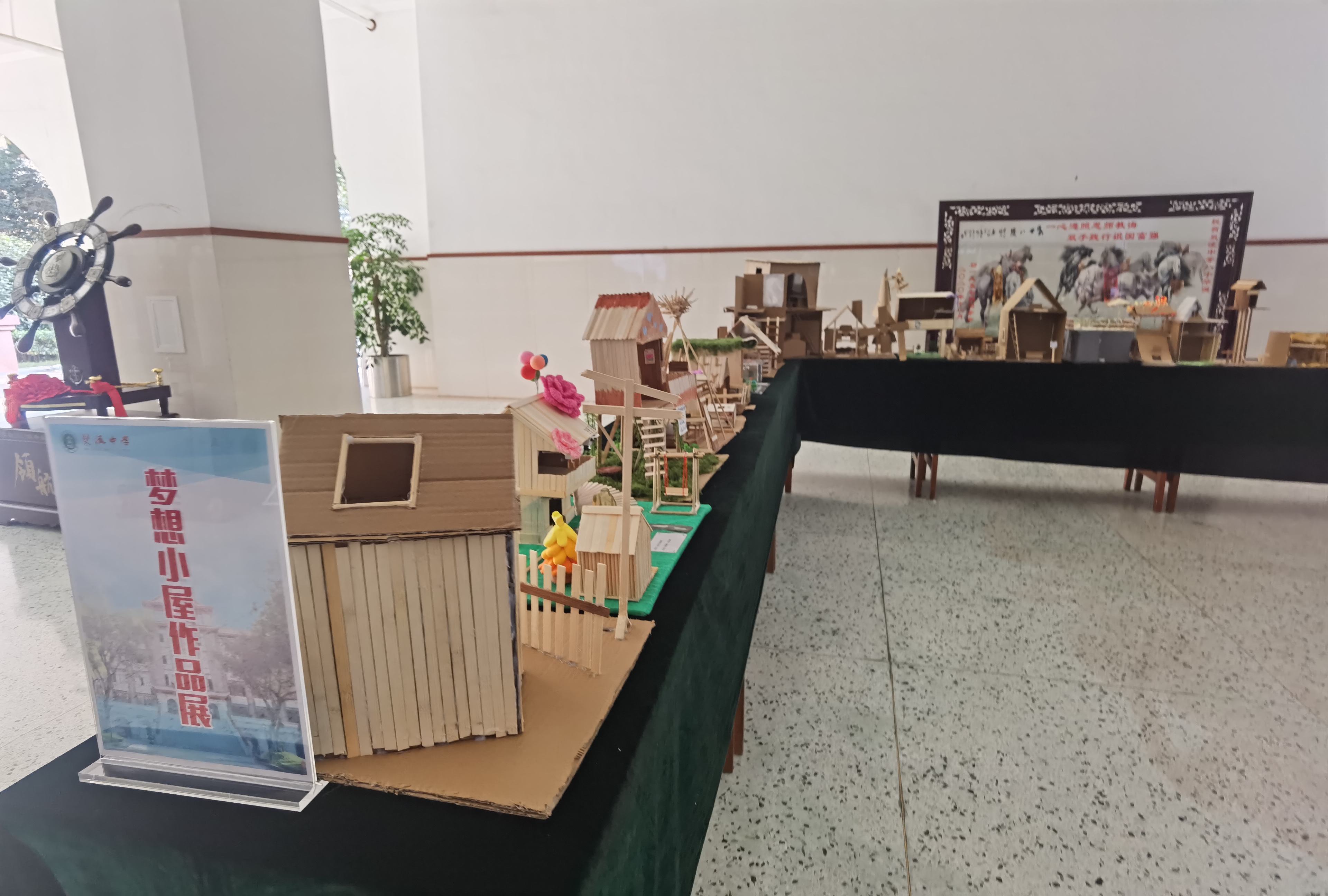 在夢想小屋展區(qū),同學(xué)們用豐富的想象力和精湛的手工技藝構(gòu)建了心目中的理想家園。利用網(wǎng)楞紙、雪糕棒、木工板、粘土等材料,學(xué)生們精心打造了一座座獨具特色且功能完備的房屋模型。此過程不僅促進(jìn)了理論知識與實際操作的結(jié)合,更體現(xiàn)了知行合一的教學(xué)宗旨。