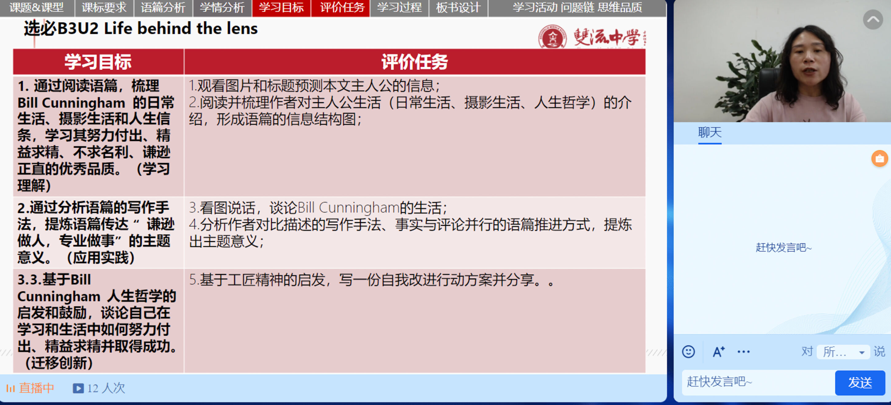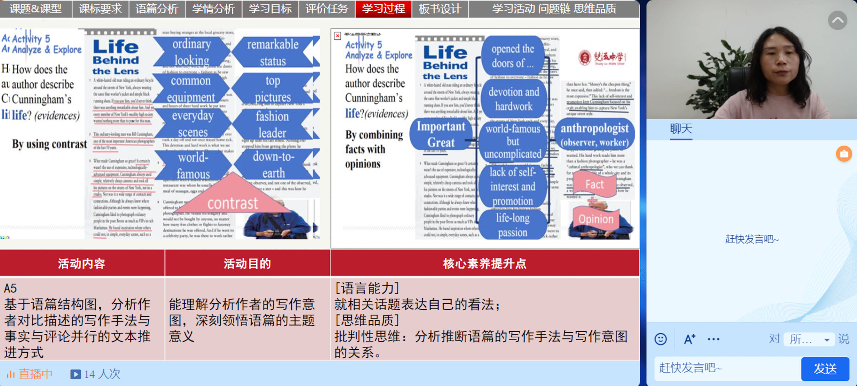 劉利勤老師在解讀語(yǔ)篇《Life Behind the Lens》時(shí)分析了文章的結(jié)構(gòu)、寫作技巧和文化內(nèi)涵,引導(dǎo)學(xué)生通過(guò)批判性思維分析文本的深層含義,探討攝影與社會(huì)文化的關(guān)系,突出了故事主角Bill Cunningham的平凡、奉獻(xiàn)、真誠(chéng)、激情等工匠精神,感悟語(yǔ)篇“平凡而偉大”的主題。劉老師在課堂中通過(guò)師生互動(dòng)和小組合作環(huán)節(jié),引導(dǎo)學(xué)生批判性地分析Bill Cunningham的生活哲學(xué)與工匠精神,將批判性思維融入到主題意義的探討中,有效提升學(xué)生的語(yǔ)言能力與思維品質(zhì)。