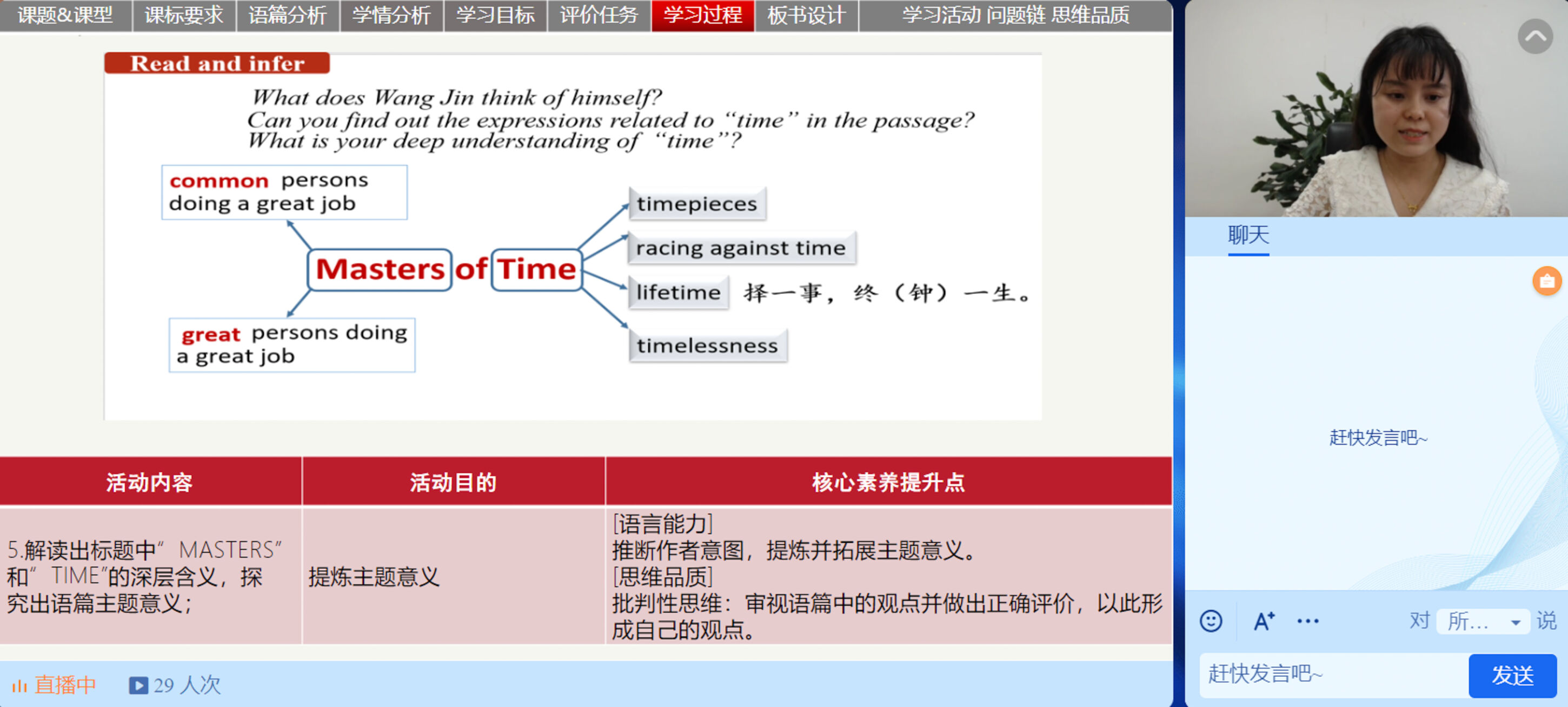 羅芳梅老師認(rèn)為語(yǔ)篇《Masters of Time》通過(guò)講述故宮博物院鐘表修復(fù)師王津日復(fù)一日修復(fù)鐘表文物的事跡凸顯了人物的工匠精神。在課堂教學(xué)中引導(dǎo)學(xué)生開(kāi)展小組活動(dòng),歸納概括王津和學(xué)生修表的原因、遇到的挑戰(zhàn)、成就和工作態(tài)度,判斷評(píng)價(jià)人物所具有的工匠精神,感悟語(yǔ)篇主題——擇一事,終(鐘)一生,提升學(xué)生的文化理解力和批判性思維能力。