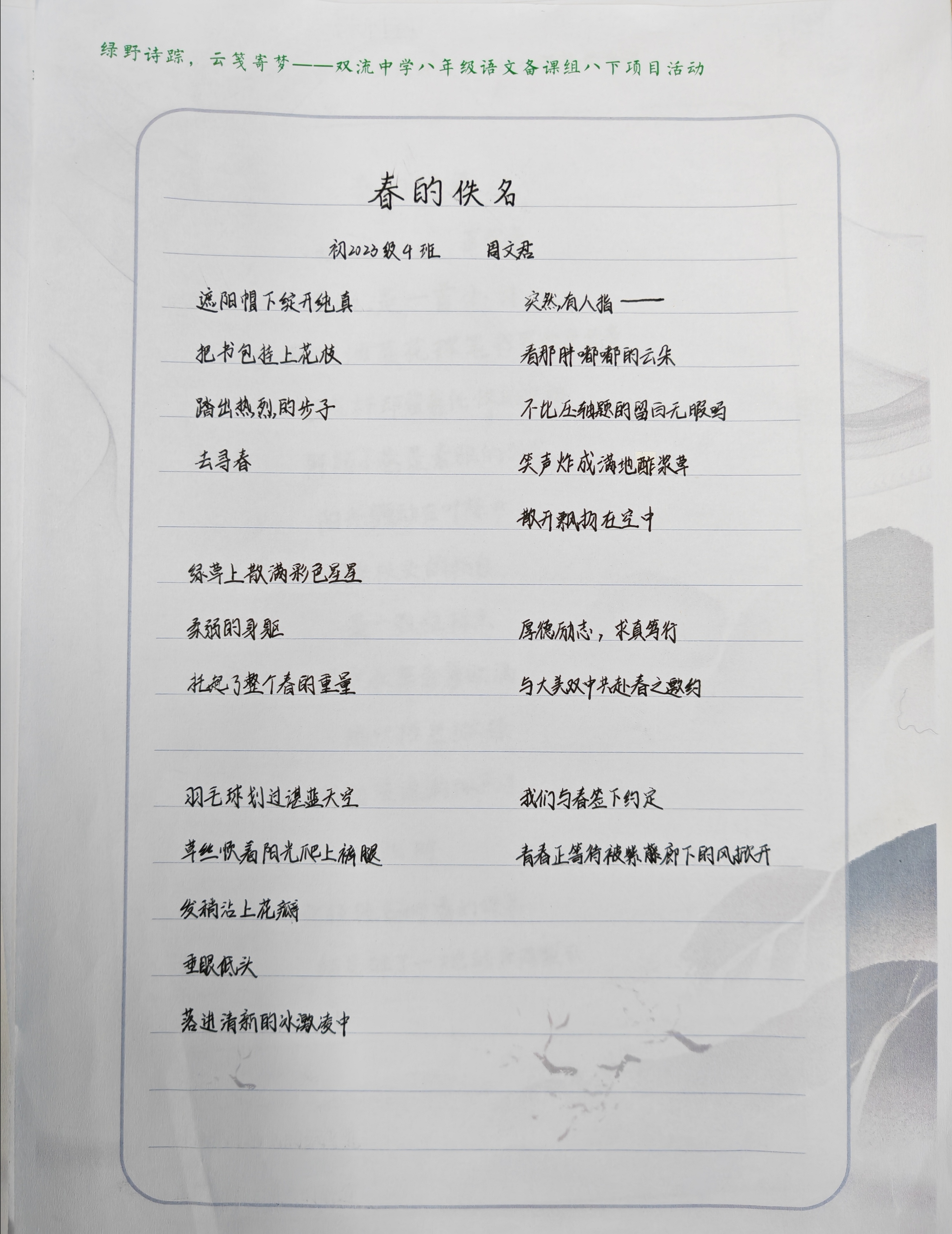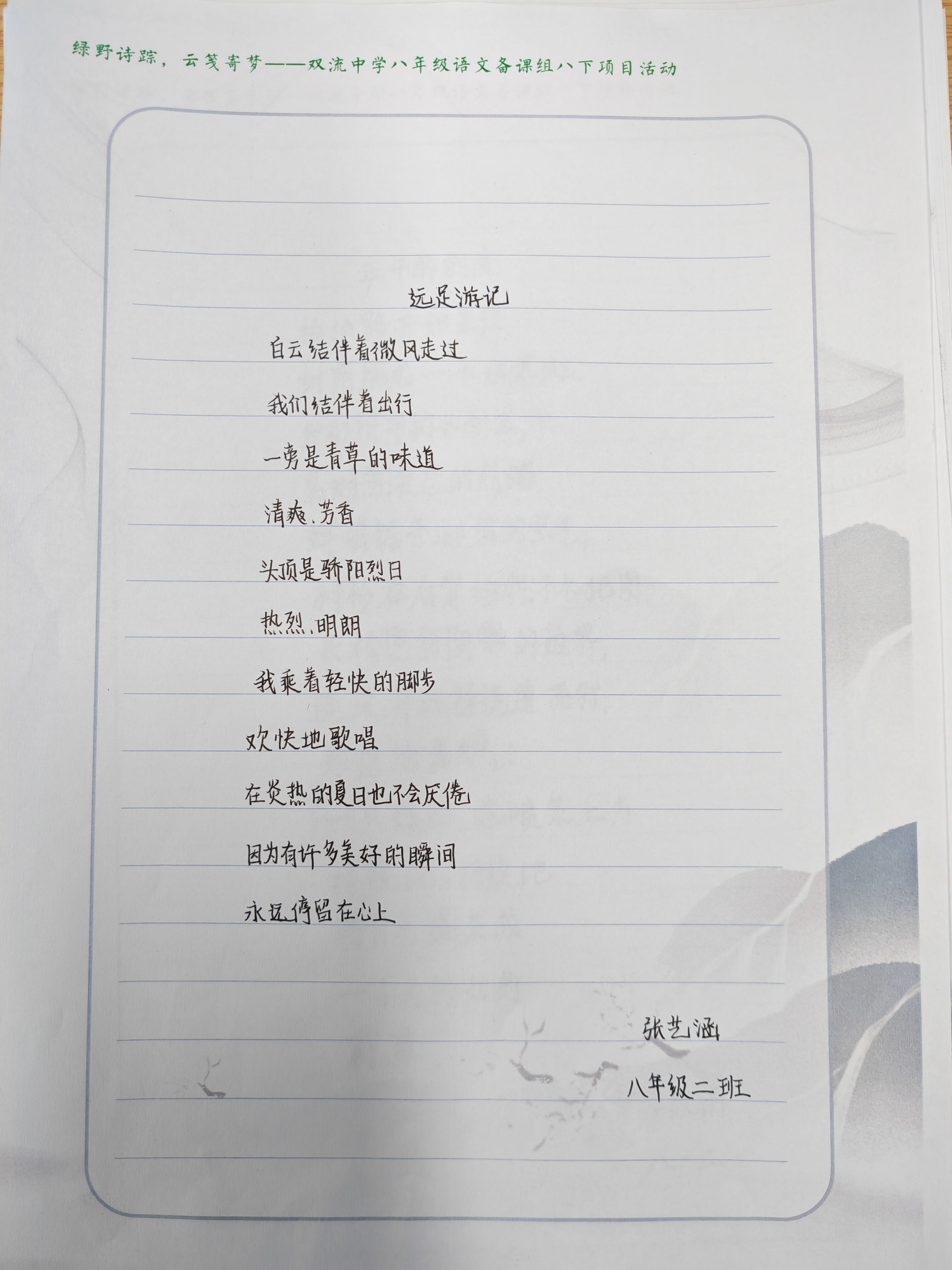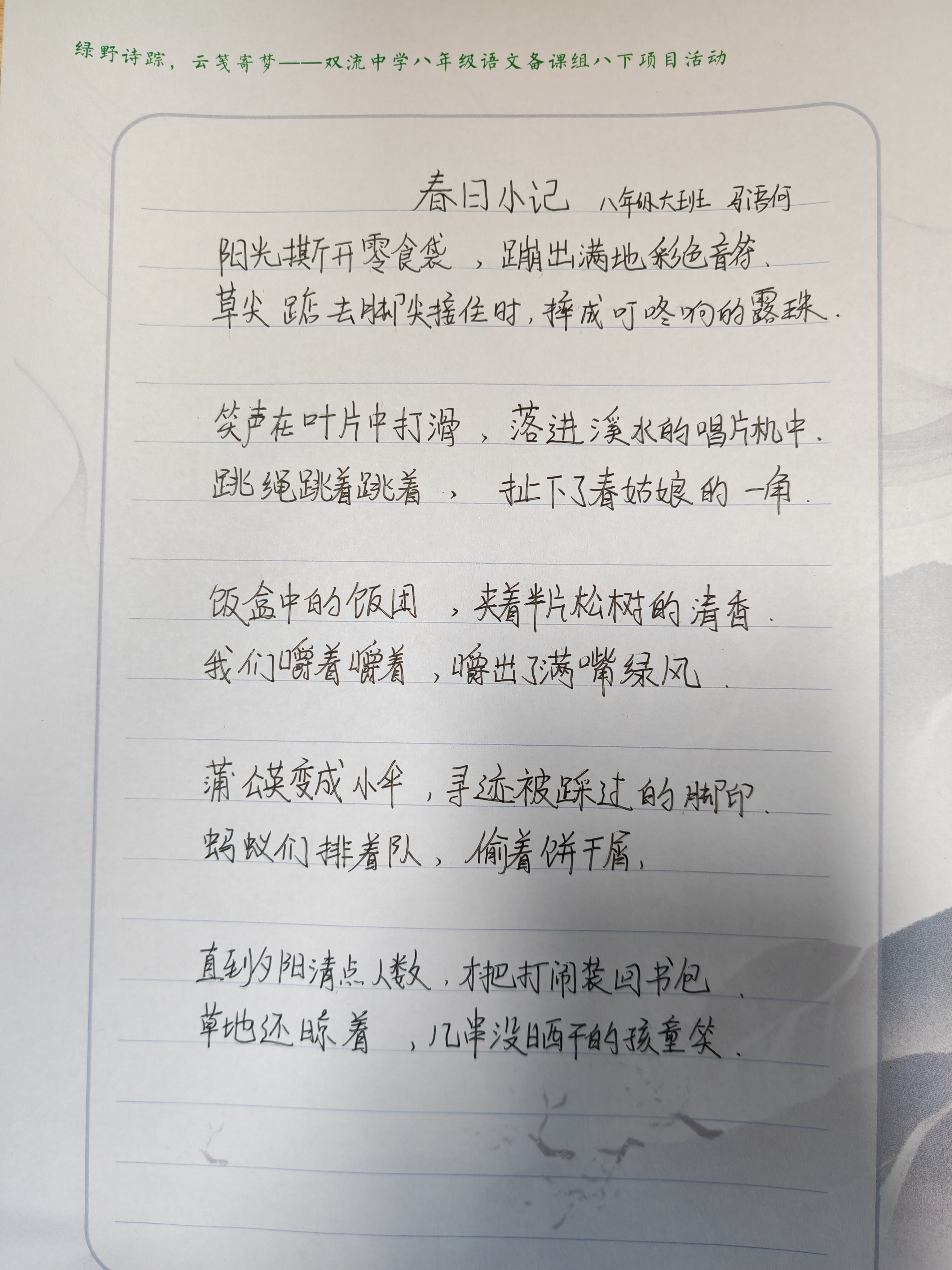 春風(fēng)輕拂,楊柳依依,雙流中學(xué)八年級(jí)學(xué)生迎來(lái)了一年一度的春游活動(dòng)。在盡情享受自然美好與歡樂(lè)時(shí)光后,八年級(jí)語(yǔ)文備課組組織了一場(chǎng)以“綠野詩(shī)蹤,云箋寄夢(mèng)”為主題的小詩(shī)創(chuàng)作活動(dòng)。